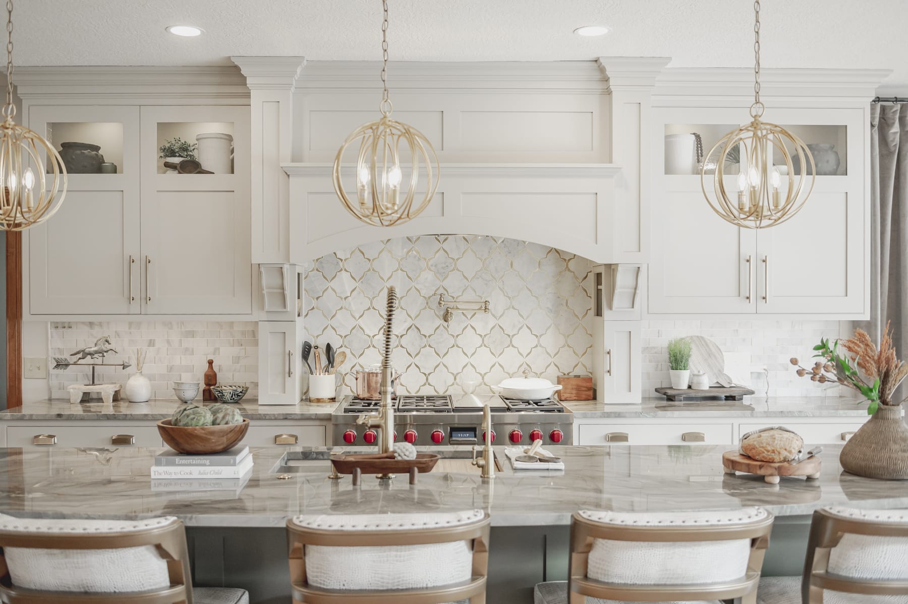Holly says, “One of my favorite 2024 timeless trends is the countertop being utilized for the full height backsplash. I love how this gives the design a seamless look and my clients love this feature for cleanability. It emphasizes the beauty and movement throughout the stone countertop by bringing the design up vertically. When working with the fabricator, we work our best to match up veining characteristics to highlight all the details.”