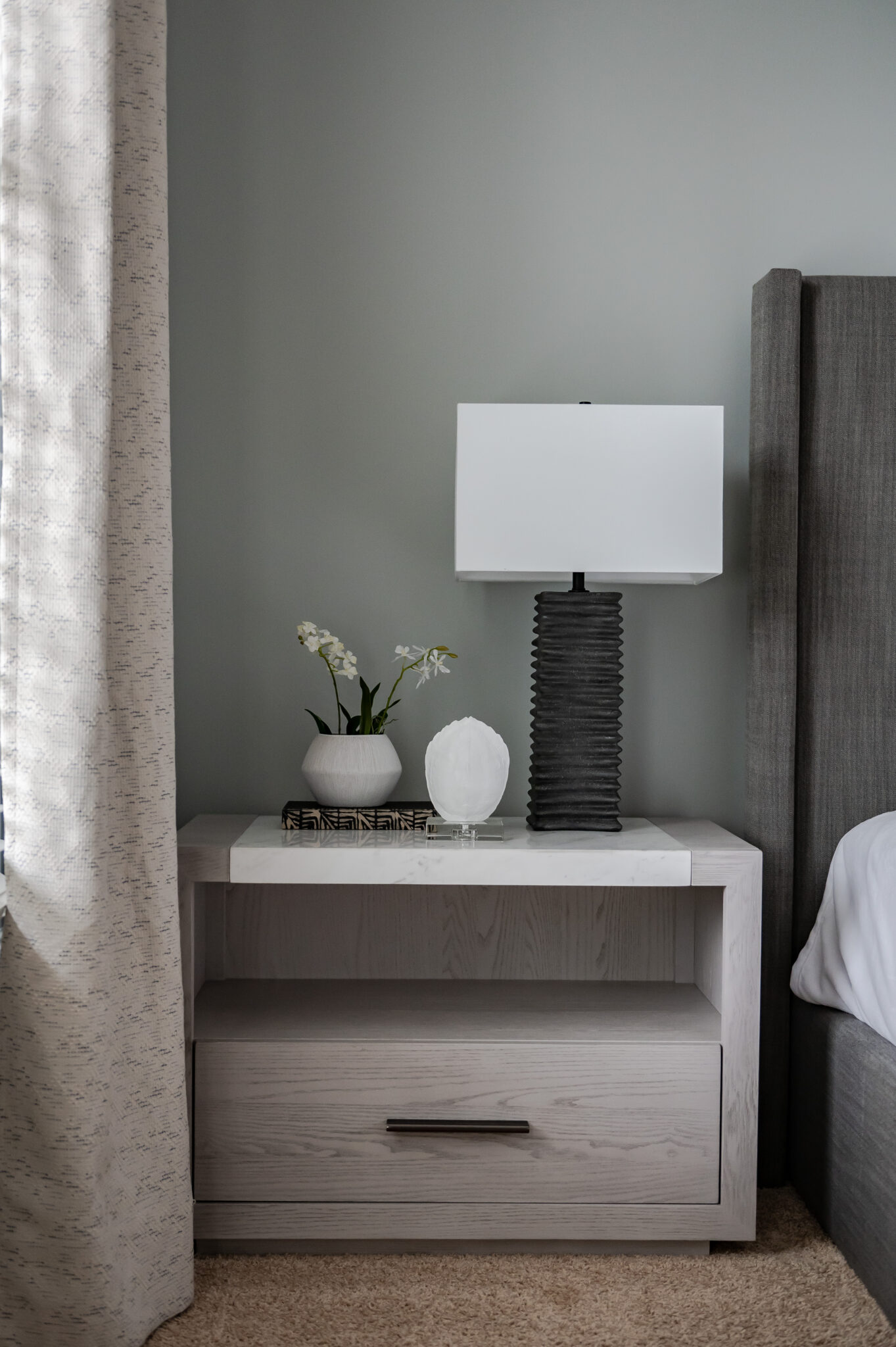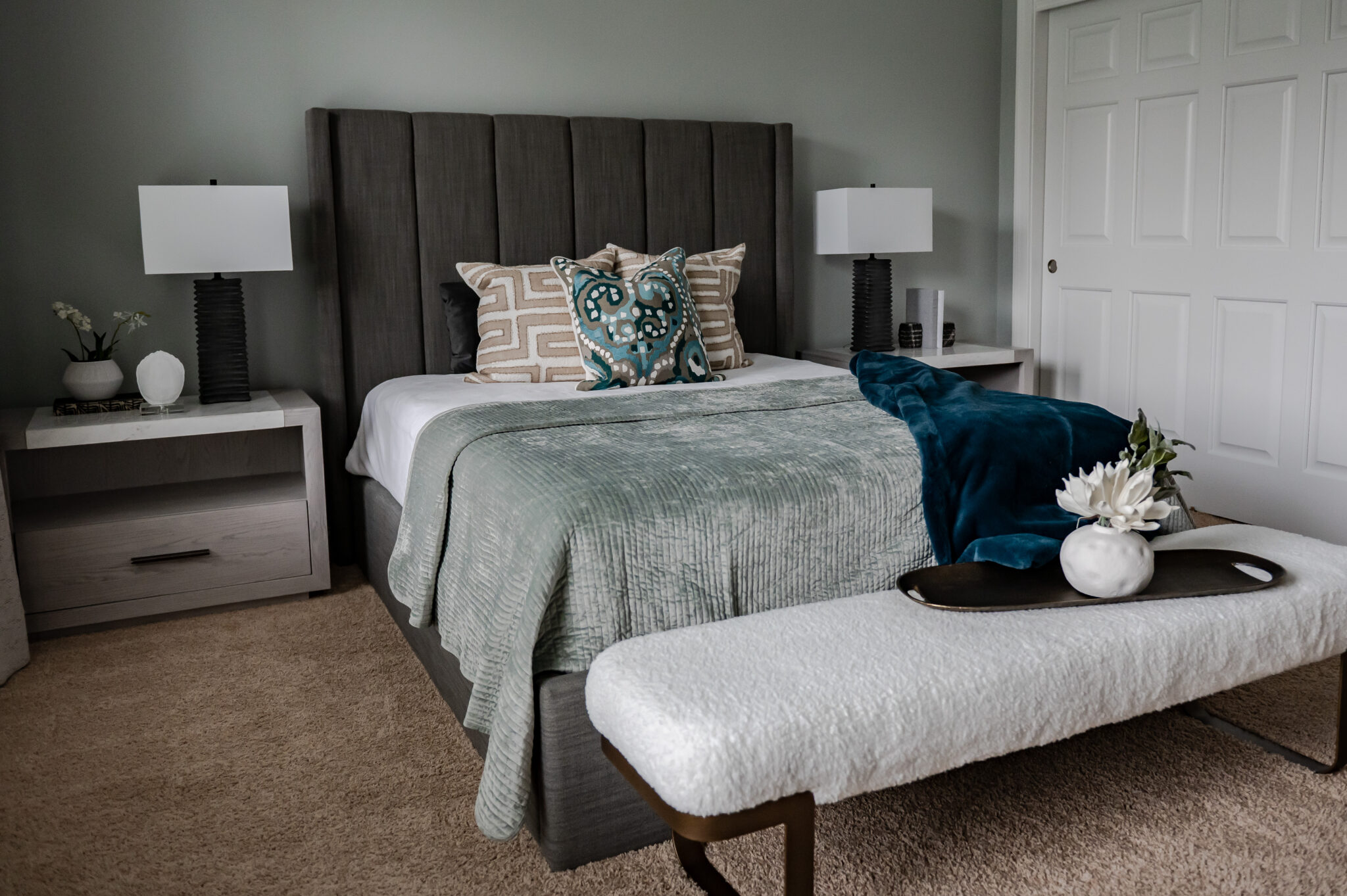 Texture is also a wonderful accent or detail to add character to a space, whether it be window treatments, a fun rug that fits your personality, a textured throw blanket, or in the small accessories. You’d be surprised how much texture can add to a space and can often be an overlooked detail, causing your space to feel flat. Holly says, “Balancing mixes of wood, metal, glass, and stone textures is my favorite!” They can give a space that final touch it needs to feel uniquely you and allows you to experience the space. Holly features a mix of textures that turned this bedroom into an oasis of comfort.