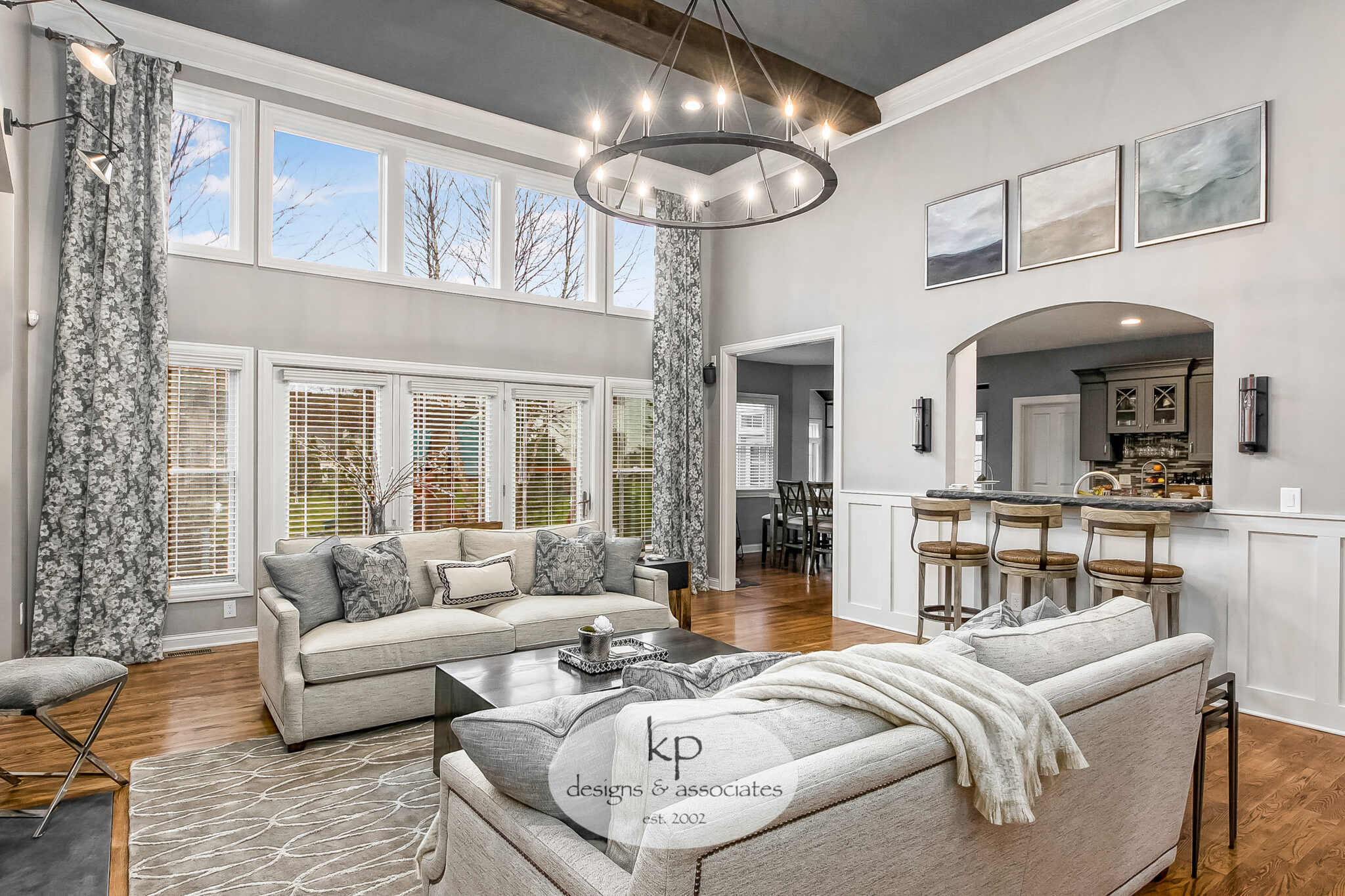 Holly shares one of her favorite ways to introduce color is to add specialized art and apply color to the ceiling as it creates a huge impact. She added neutral navy to her client’s Great Room ceiling to boost character. She also painted a custom series for her client, incorporating the colors of the room.