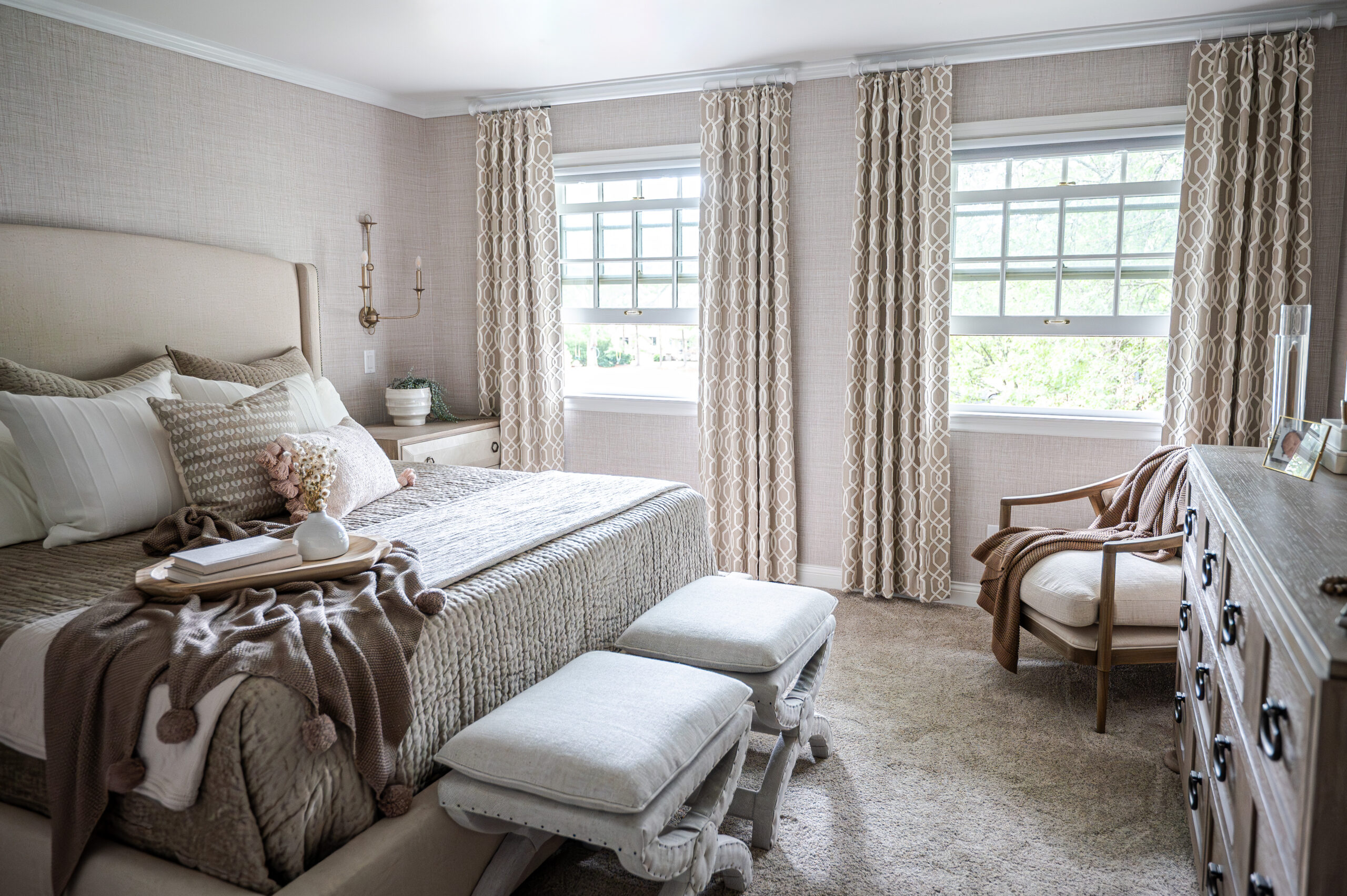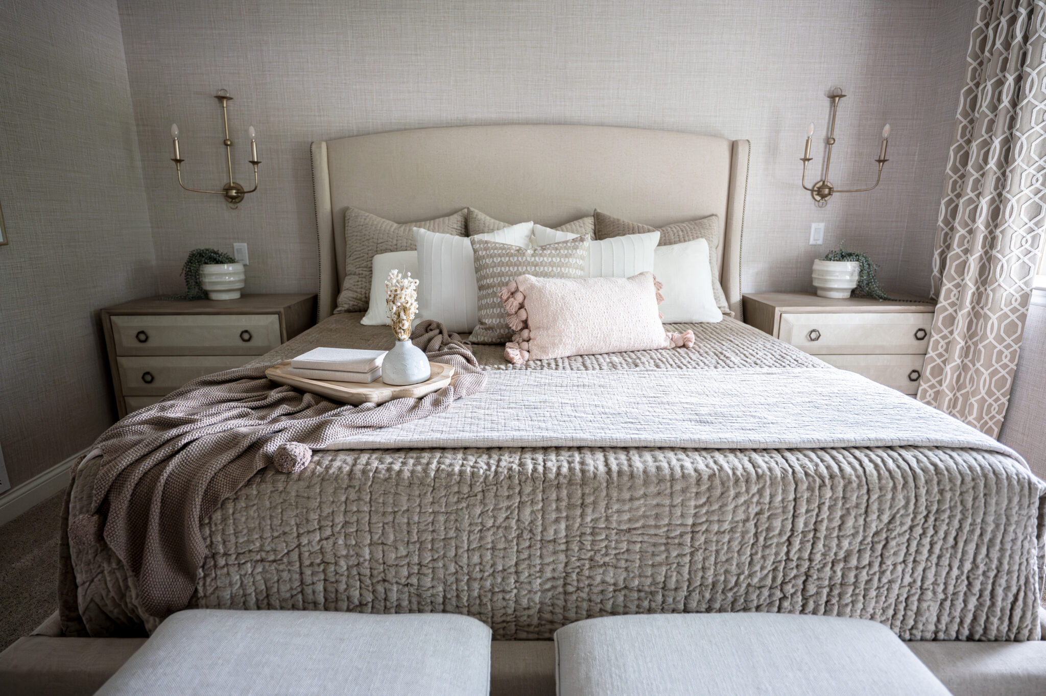 This primary bedroom is a showcase of texture and timeless comfort which would make any homeowner want to stay in bed all day. The color palette highlights a soft blend of neutrals with a touch of blush and gold. Michelle added an abundance of surface interest and layers to the room using textured wallpaper, plush bedding, slub yarn linens, embroidered window treatments, and leather accents. Silver leaf and gold accents are paired with natural wood tones for a cozy elegance.