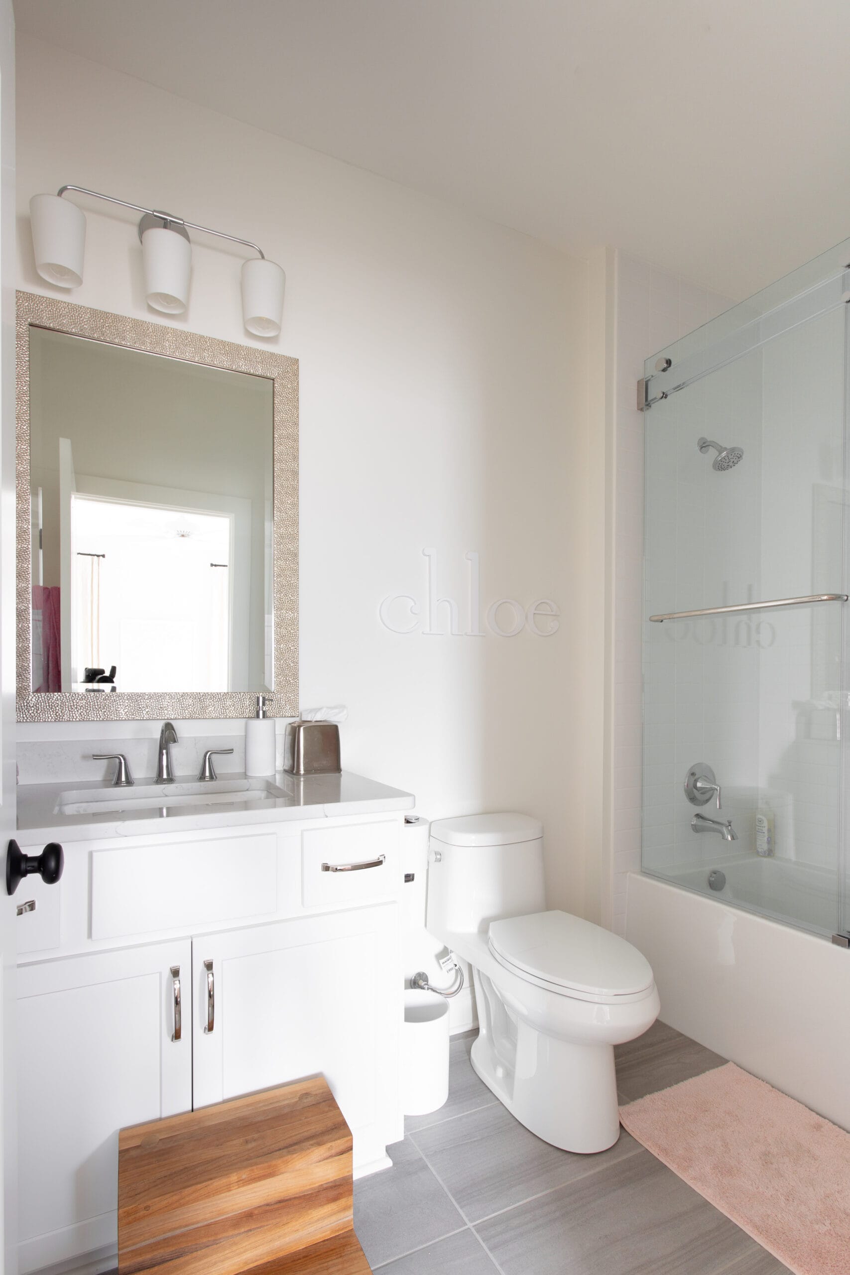 This client’s home was a new build designed by Celeste. This room was decorated for the client’s 3-year-old daughter who wanted a very girly room in pinks and lavenders, while her parents wanted to have a room that could grow with their daughter. The oversized flower wallpaper added the femininity in the room while also being dramatic and not age-specific. Celeste kept the rest of the room décor minimalist, but added beautiful pillows and wall décor to compliment the floral wallpaper. She intentionally designed the adjacent bathroom to be sophisticated and clean with a few pink touches that could be switched out as the daughter grows older.