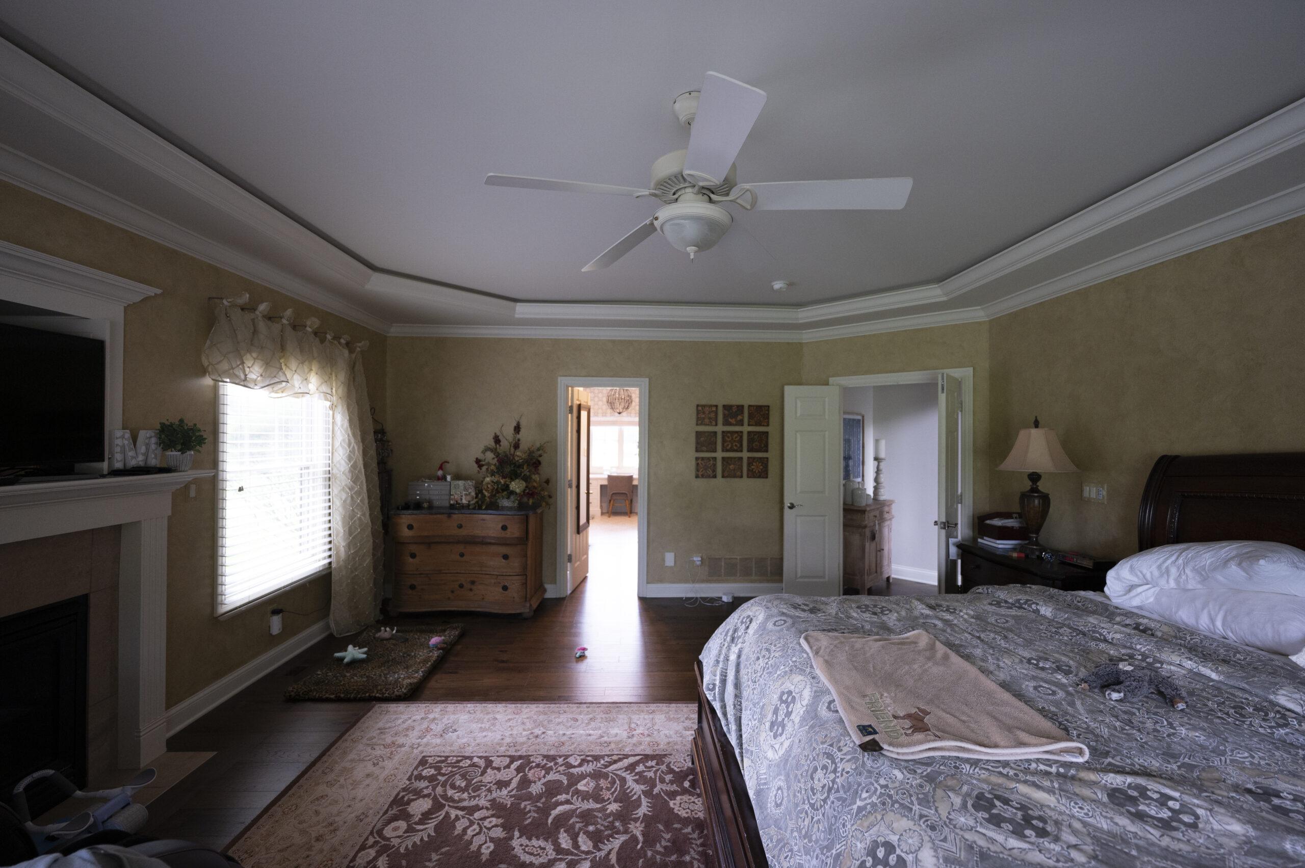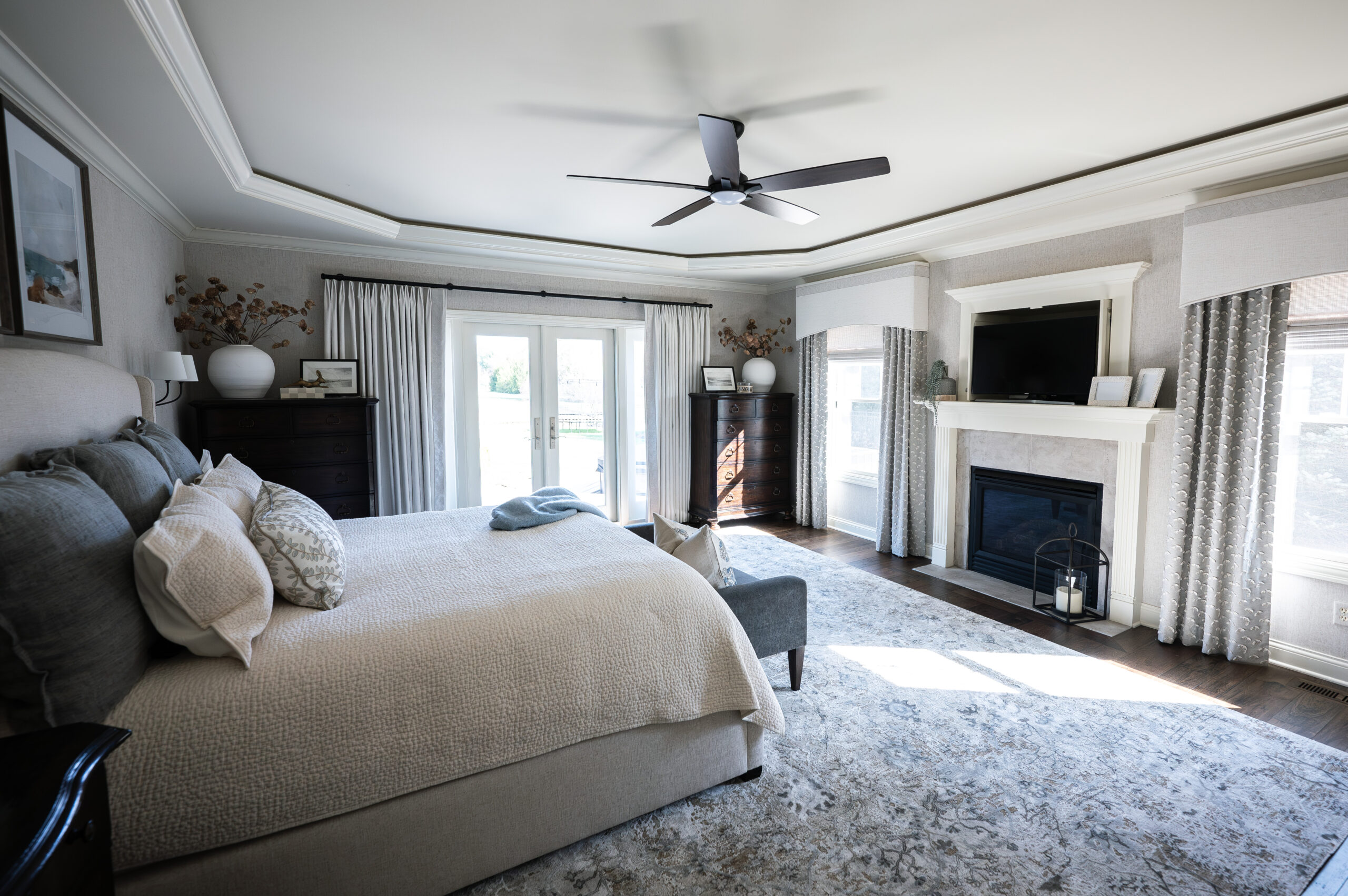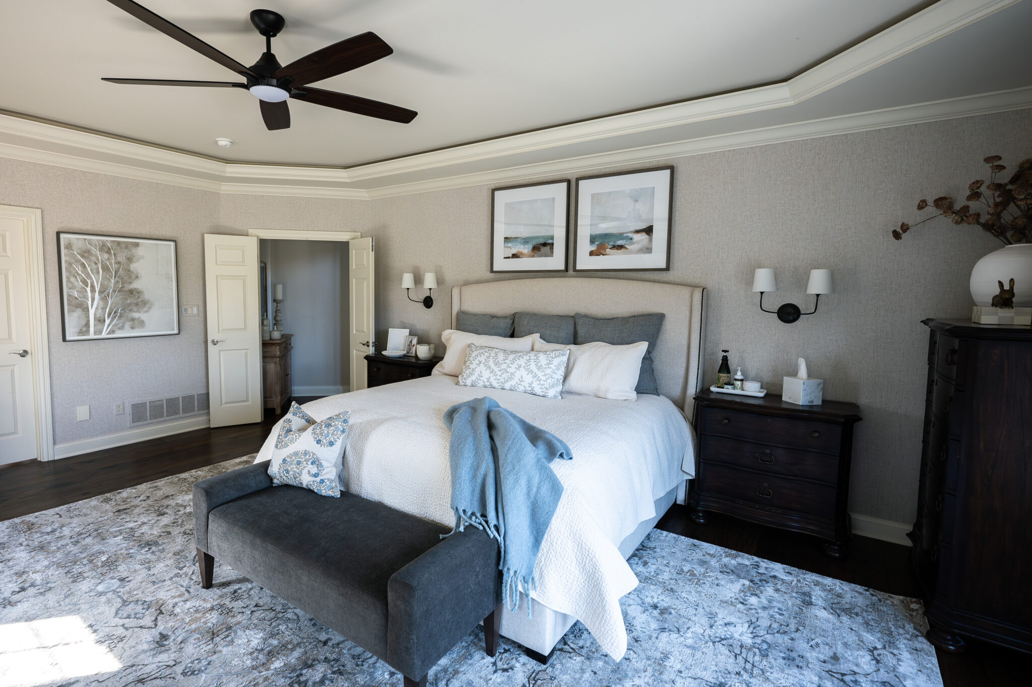 This client had recently renovated their primary bathroom with us in which Celeste created a serene spa space. They then asked Celeste to update the primary bedroom to compliment the bathroom with a similar open and airy feel. The client wanted to repurpose their dark dressers and nightstands, so Celeste intentionally added light colored drapes, a rug, art and accessories to contrast those pieces and to give a more airy feeling overall. She carefully blended the materials and finishes to make this room feel refreshed and new for her clients.