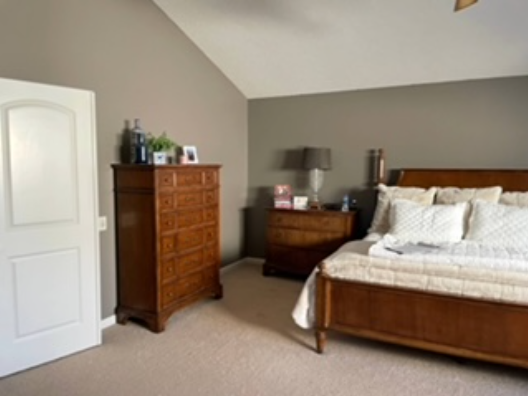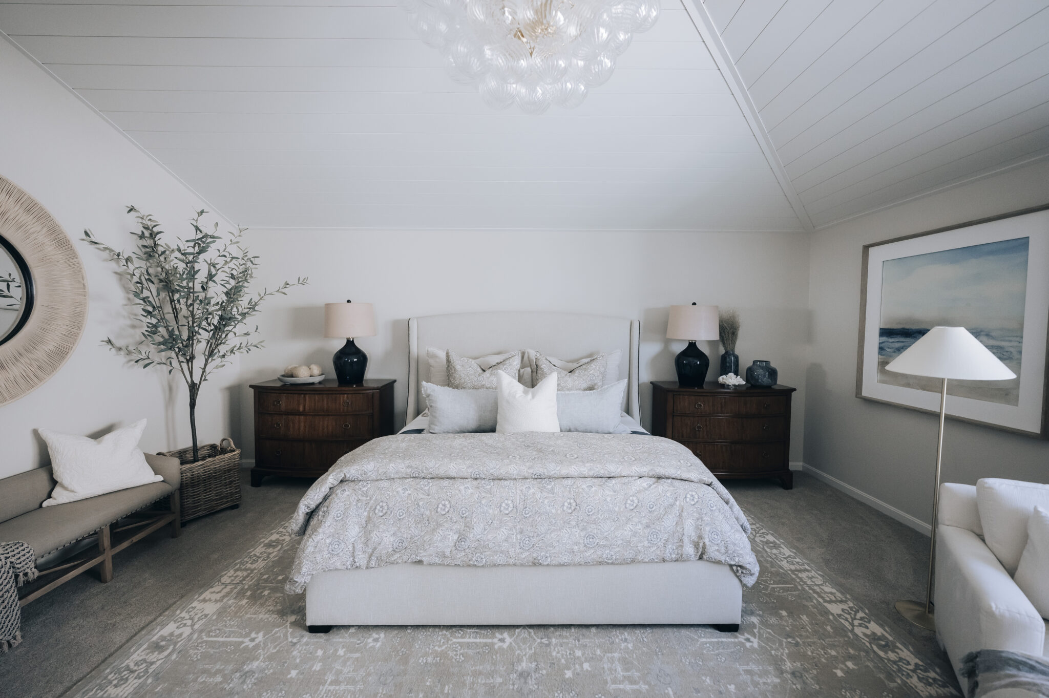 This project was a full primary bed and bath suite remodel. Beth pulled inspiration from her clients’ love for the beach. She added tongue and groove ceiling detail to enhance the angled ceiling and used a beachy color pallet to lighten and brighten their space. Beth incorporated statement lighting to play off the ceiling detail.