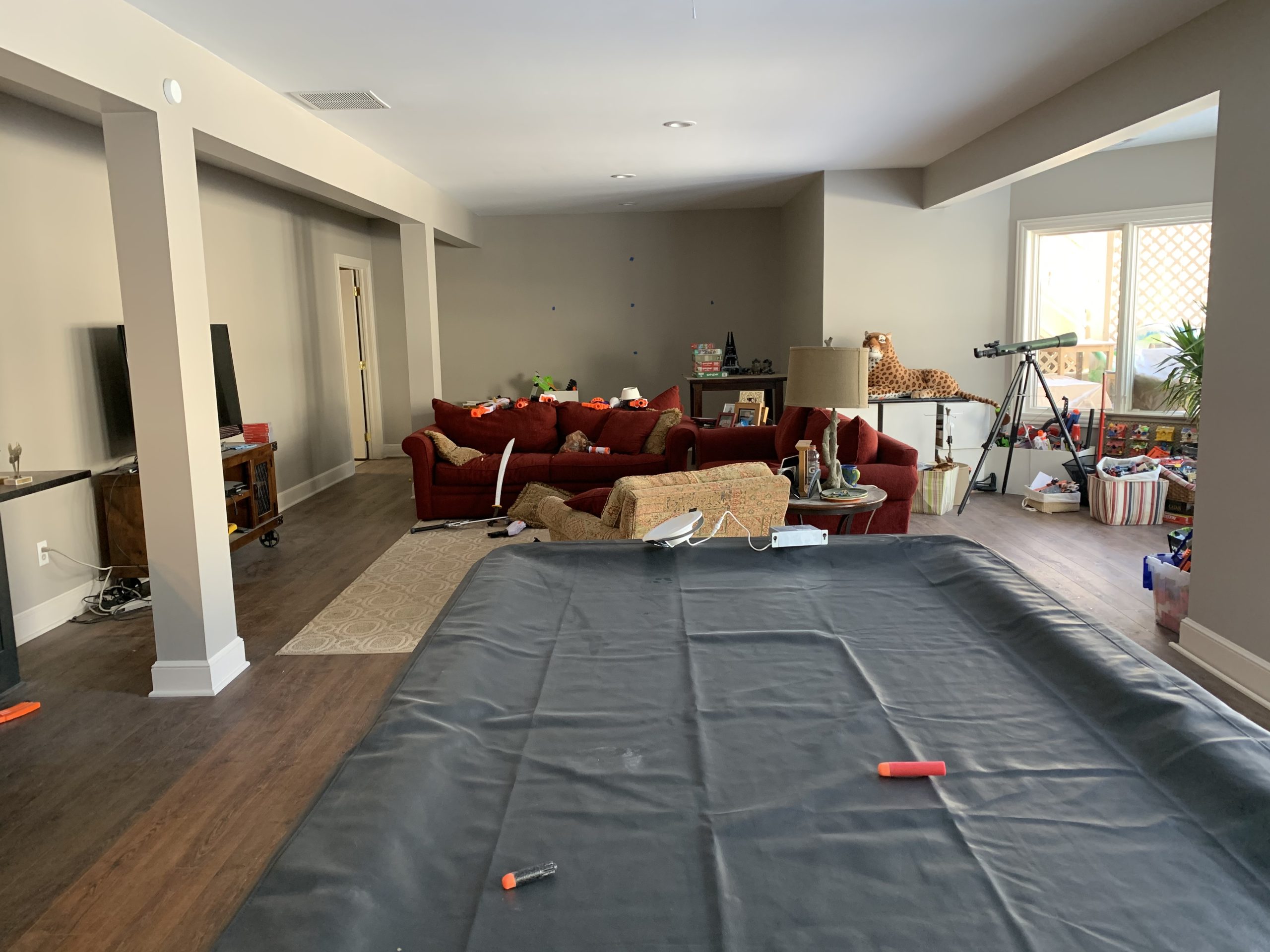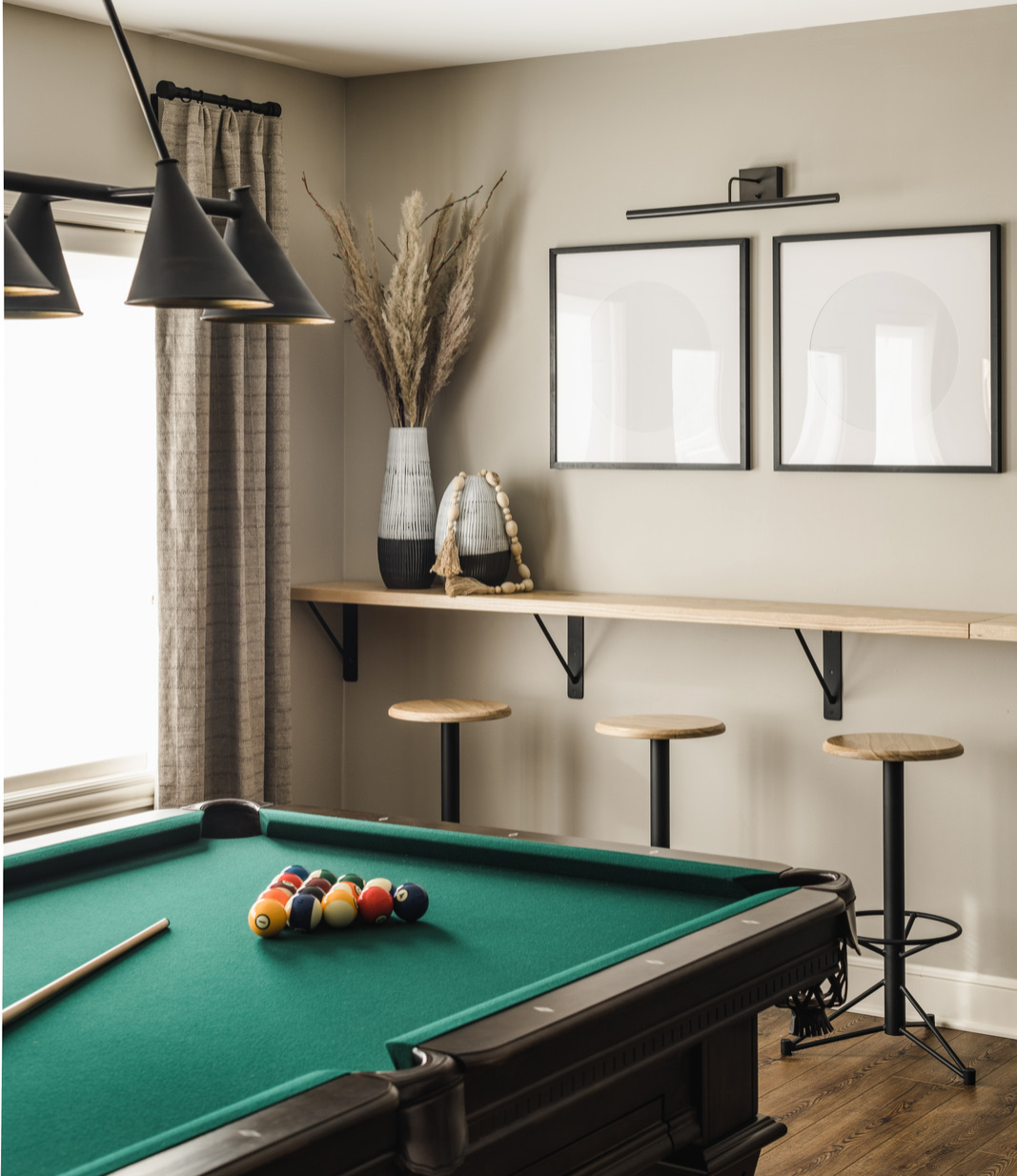 This basement got the ultimate facelift — Beth stripped this space down and started fresh with new flooring, paint, and a new configuration featuring a bar, game table area, custom gaming station, and super comfy furnishings perfect for large gatherings or family movie nights. At one end of the room is a wood feature wall with a floating media cabinet to house all the video gaming equipment. At the opposite end of the room, a wall bar was added, perfect for their family pool table tournaments. With a spot for it all, the lower level has quickly become this family’s favorite place to host parties or retreat to unwind.Captured by Tiffany Ringwald Photography.