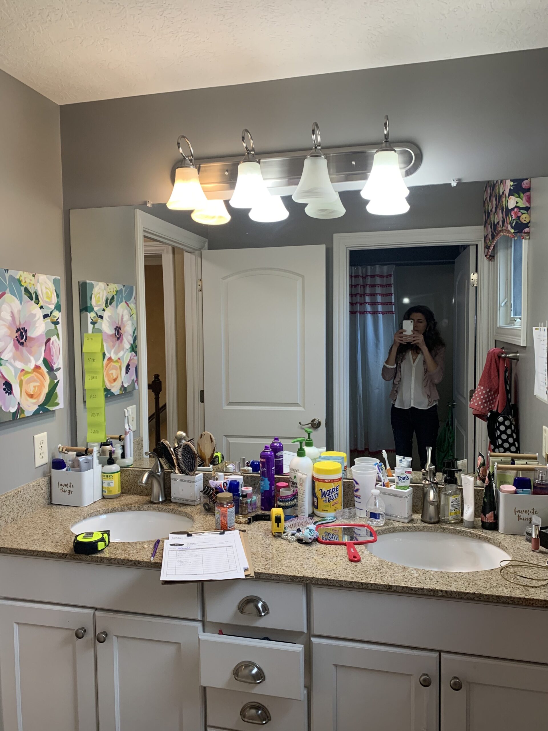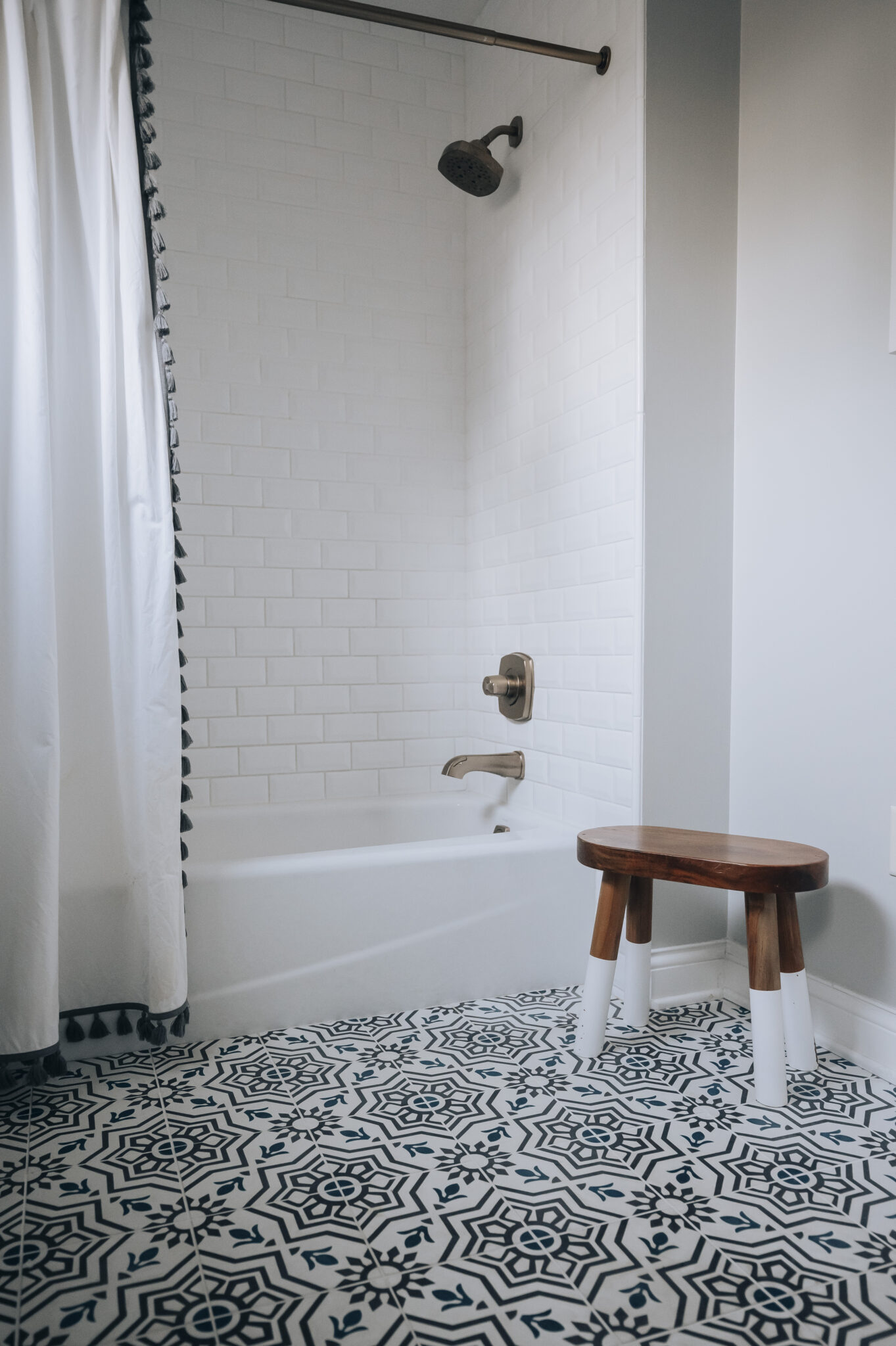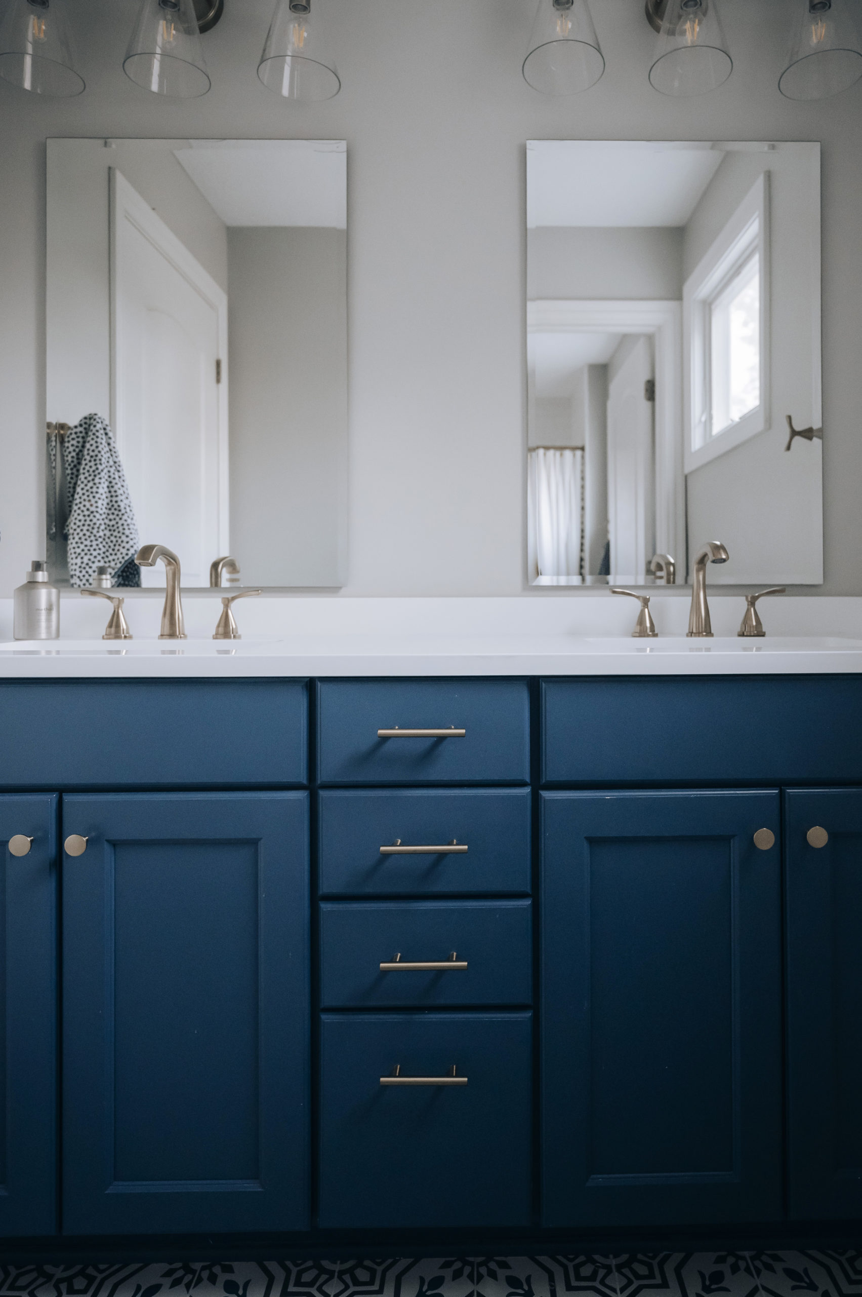 This bathroom was too plain and gray for the client. They wanted a fresh change to the space, so Deneen added a fun concrete floor tile, a fresh new color and gold fixtures. Bright white beveled subway gives the shower some fun dimension and makes the bathroom feel bigger.