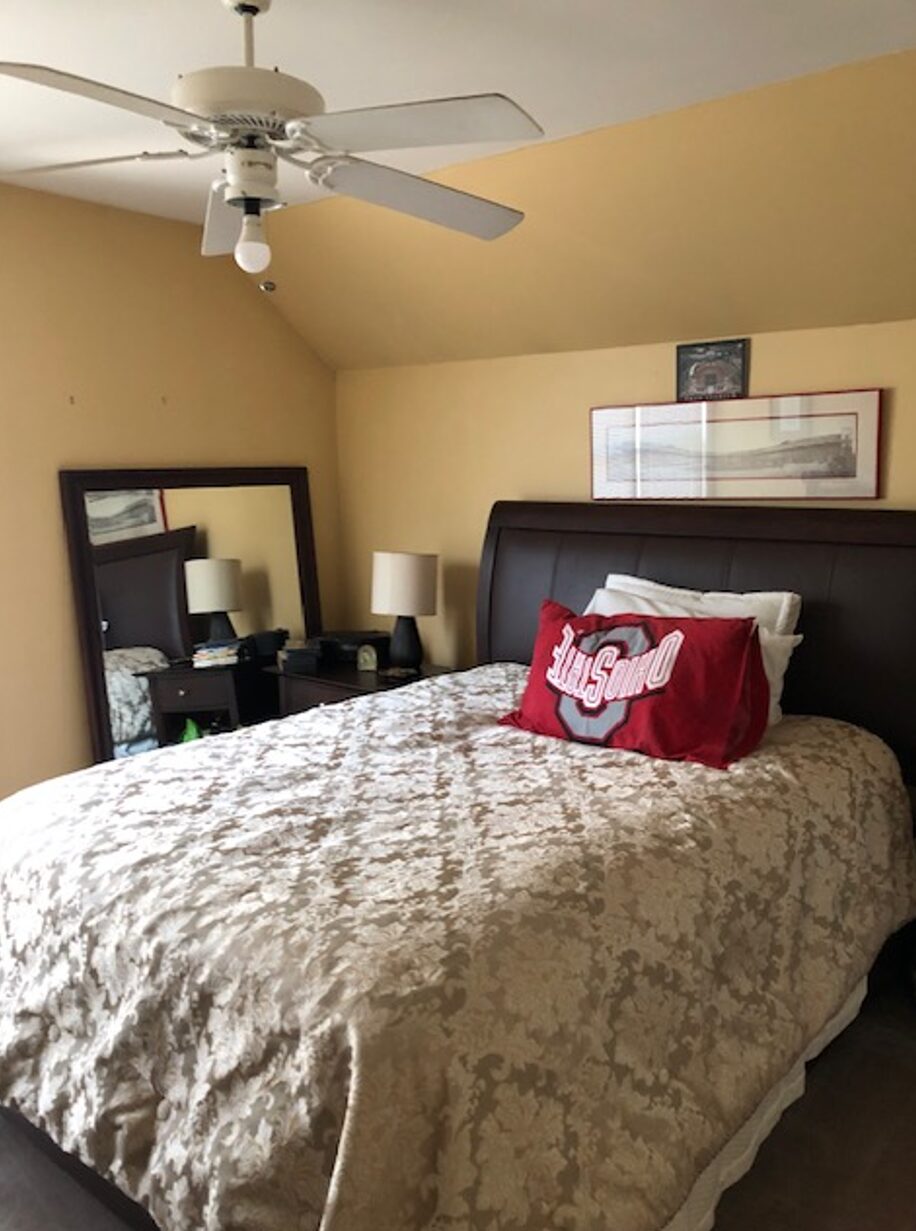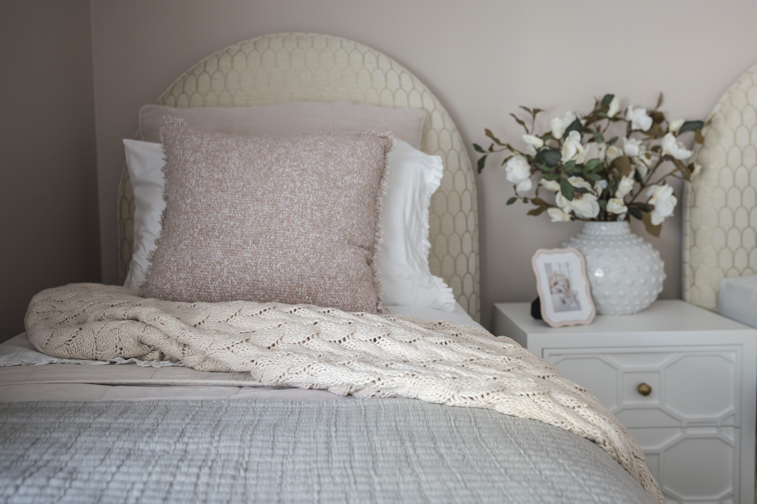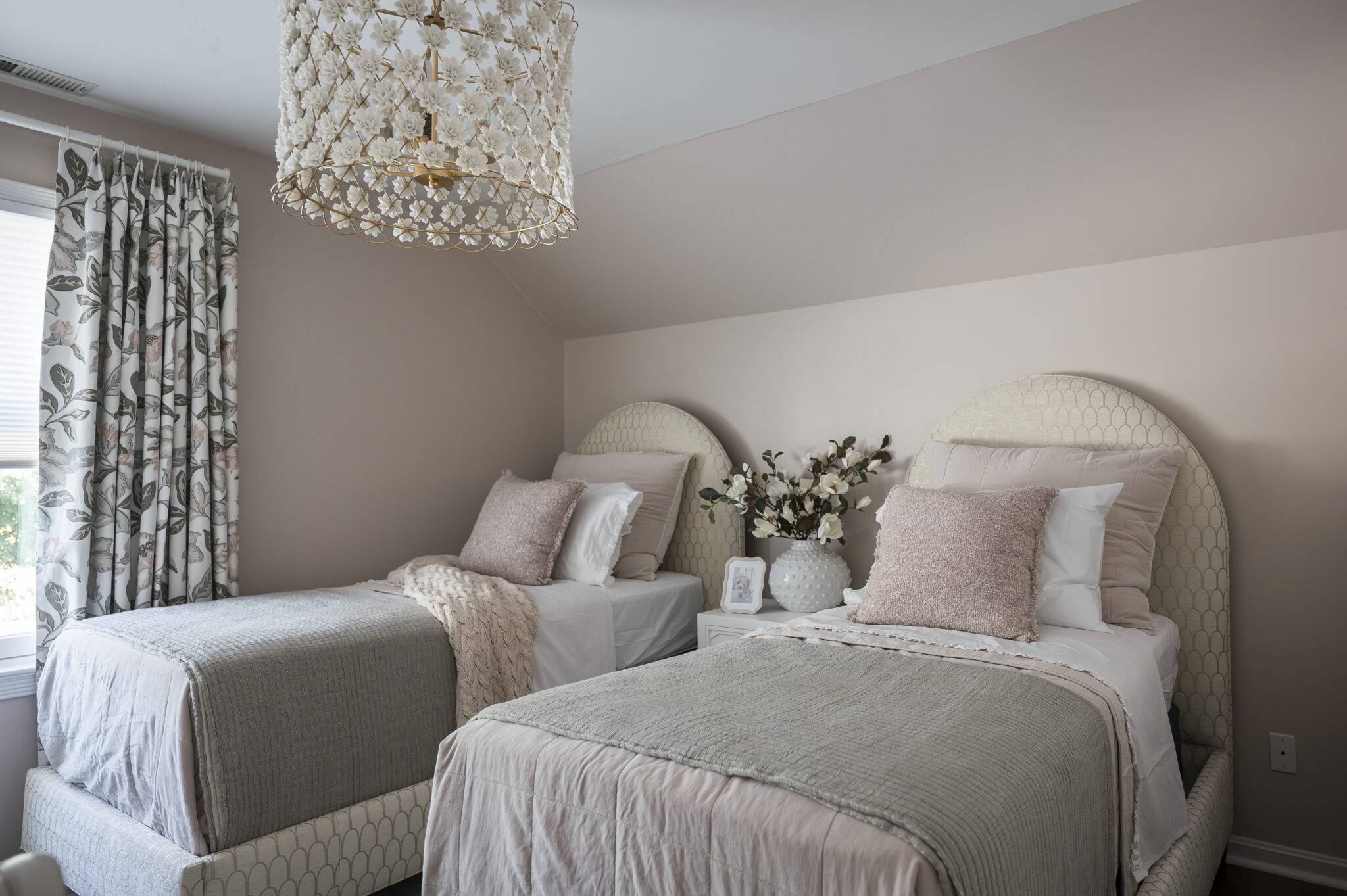 Combining sweet blush tones, gold accents, earthy taupes, and crisp whites, this bedroom is a little girl’s dream. With its soft blush walls, the bedroom highlights two custom twin beds with a gorgeous cream and gold upholstery. The bedding showcases an abundance of texture from the ruffled sheets to the velvet quilt, boucle pillows and channel stitched blankets. Accents of gold shine in the nightstand, artwork, mirrors and upholstery. Floral drapes pull in the entire color palette and tie back to the stunning chandelier with porcelain flowers and a golden frame