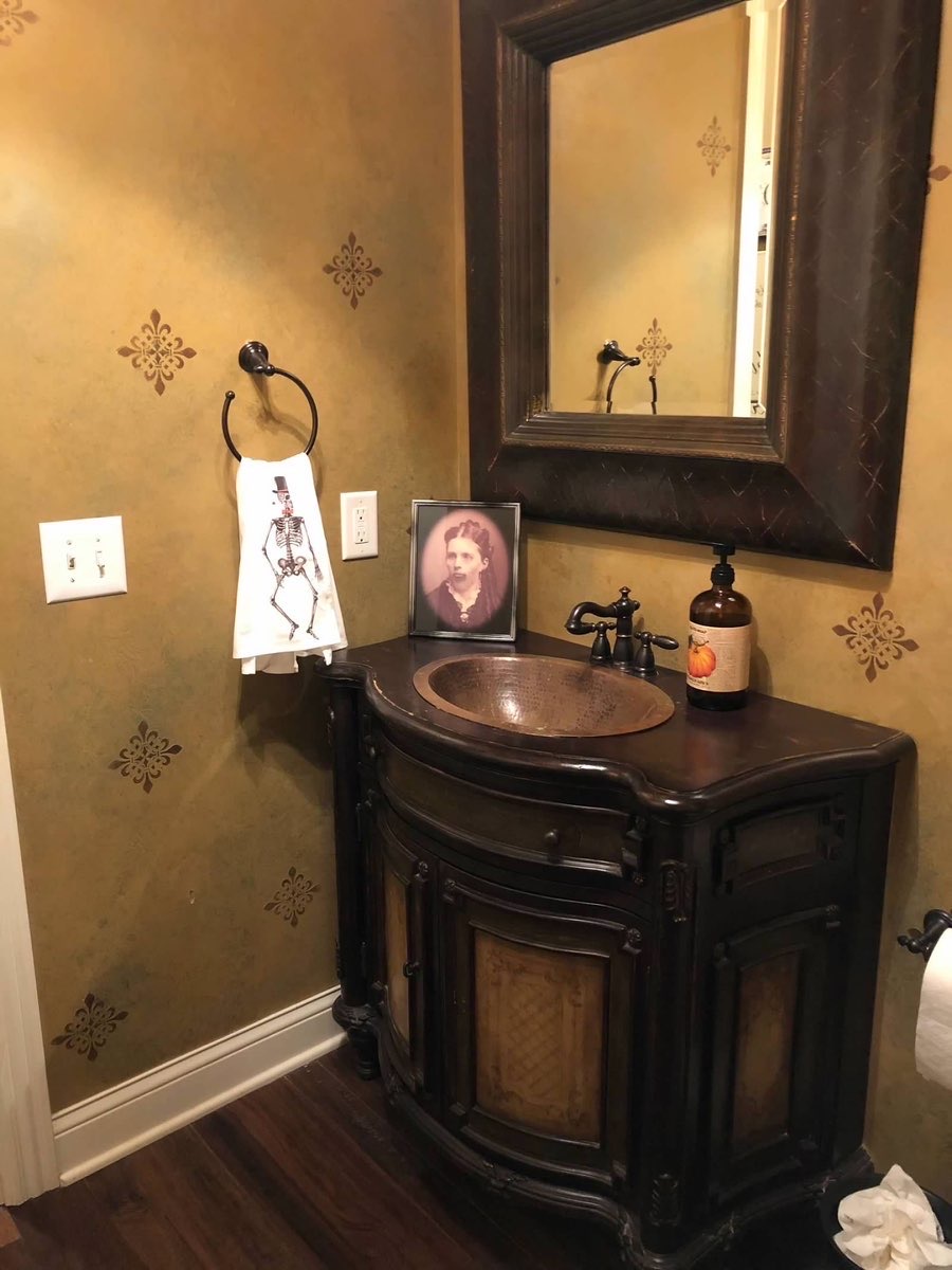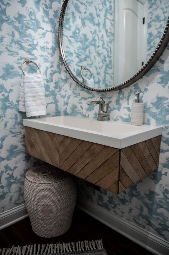 All the powder room details: new vanity, mirror and lighting for the Win! The gorgeous new wallpaper finished up this room.