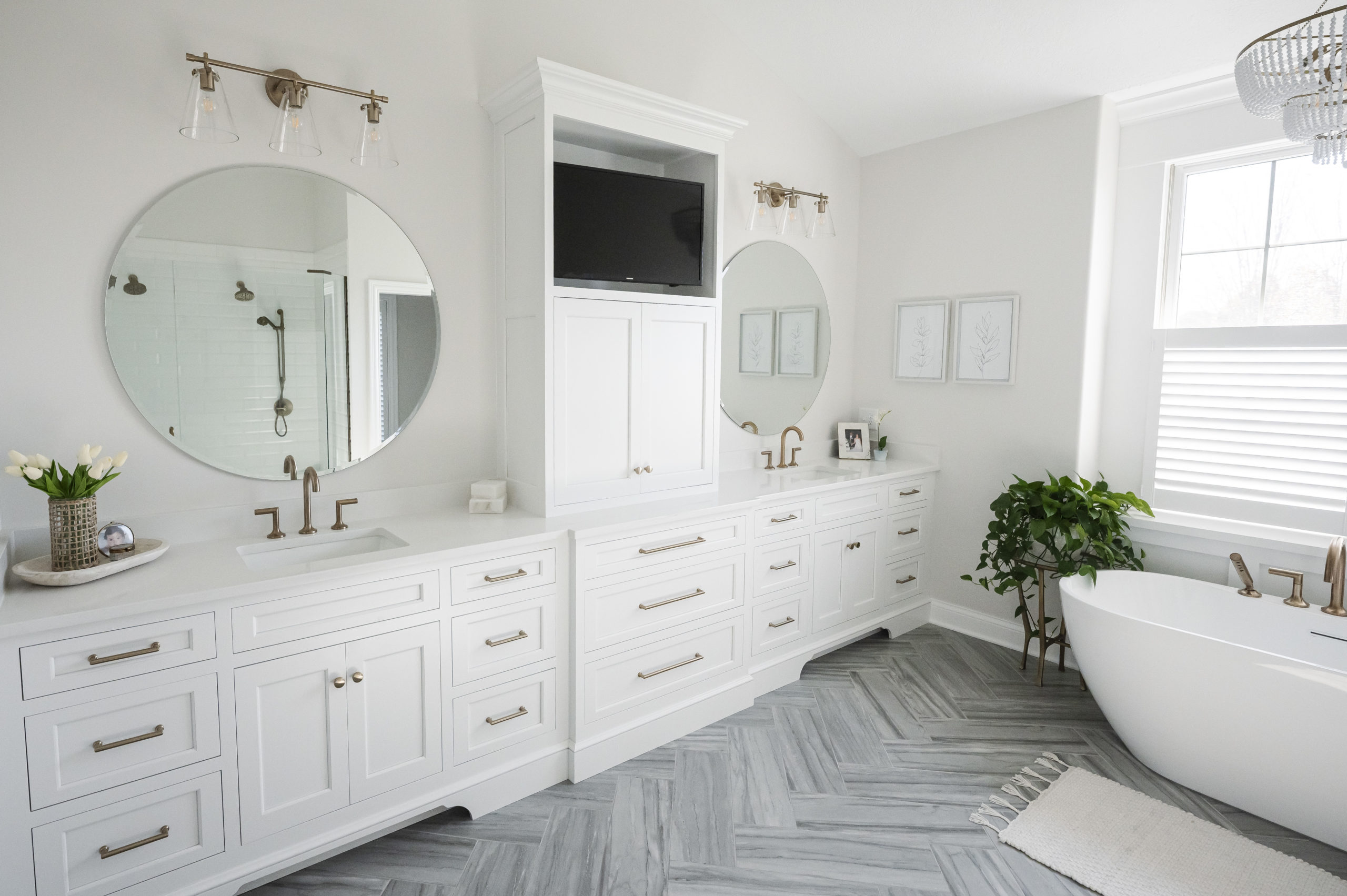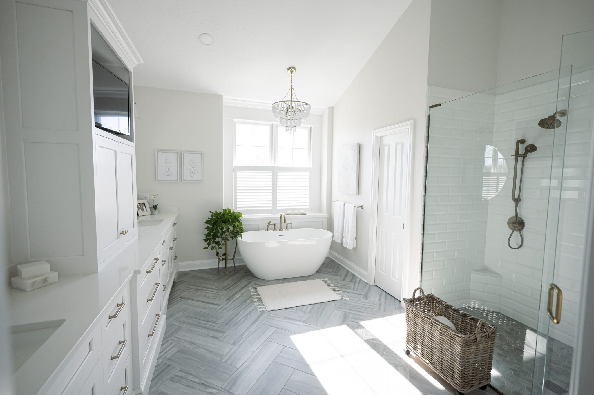 This bathroom had major water issues in the shower and the old color scheme was dark and dated, something the homeowners were very ready to change. They wanted this space to feel like a light and bright spa. The couple wanted a curbless shower and to have a TV in the bathroom to catch the morning news. Deneen enjoyed designing the accent wall, herringbone floor and the overall layout of the whole space. Tempesta Builders were instrumental in helping create the new design. Deneen helped the client choose dark gold fixtures that kept the space feeling really warm and inviting instead of too cold. The final touch was just the right chandelier. The client had poured over many choices and finalized on the perfect amount of texture, a touch of gold and white.