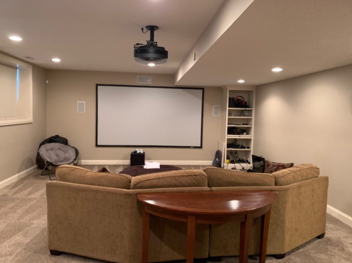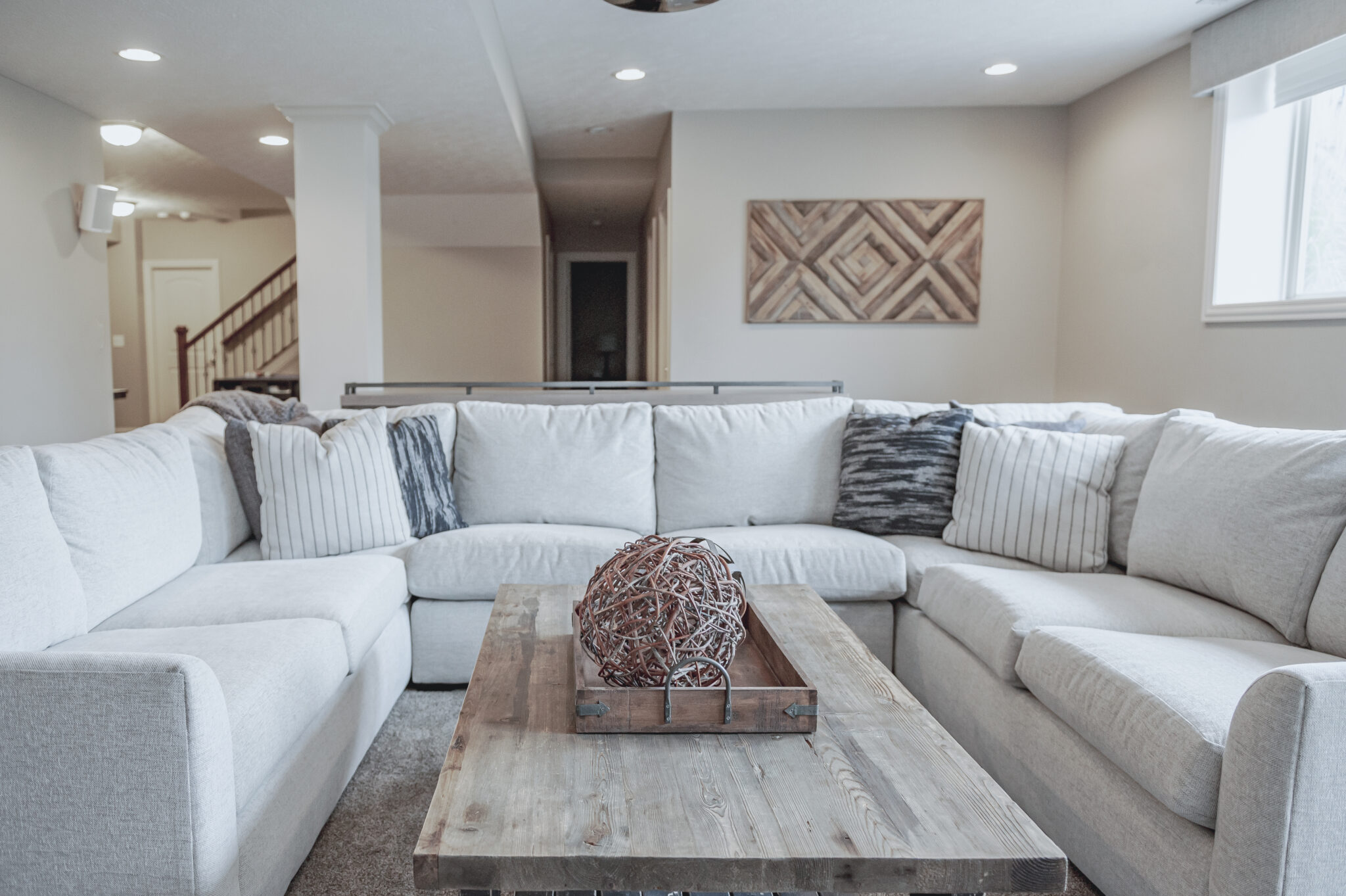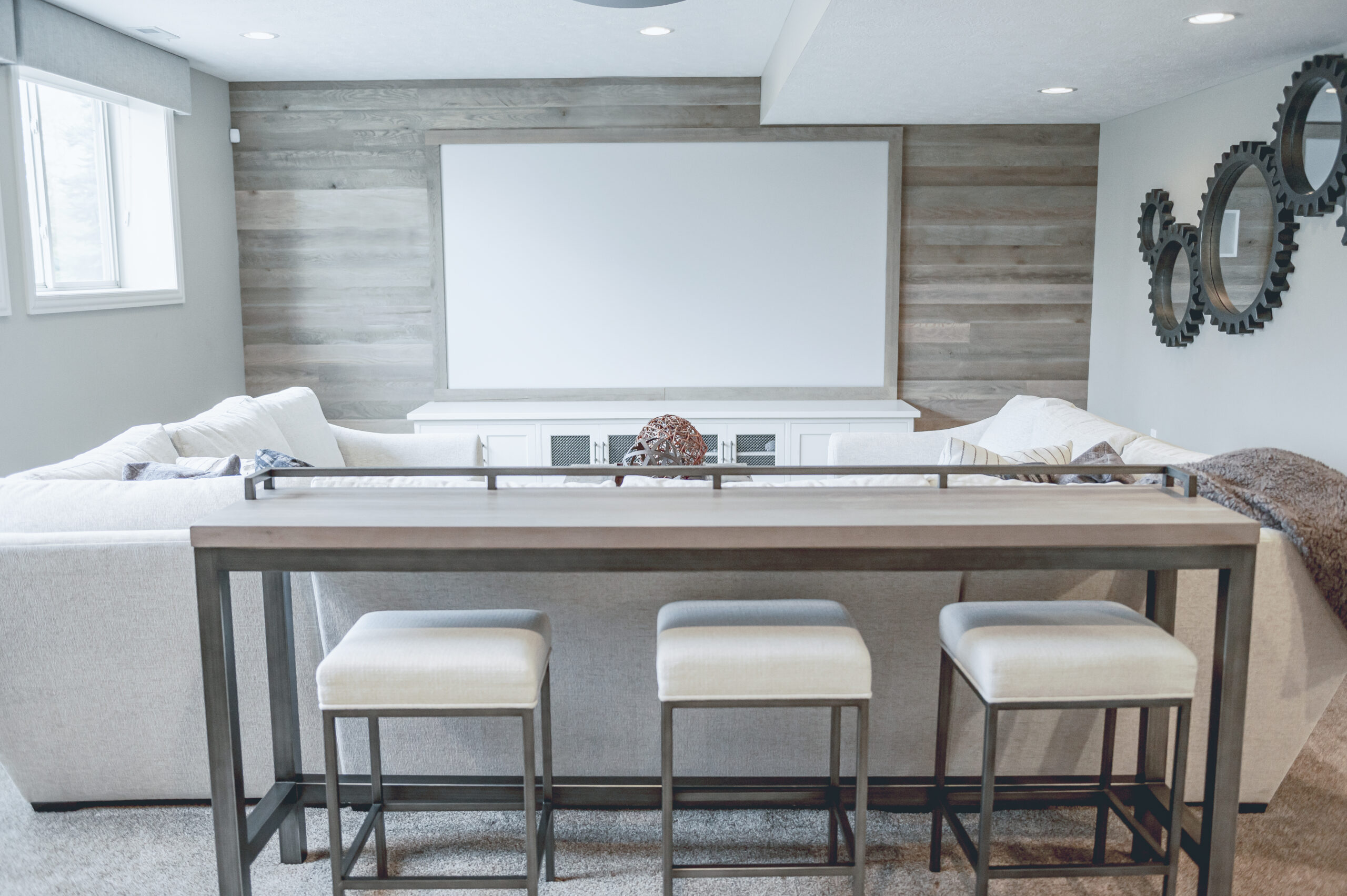 The homeowners were ready for a change and were very seriously considering a move, but they loved their neighborhood and the price of a new home that was smaller and not on as good of a lot was twice as much as their existing home. Emily worked to redesign their spaces for this family to fall in love with their home again. She started by replacing all of their flooring with new hardwood to unify and refresh the home.The basement was updated with a wood feature wall that the large tv screen was mounted to. Emily added a customized frame around the screen to add character and a polished look. Custom built-ins were installed at the base of the screen for storage. Emily added a custom U-shaped sectional for movie nights and maximum use of the space for her clients.