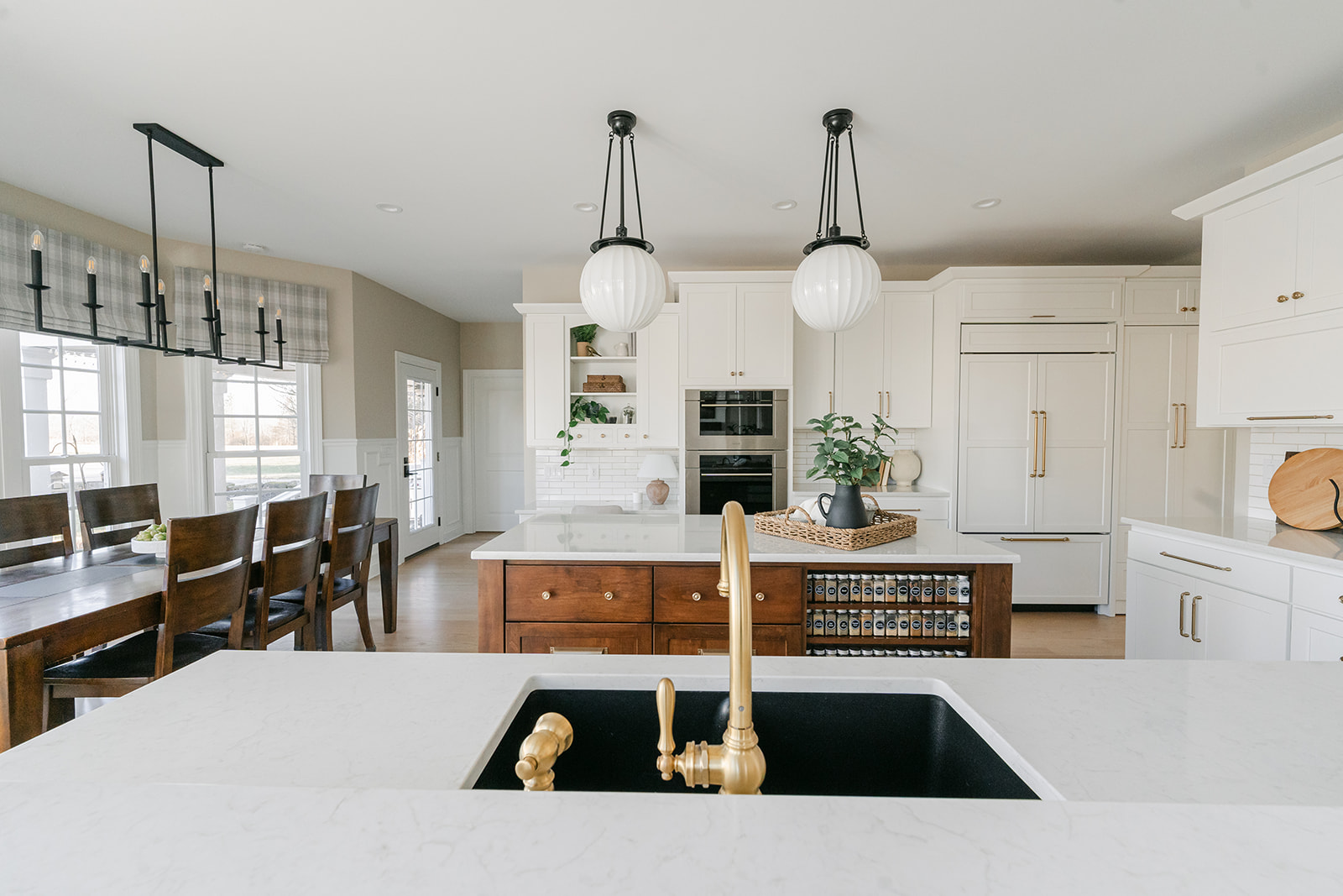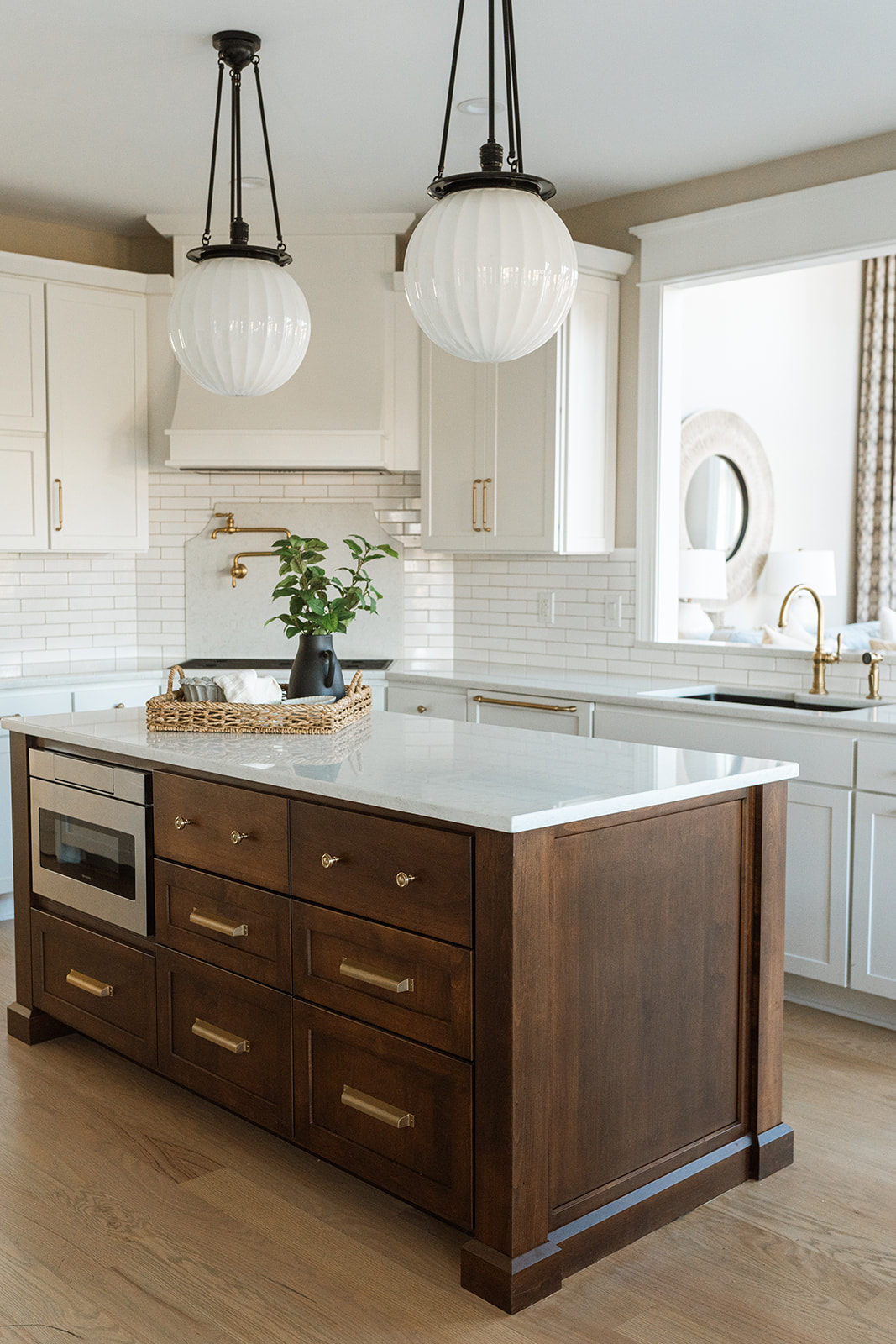 Fresh paint, new lighting, custom window treatments, and refinished hardwood floors/steps were done throughout the whole first floor. Erica redesigned the kitchen using a lot of the existing cabinets by reworking and painting them. A new walnut island was added along with paneled appliances. A range hood accentuates the shaped quartz backsplash feature. Erica added a hidden door that leads to the pantry as a special feature for her client.