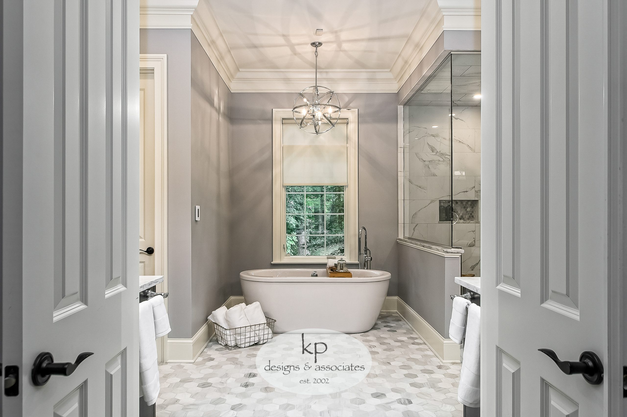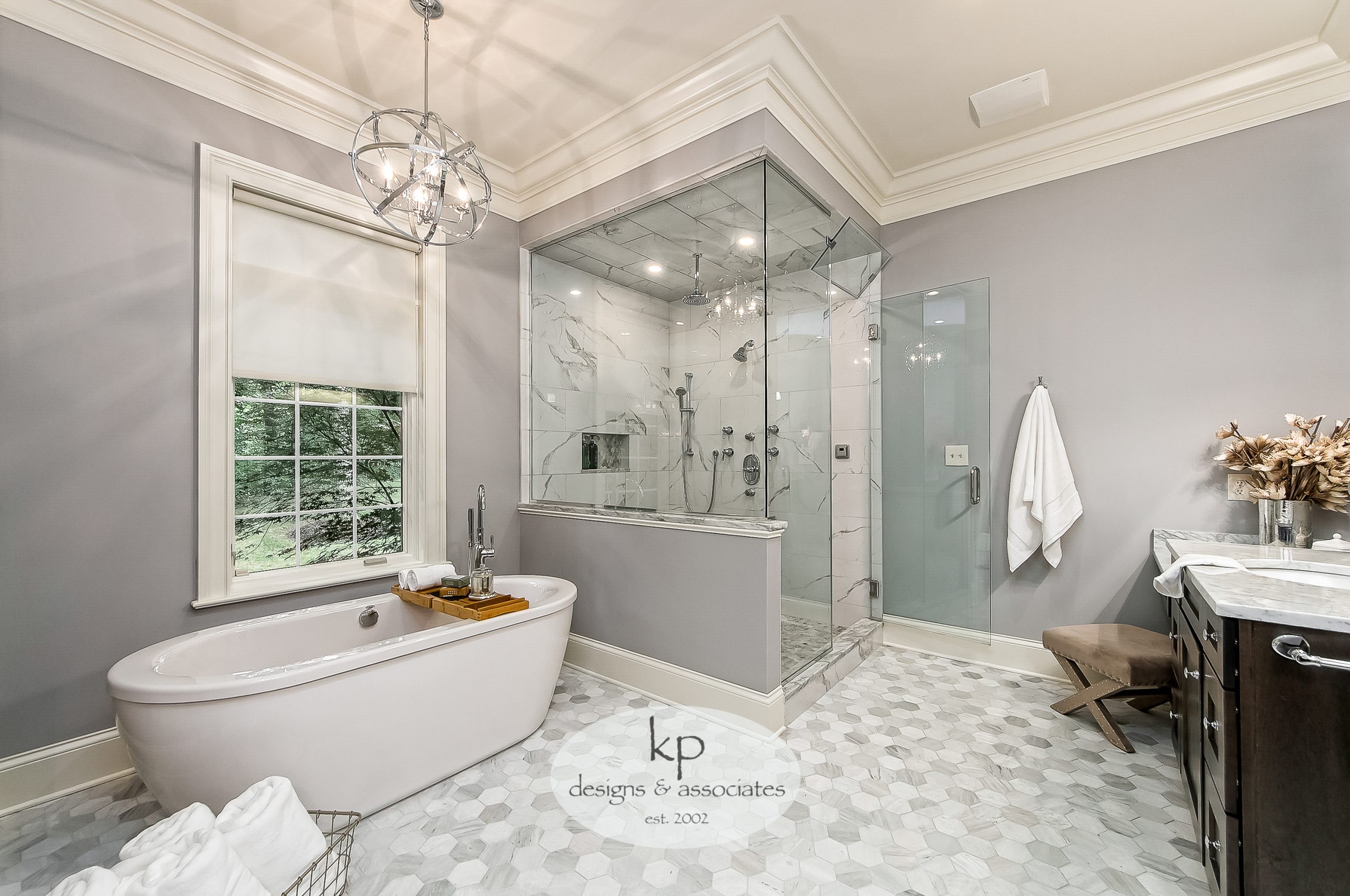 The client wanted a more open, functional space with a free-standing tub and a steam shower. We decided on a transitional design and started with removing the wall between the shower and vanity to create a more open floor plan. The complete remodel included hexagon marble tile, marble-looking large tiles, and a free-standing oval soaking tub. The dark wood cabinets and polished nickel finishings created a classic look that will never go out of style.