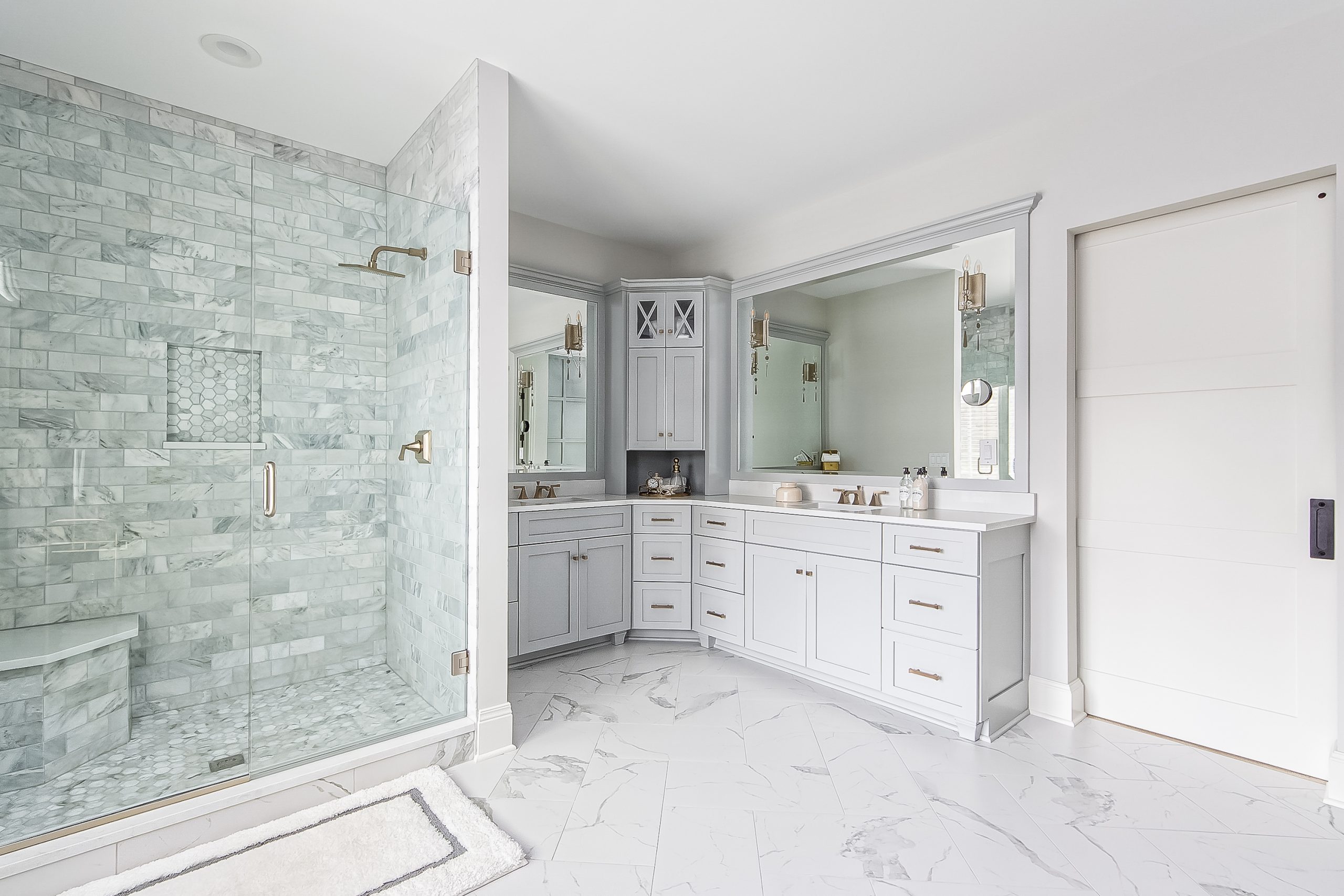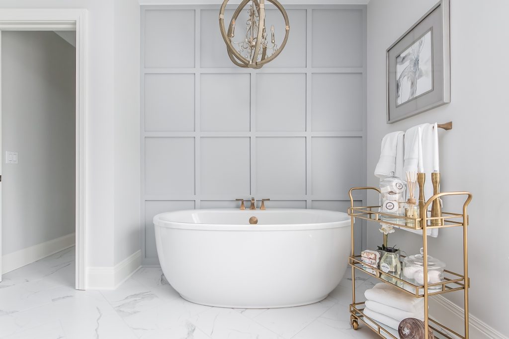 The client wanted to create a timeless serene spa. Inspired by classic elegance, we worked with the client to completely remodel the bathroom. The result was this beautiful, peaceful getaway with a standalone tub, wainscoting and chandelier.
