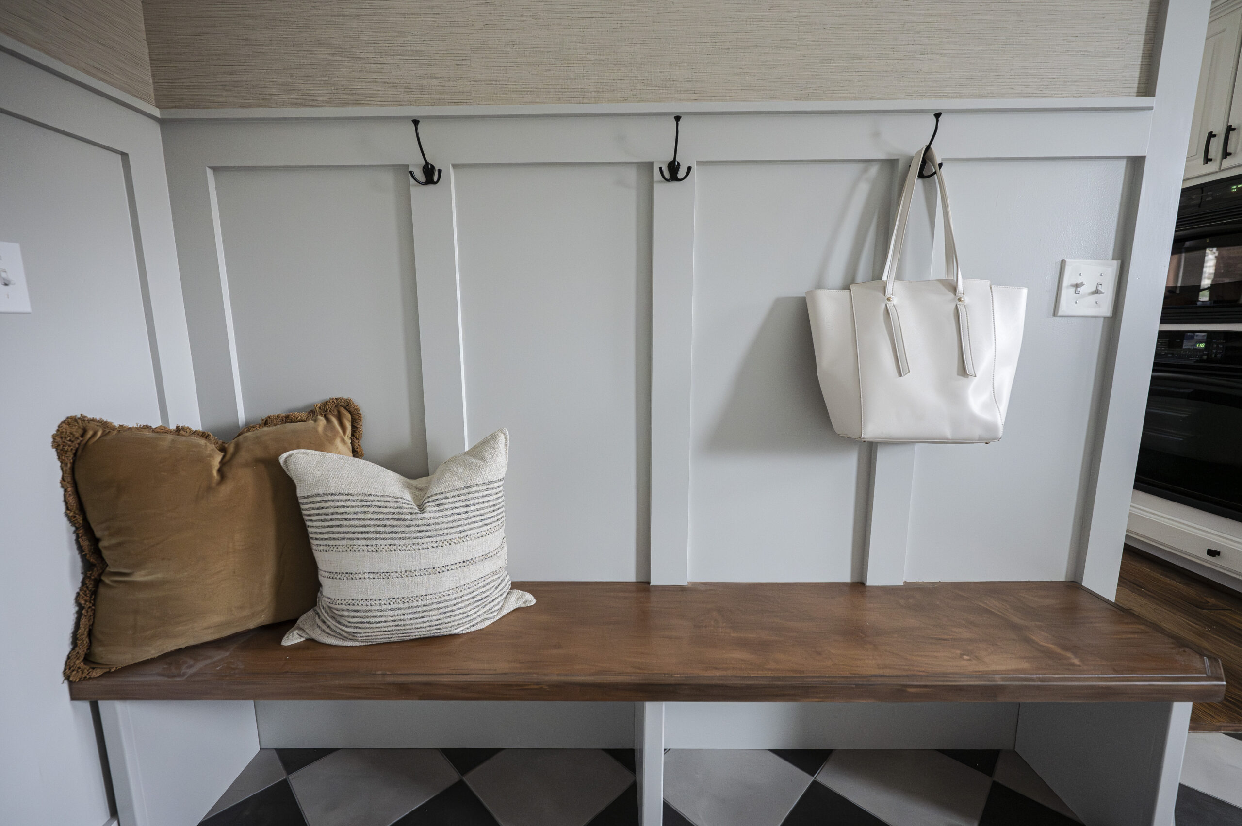 When we removed the closet in the entry we needed a better storage solution. Custom cabinets in a light gray finish line the walls and Erica added a large utility sink. Checkerboard tile floors are a fun accent but also easy to clean in such a high traffic area. She added a grasscloth wallpaper and bench to the opposite wall. The client had an old armoire that Erica repurposed into a cabinet door inlay below the sink.Captured by Tammy Dean Media.