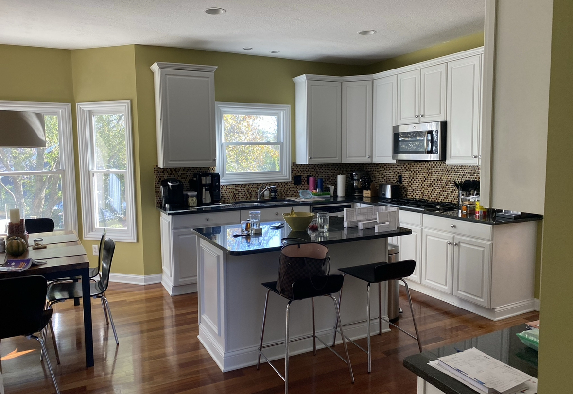 The small kitchen and dining area were combined to make a large, light and bright kitchen with an oversized island for entertaining . Extra thick island countertop, oversized pendant lights, and custom details like the wood trim on range hood and wood back to island add interest and warmth to the space.