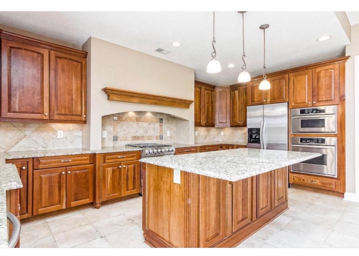 The client chose to buy the house for the neighborhood and desirable location. We updated the interior to a comfortable farmhouse design. This transformation included implementing modern light fixtures throughout the home. In addition, we remodeled the kitchen with white cabinets, a new kitchen island, and a custom hood. With all of the modern updates in place, we were able to accessorize to bring home the farmhouse aesthetic.