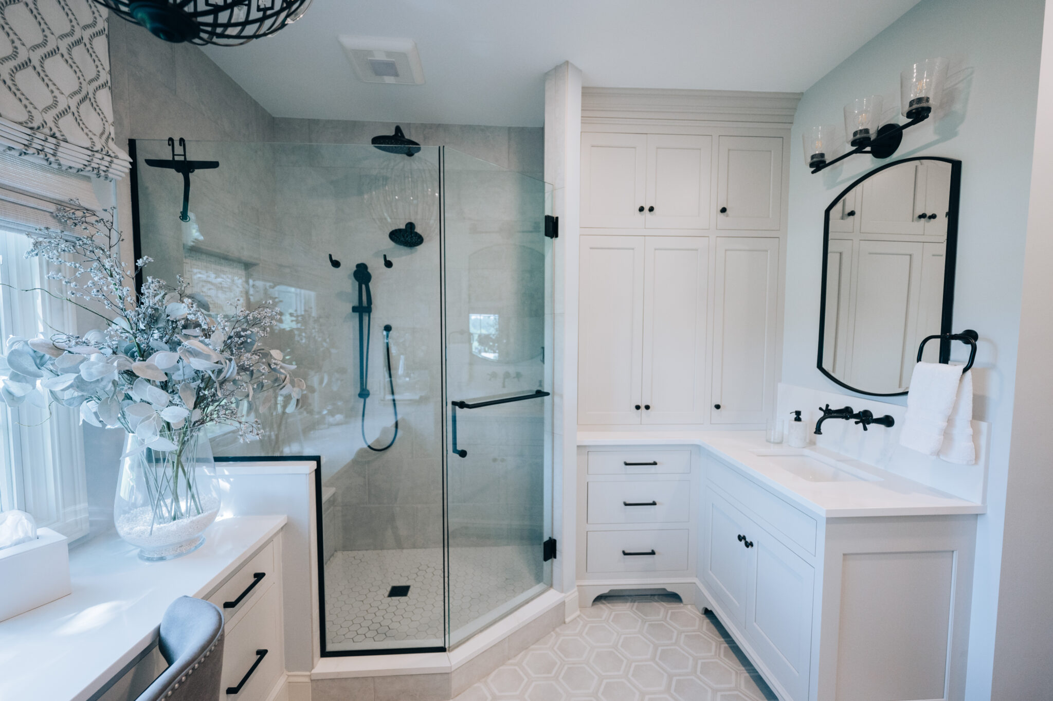 The client was ready for an update to bring the finishes up to date. Additionally, this was a relatively small primary bath, so Celeste was very intentional about space planning. This included swapping the tub deck for a makeup vanity, adding more cabinetry and taking all cabinetry to the ceiling. The client has space for everything now!