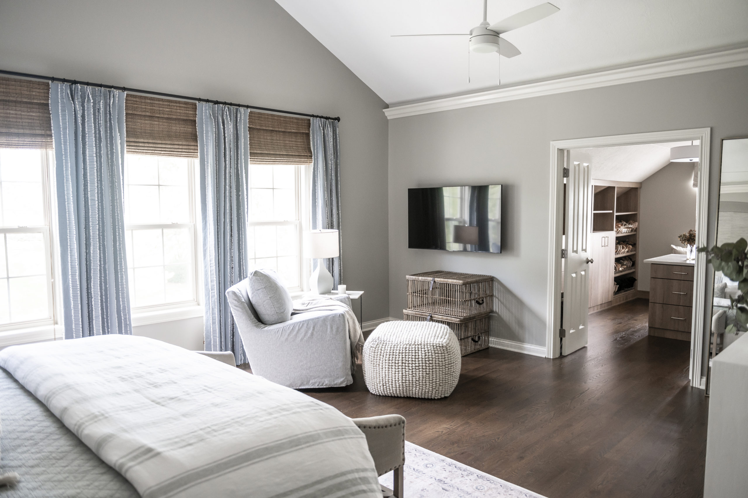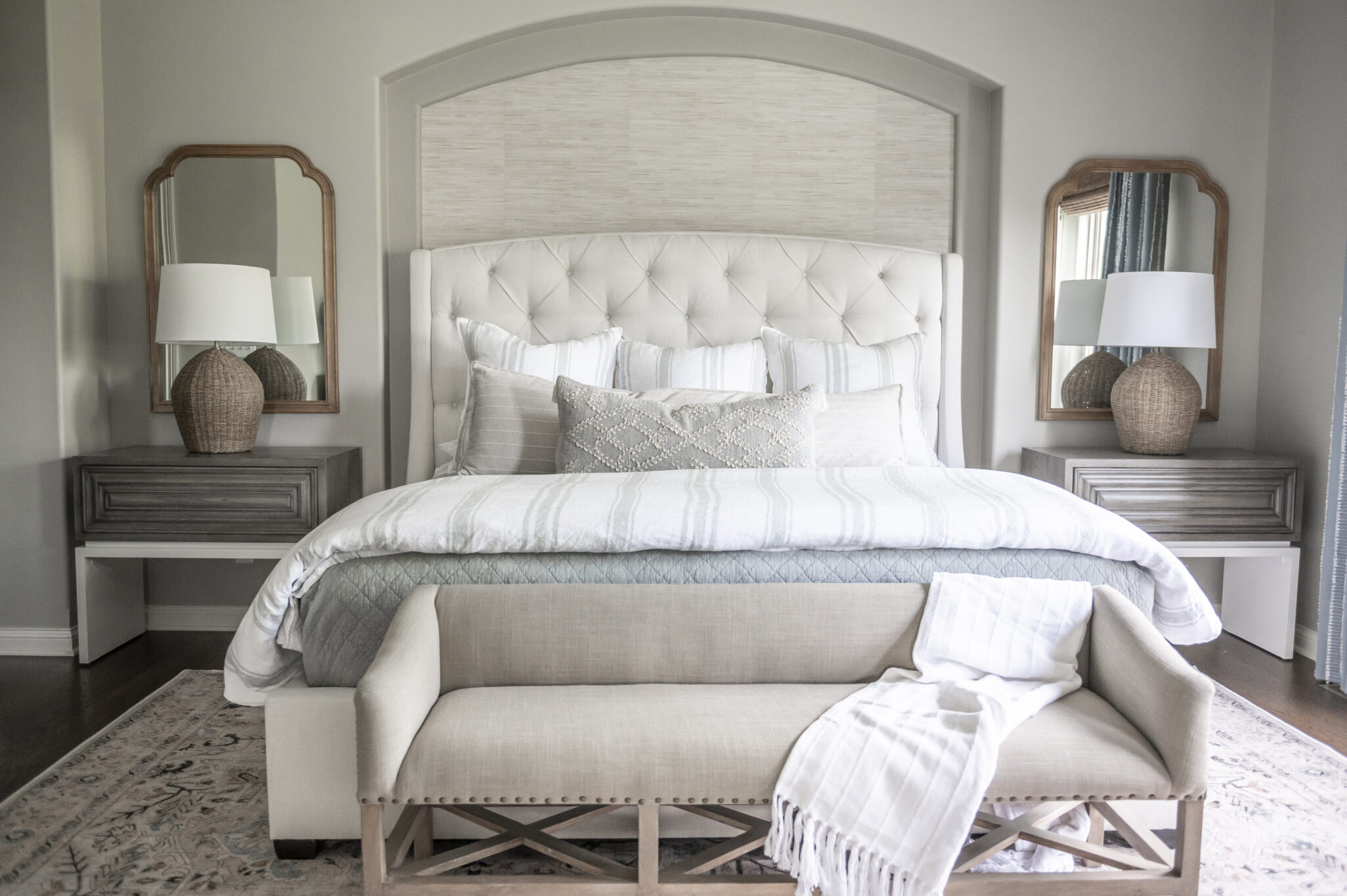 | Combining a cool, comforting color pallet of blues, greens, creams, and whites created the perfect feel for this new room. The addition of grass cloth behind the headboard, wallpaper, roman shades, and basket lamps filled this room with texture! Beth also created a custom designed ‘his & hers’ walk in closet complete with an island and window seat while still maximizing storage.