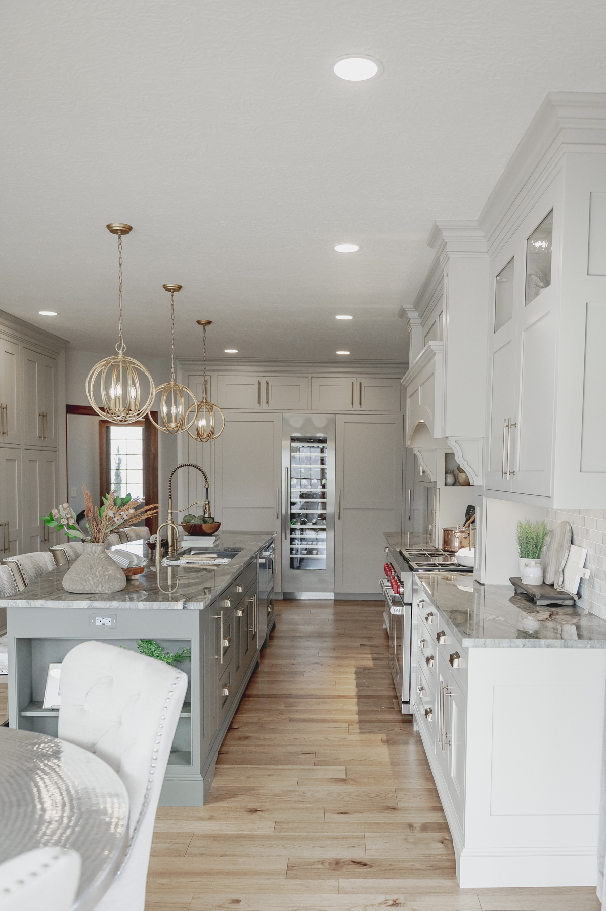 | Kellyann incorporated beautiful quartzite countertops to accentuate the warm white and green/gray tones of the cabinetry, bringing a warmth into the once dark and dated space. By removing the desk and reconfiguring the island to accommodate entertaining, the kitchen was transformed into an inviting area full of warm gold tones, natural textures and on-trend yet timeless details.
