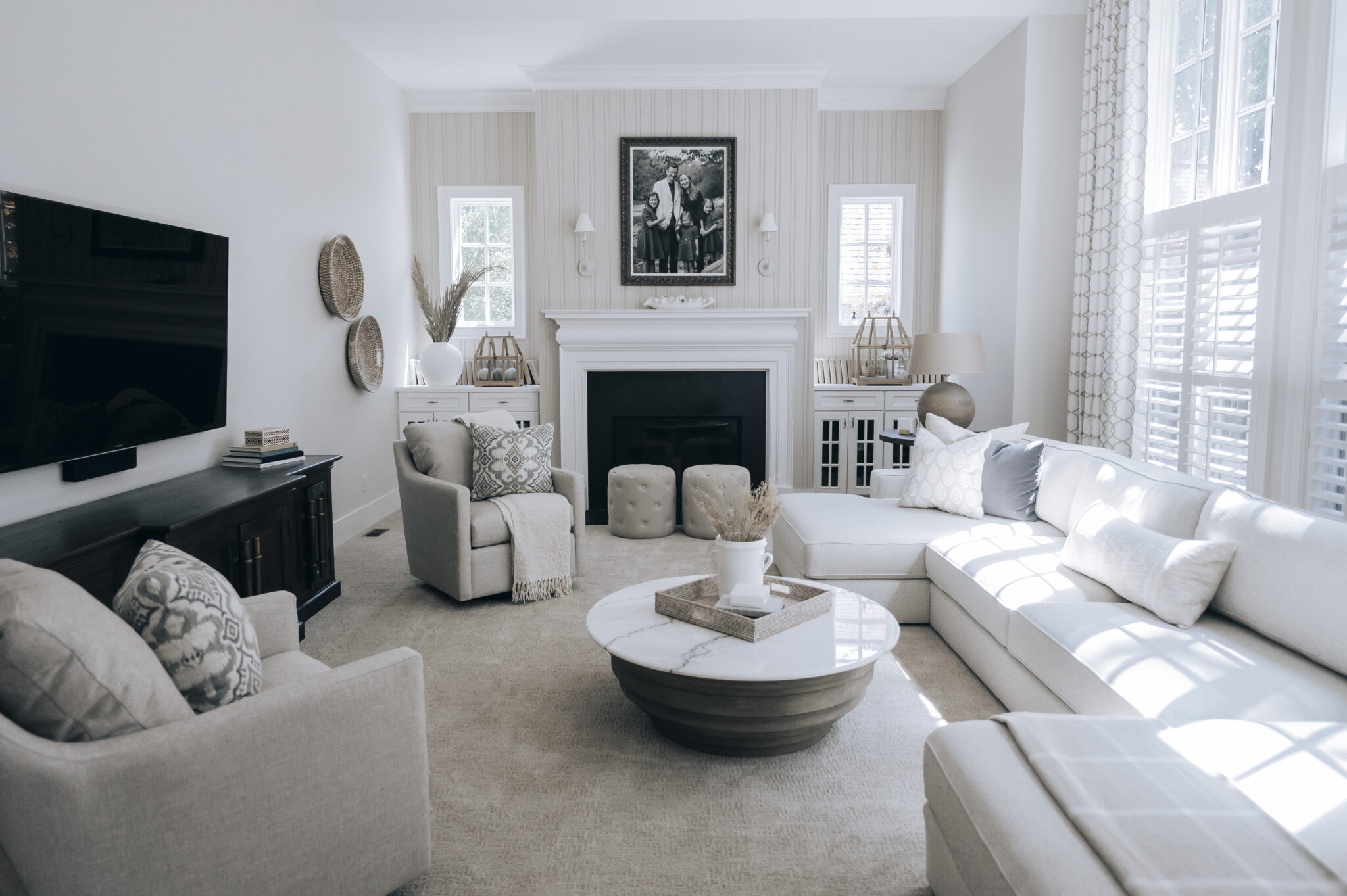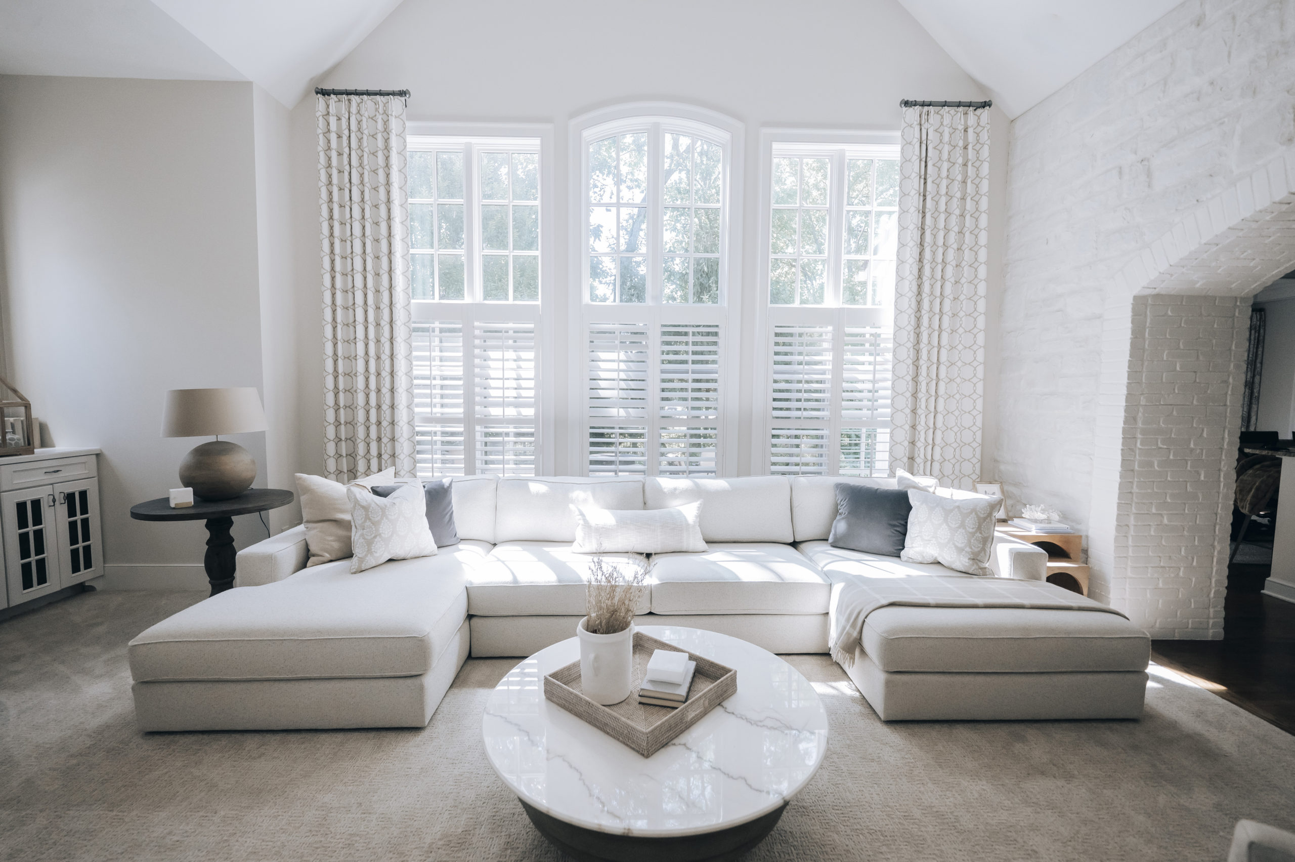 Beth designed this space to create a cozy and inviting family-friendly space to be enjoyed by all. Working with the grand length of this room, special attention was given to scale. Using the right proportion was critical when choosing a great sofa for the space. Beth chose a perfect-fit sectional in performance fabric with TWO chaises, leaving everyone with their favorite spot. Limewash was added to the stone and brick archway updating the architectural detail and giving this room a whole new look!