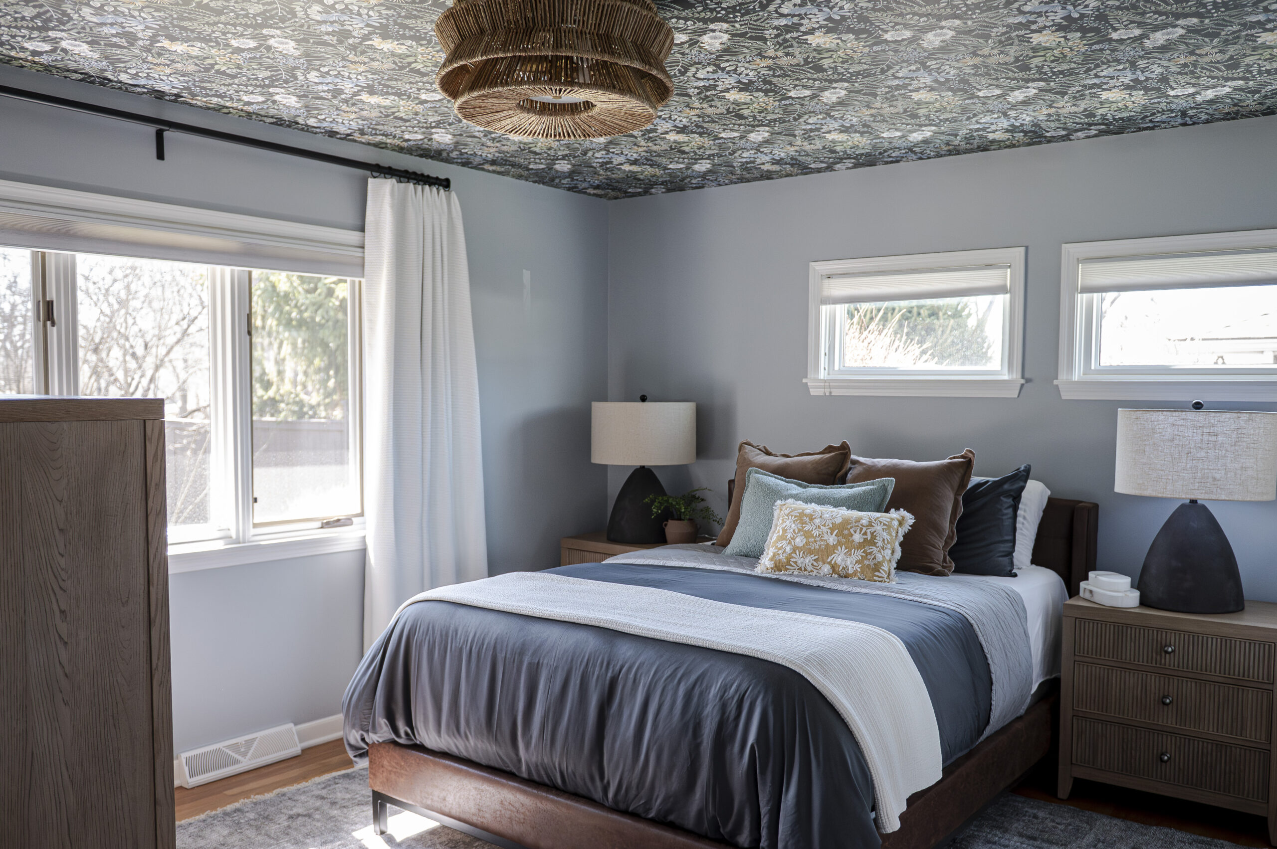 From the start, the client knew they wanted to highlight wallpaper in this primary bedroom. The room did not have an ideal focal wall so Michelle decided to move the wallpaper to the ceiling for added interest and provide a serene and cozy retreat for the homeowner. Using the tranquil blues and greens from the wallpaper combined with touches of mustard, chestnut leather and cool greys, we landed on an earthy color palette for the bedding and other furnishings in the room. Reeded wood details can be seen in the furniture which then tie into the overhead light fixture and accessories. Michelle used crisp white for the window treatments and trim to keep the room clean and bright. For the finishing touch, she accessorized with an abundance of textures and materials including alabaster, wicker, antique gold, terracotta and natural greenery.Photographer: Captured by Tammy Dean Media.