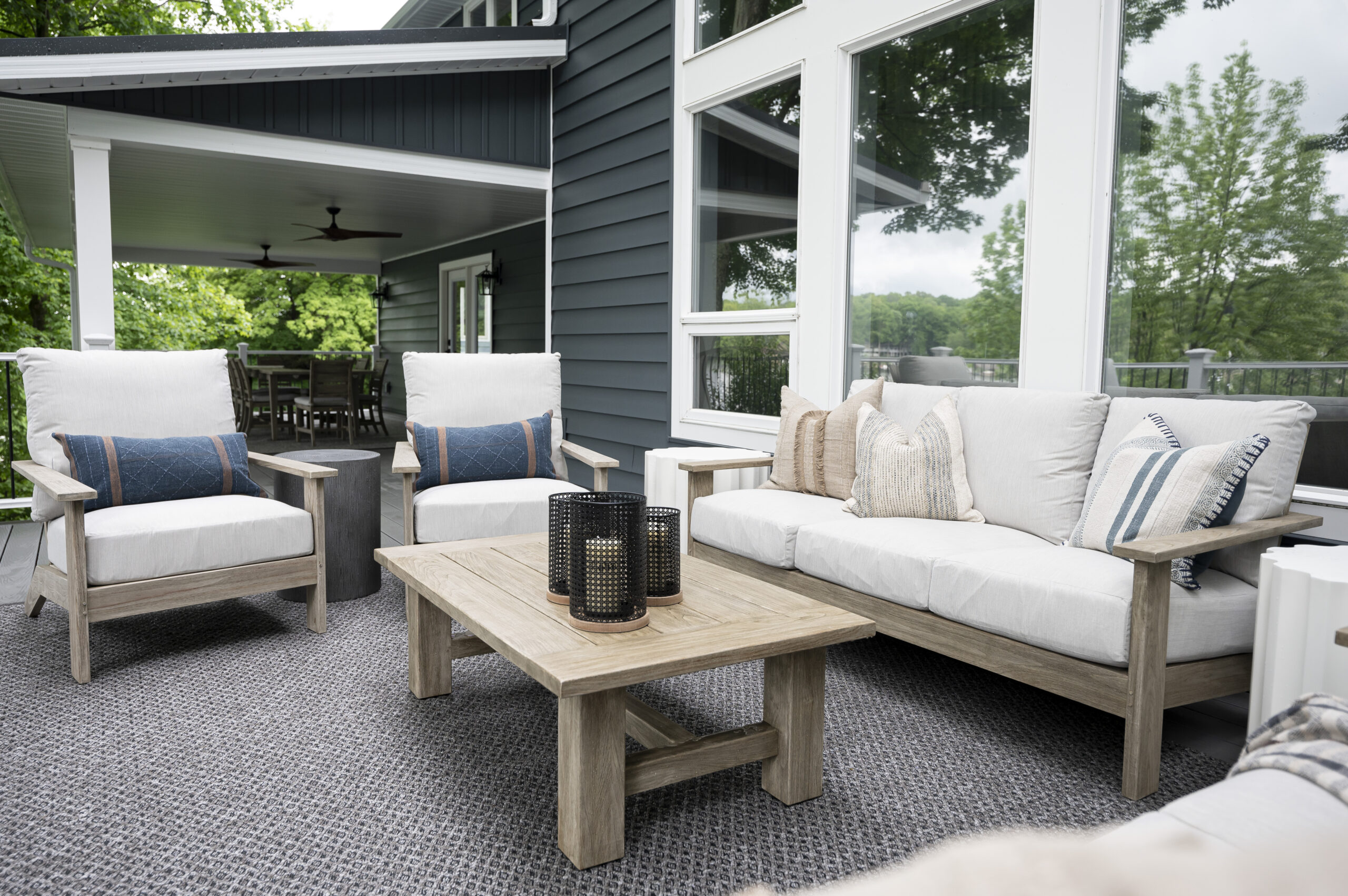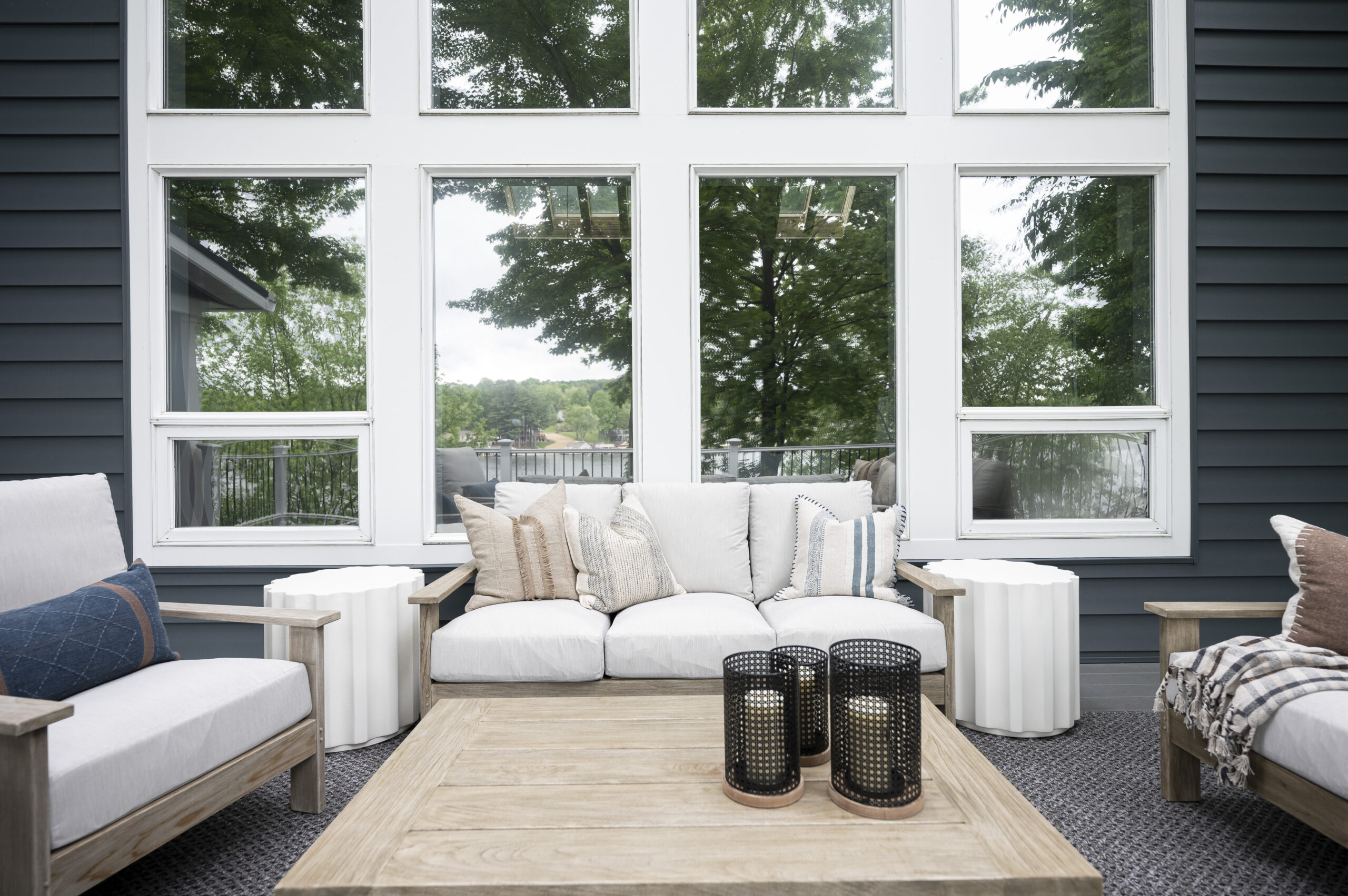 We received an SOS call from our clients who were in the middle of renovating their Apple Valley cottage that has been in the family for generations, but had seen better days. It was no longer meeting their large family’s needs for space and function. The homeowners contacted us during the renovation process and were overwhelmed with selections and deadlines. They were running into a time crunch issue to be ready for the next lake season. We were able to step in and immediately provide solutions and create a plan to complete construction, furnishings and décor on time. The new kitchen design opened up the layout for us to be able to incorporate plenty of seating around the new island and dining table for family gatherings. We were able to define the different areas with the furniture layout and area rugs while still keeping the space open for all to enjoy. It was important to make each space functional with the focus on the beautiful views. We were able to maximize the furniture layout using custom oversized furnishings to accommodate their large family gatherings. The new patio addition provided extended living space that this family did not have prior to the renovation. And now there is plenty of outdoor space to gather and dine.
