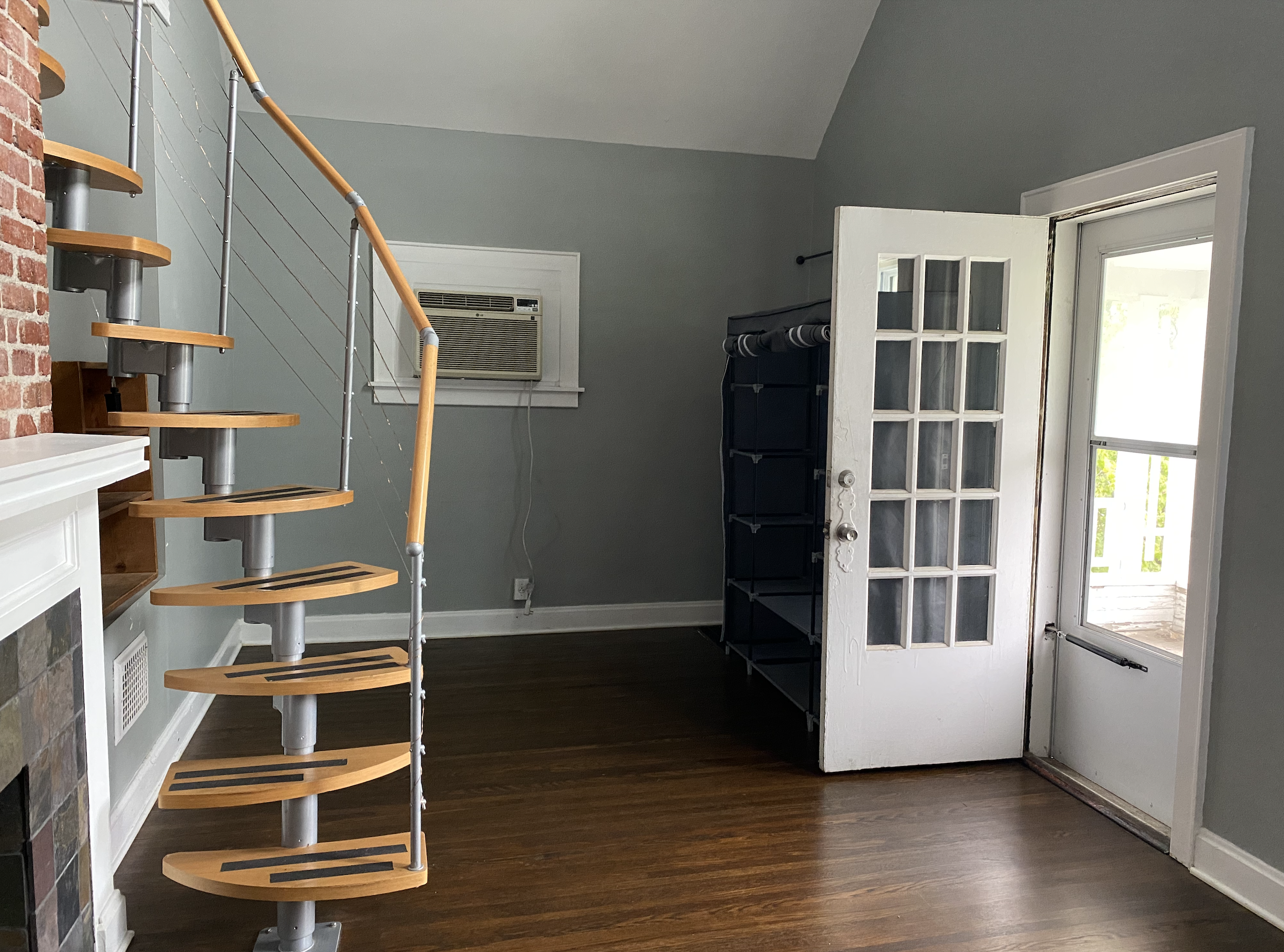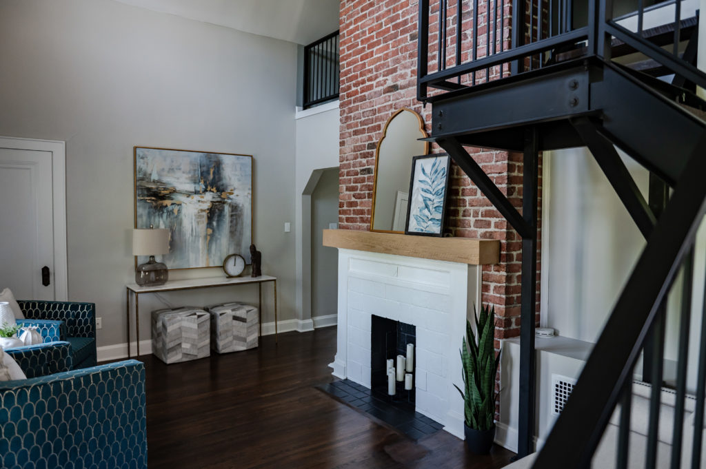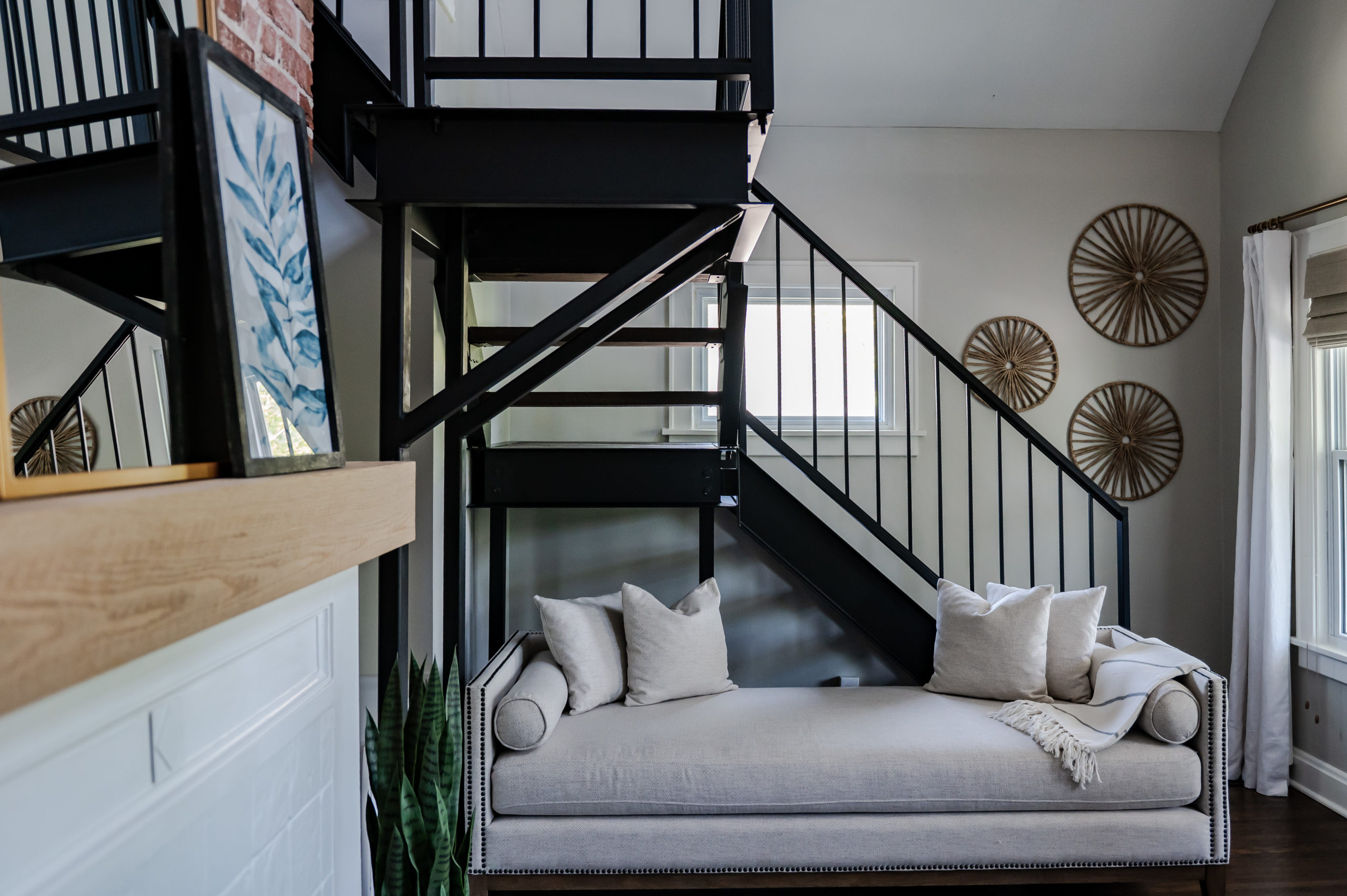 The biggest change in this room was the staircase that now features a sturdy design and beautiful wood treads. Erica added fun accent furniture that allows for a cozy seating area around the original brick fireplace, updated with fresh paint and a wood beam mantle. All topped off with a statement chandelier!