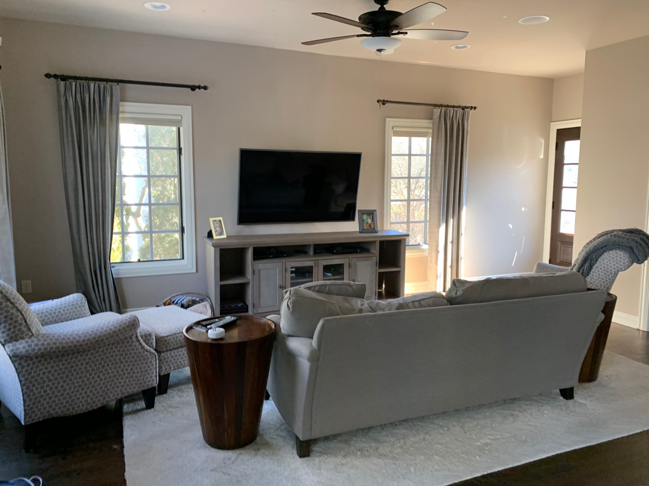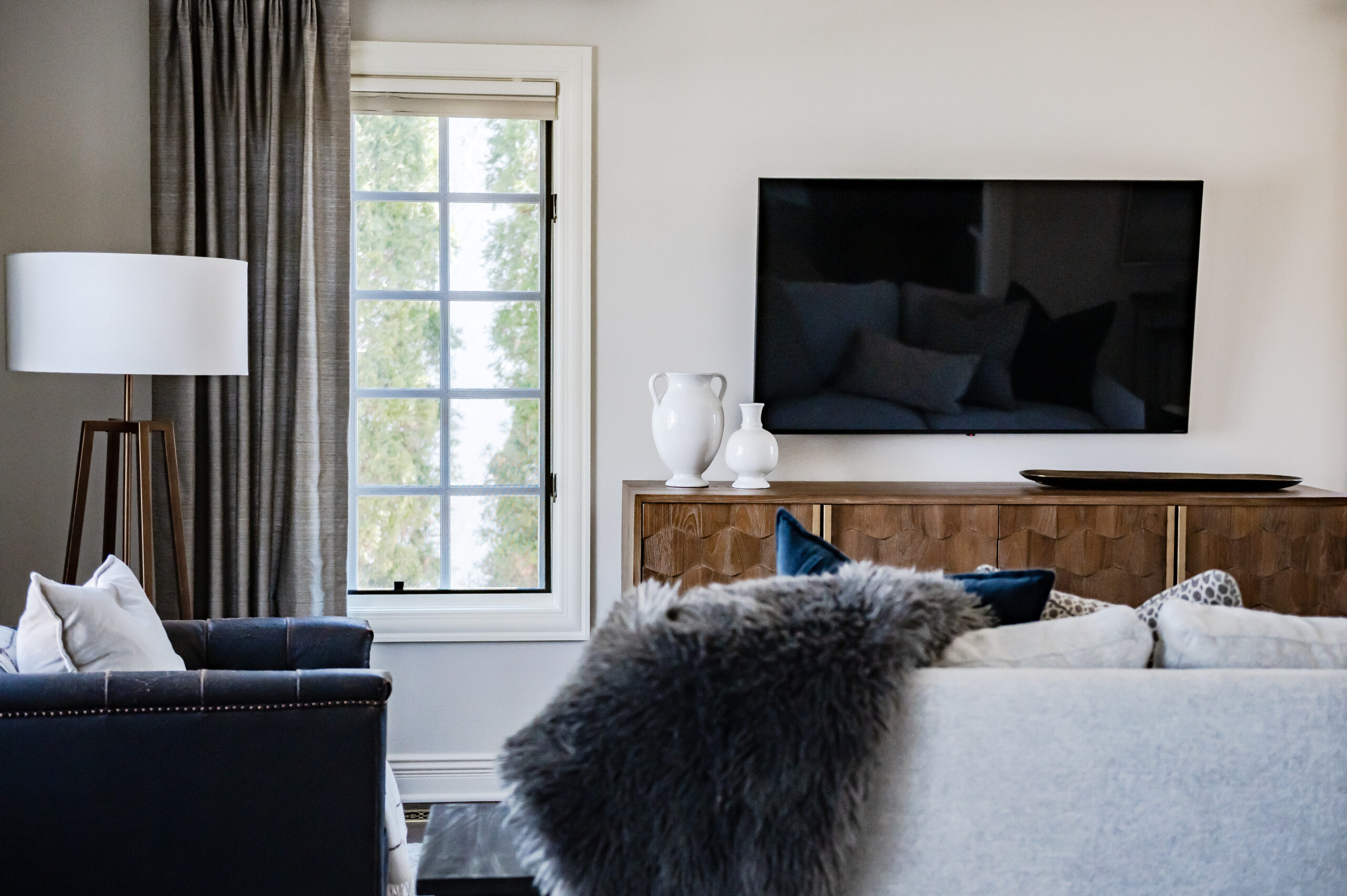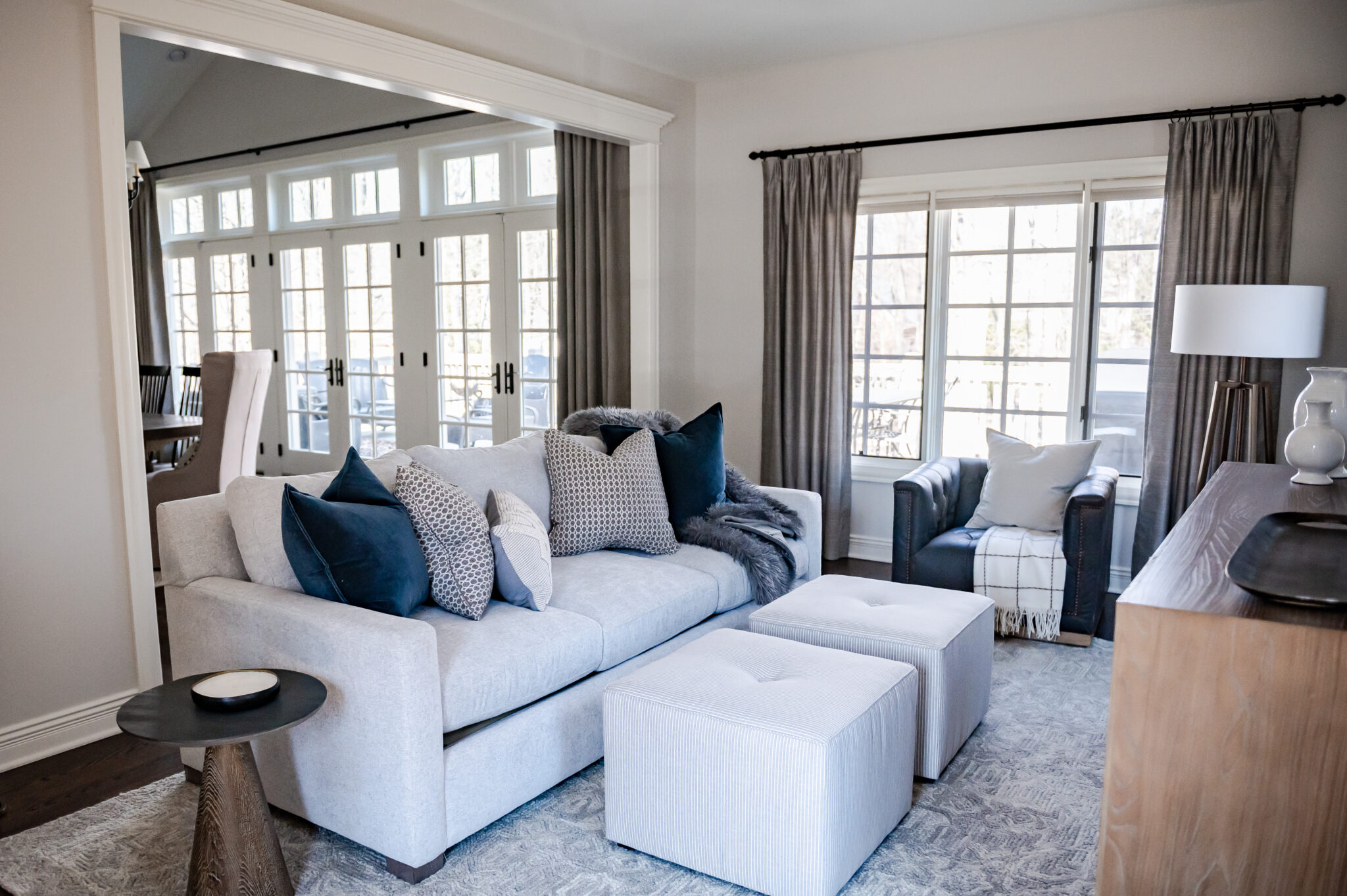 Beth gave this family room a face-lift with new furniture and updated window treatments. She brightened up the space with lighter fabrics and textures as well as introducing pops of color to balance and give personality. She was careful to carry surrounding furnishings from the kitchen and dining spaces into this area. This family room was transformed into an inviting space for her clients to enjoy family movie nights.Captured by Tammy Dean Media.