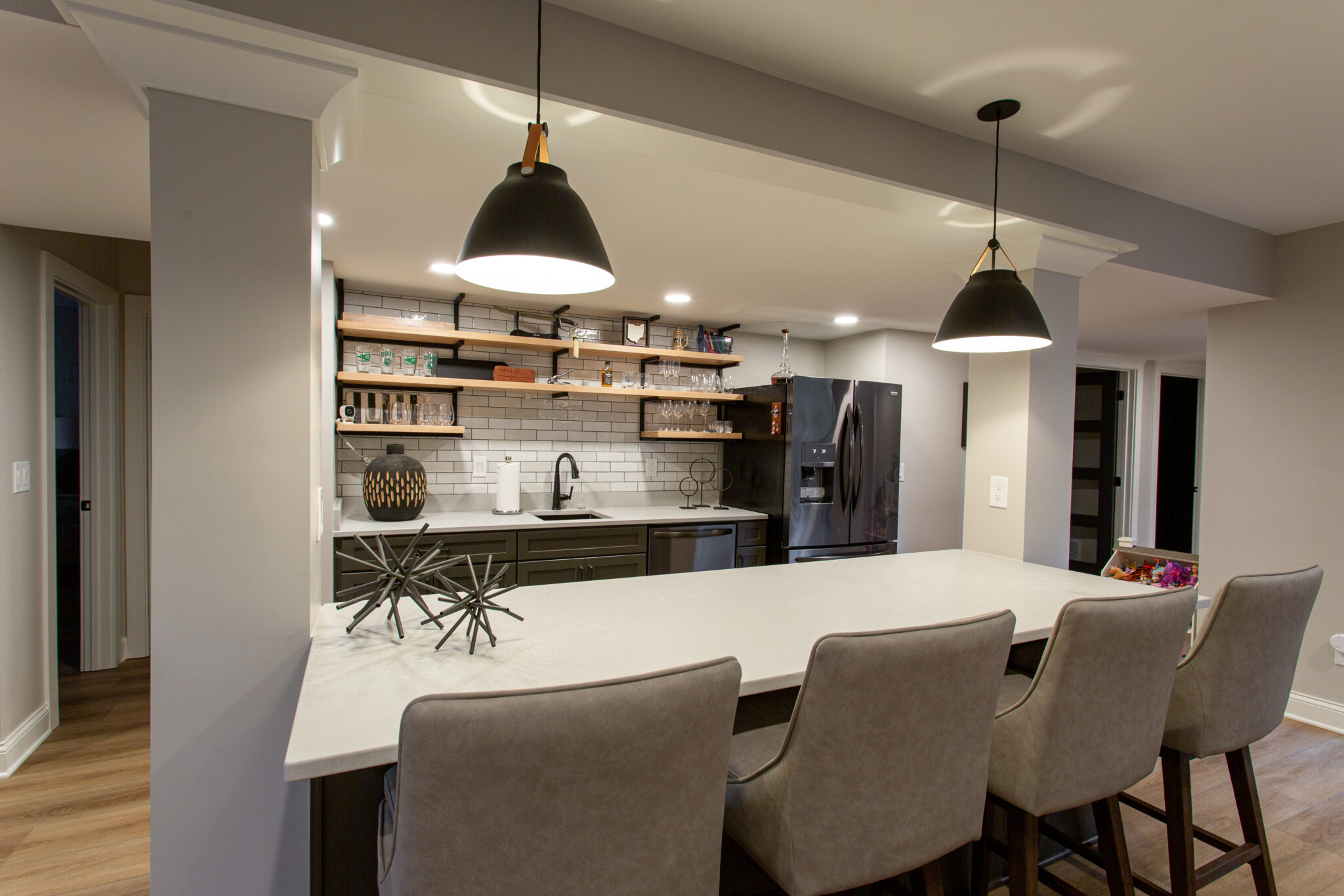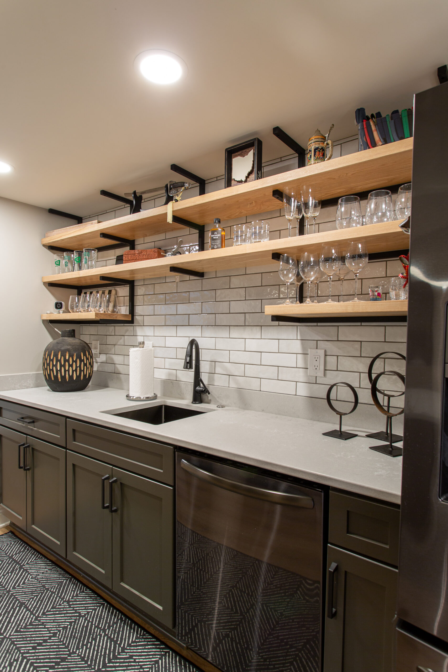 This client’s home was a new-build designed by Celeste. This open living space is an area the client wanted to be a casual entertaining space, but more dark and earthy than the rest of the home. The darker cabinets and lighting in the bar area is accented with wood and metal shelving to store glassware and décor. Celeste designed custom wine storage that was lighted with black metal and glass doors to accent the space.
