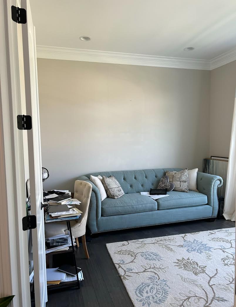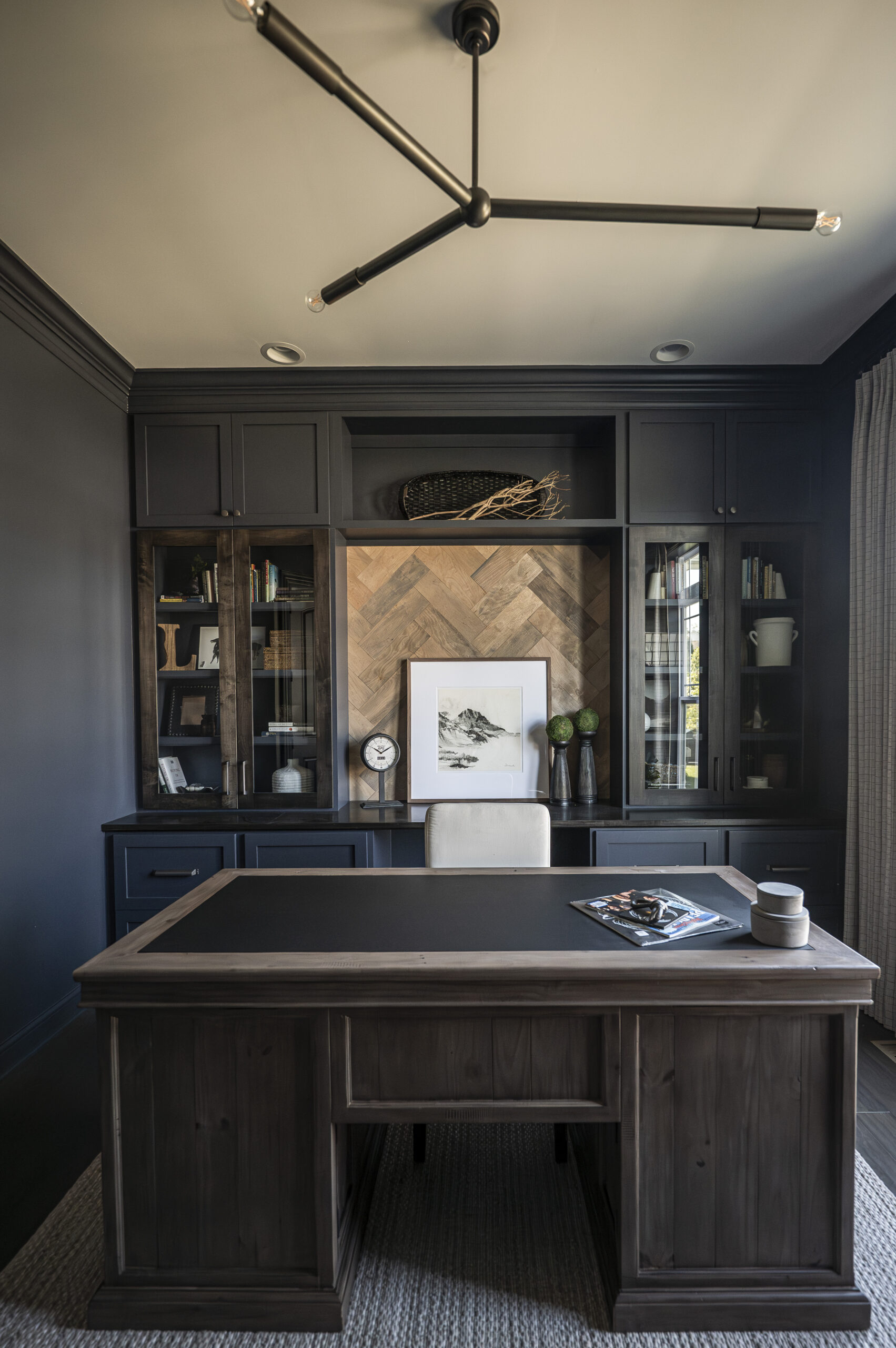 The office was updated with a more masculine vibe. Erica color drenched the space in a deep navy and added custom built-ins. Hidden storage is paired with accessorized shelves and a wood herringbone accent in the middle. New lighting, furniture, and custom window treatments complete the space.Captured by Tammy Dean Media.
