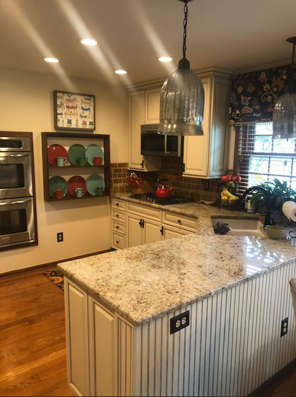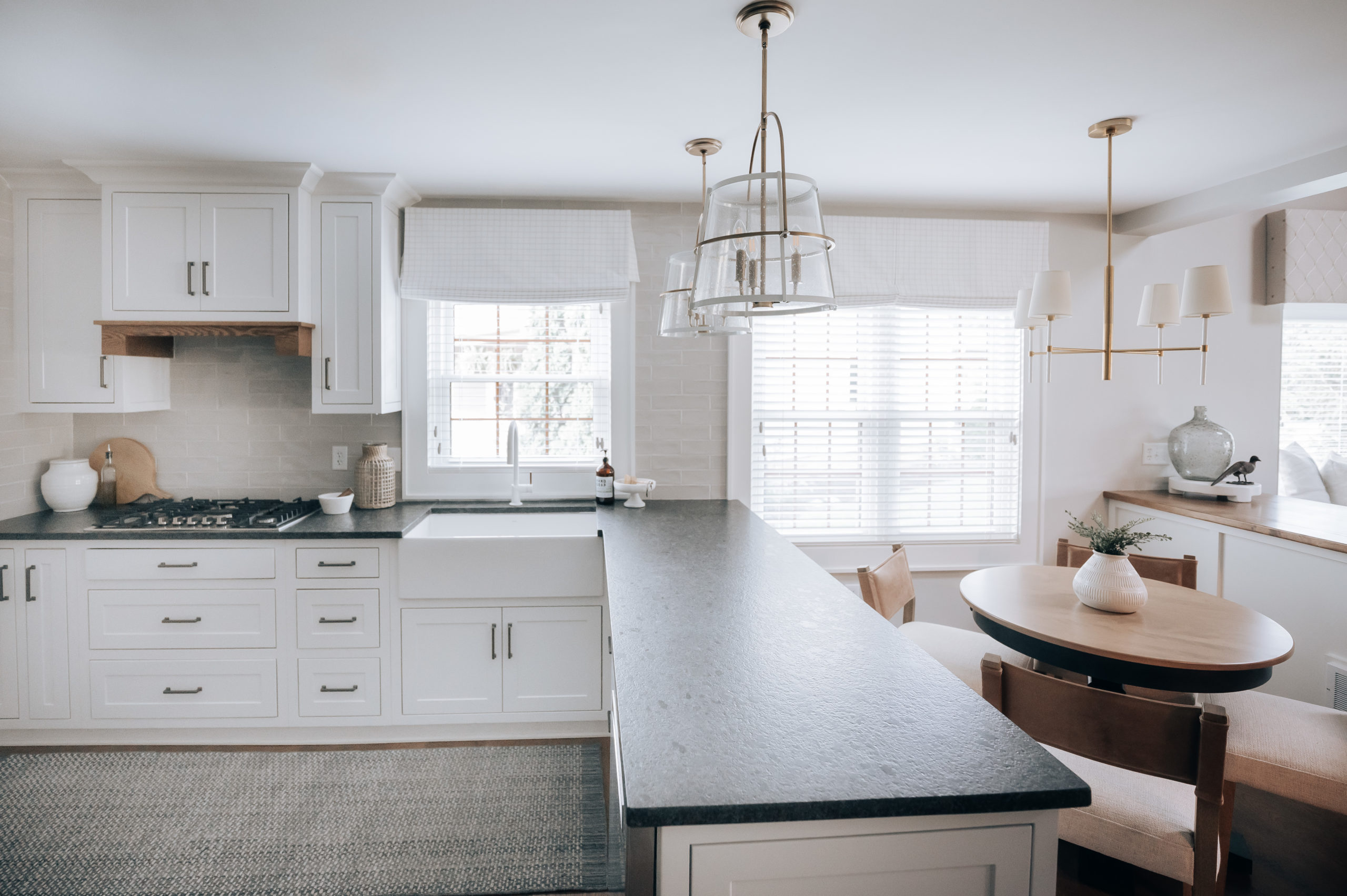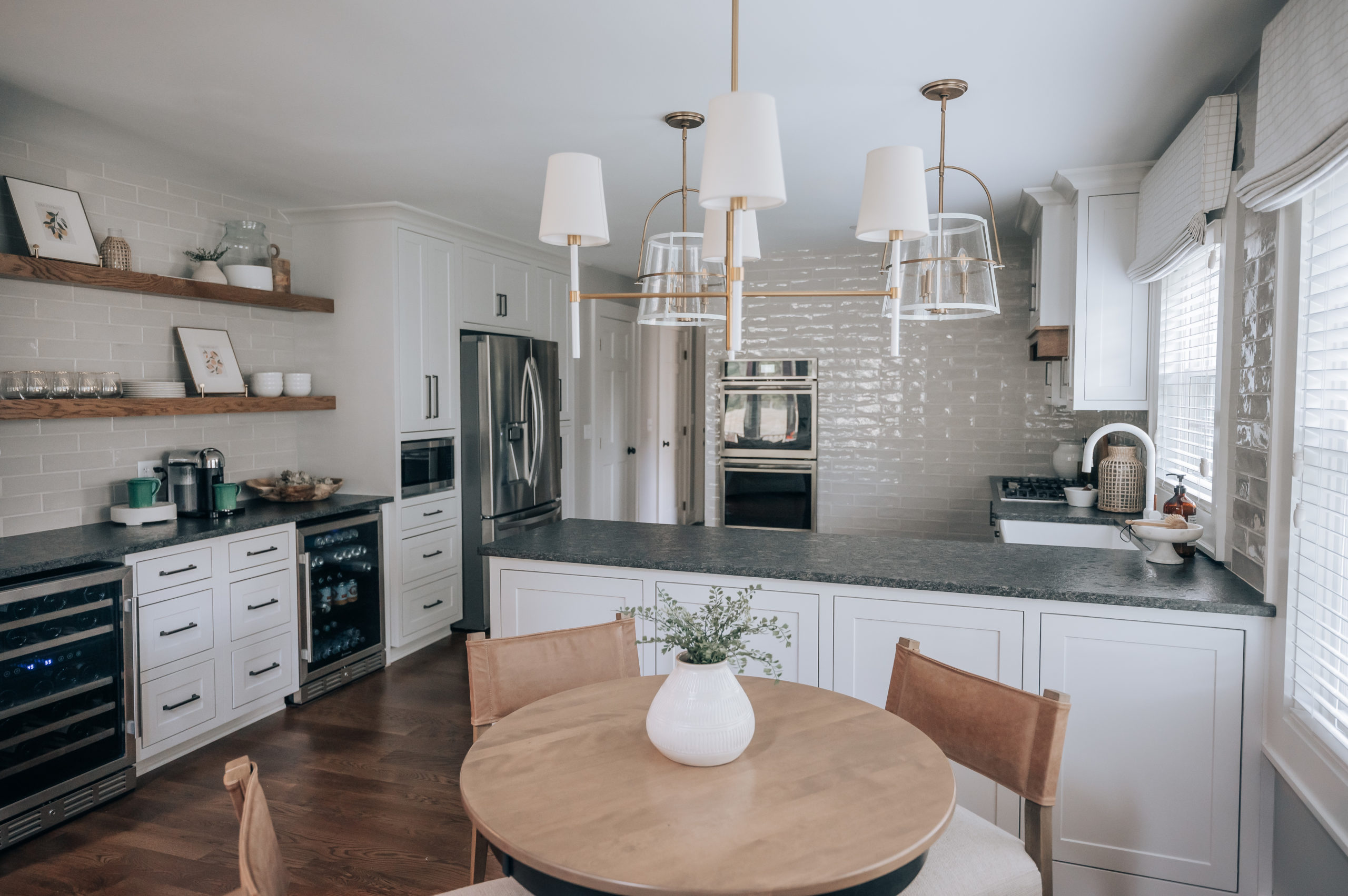 This Dublin kitchen received a much needed update creating a bright space with added functionality for cooking and entertaining. The leathered countertops and statement tile wall add textural interest to the space paired with the clean lines of the apron sink and matte white faucet. The updated lighting gives ample shine and makes the space feel more open and airy than before. Michelle added function to the space by converting the unused desk to an efficient bar with floating shelves. The colors were kept clean and crisp with pops of earthy stained wood within the range hood, floating shelves and accessories.