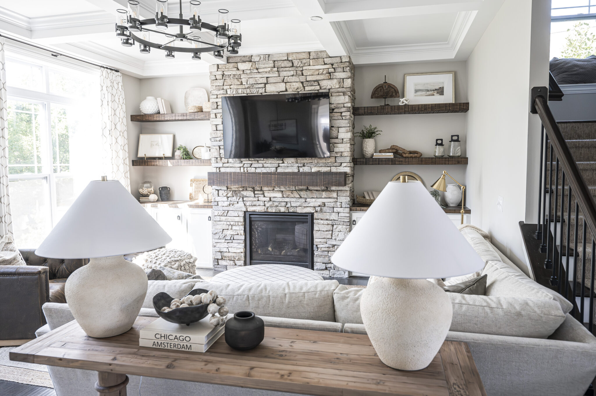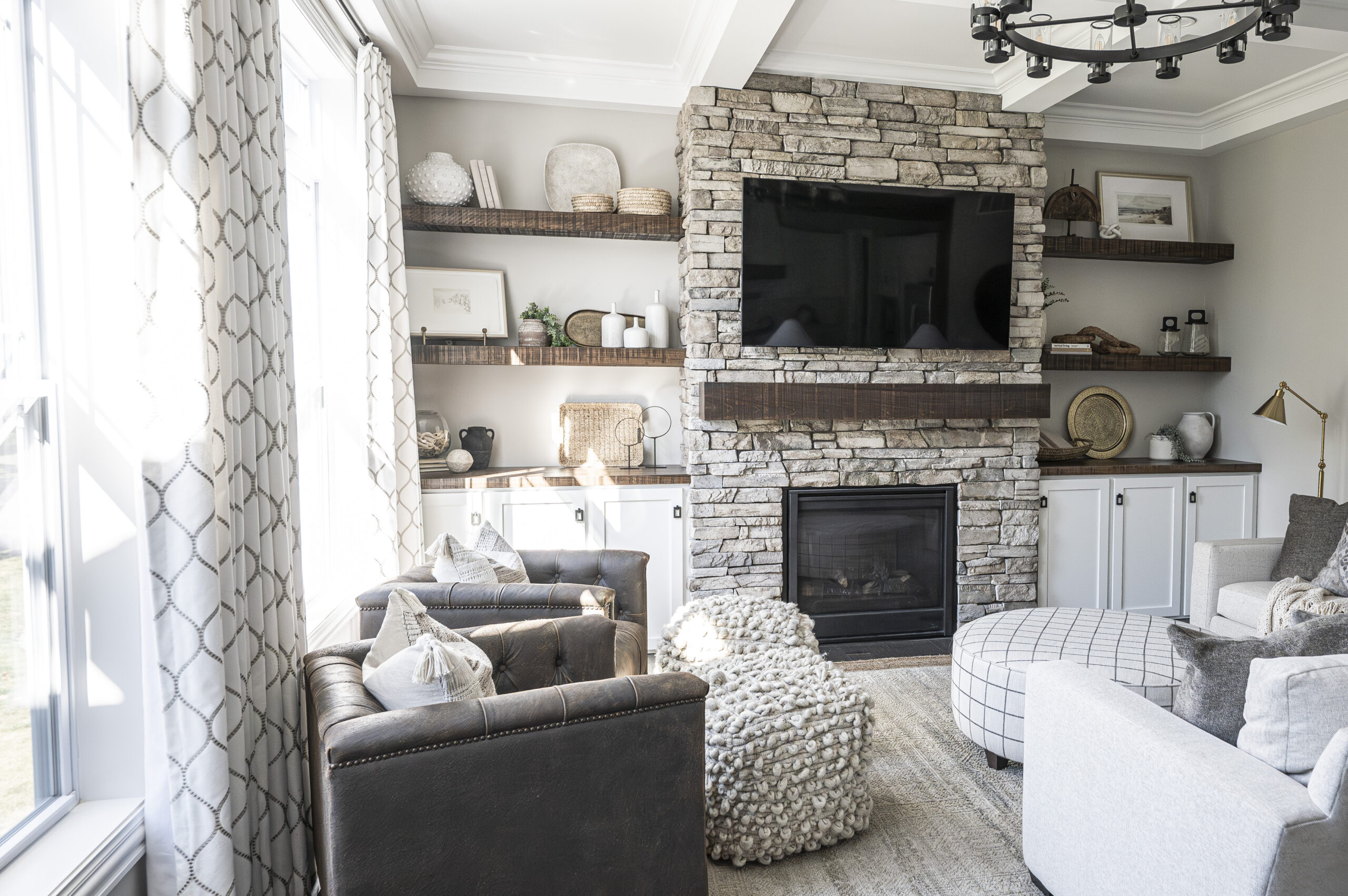 The family room got a face lift with custom window treatments, lighting, new furniture, and a stone fireplace with built-ins. Erica added a wood casing transition between the kitchen and family room which coordinates with the range hood, mantle and floating shelves. The fireplace wall is now a main focal point when you walk into the home and adds texture with a cozy feel.Captured by Tammy Dean Media.Special thanks to Hamilton Parker, Huntington House, Norwalk, Four Hands, and Surya.