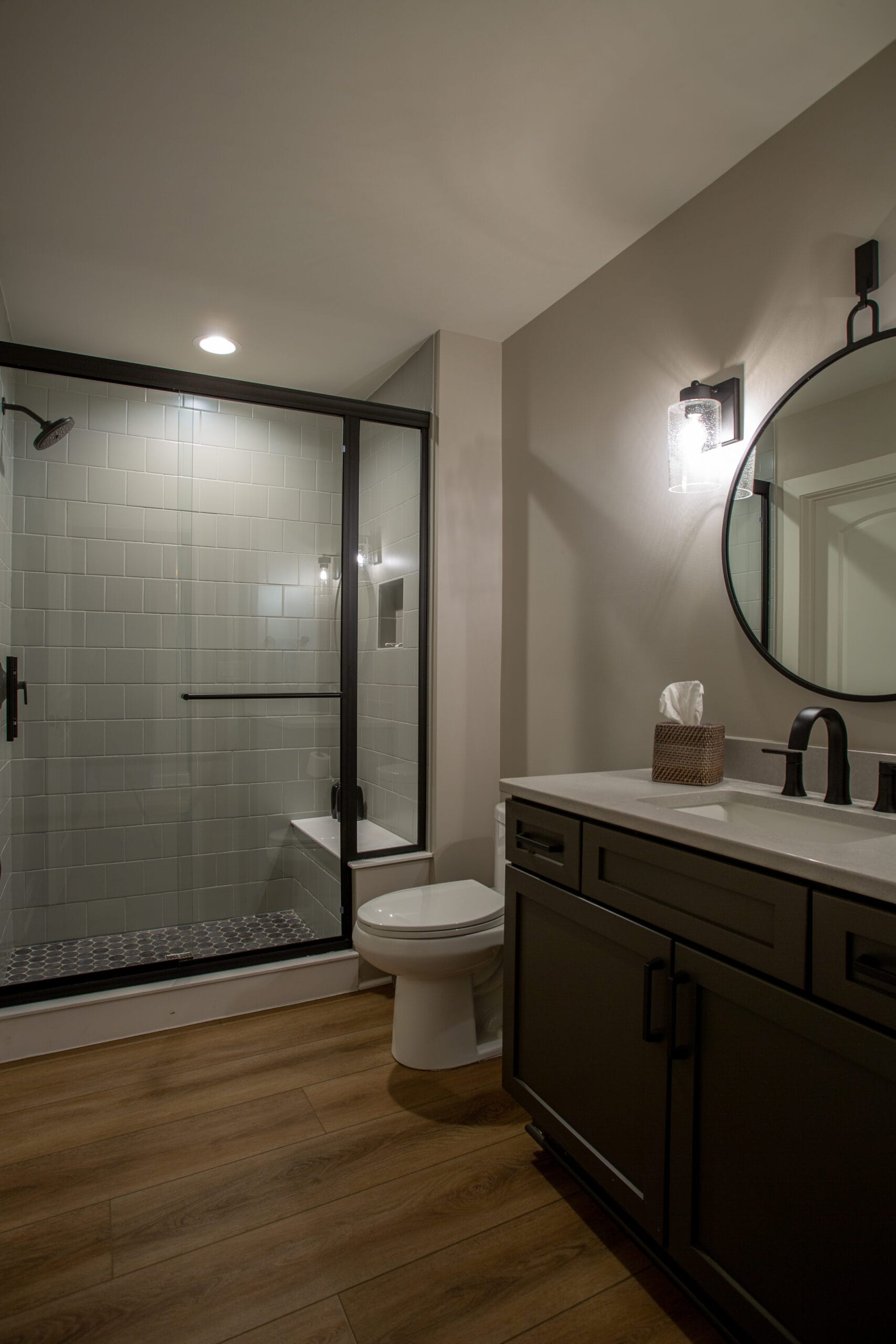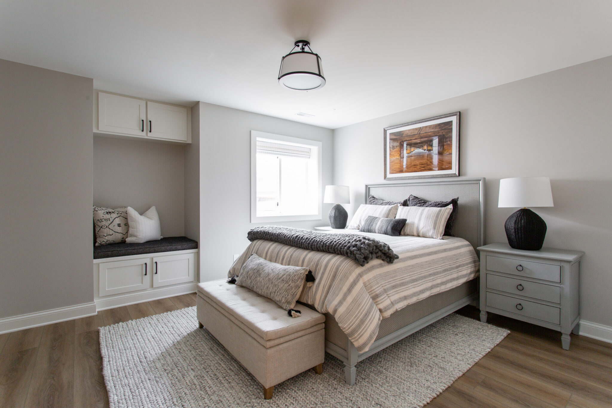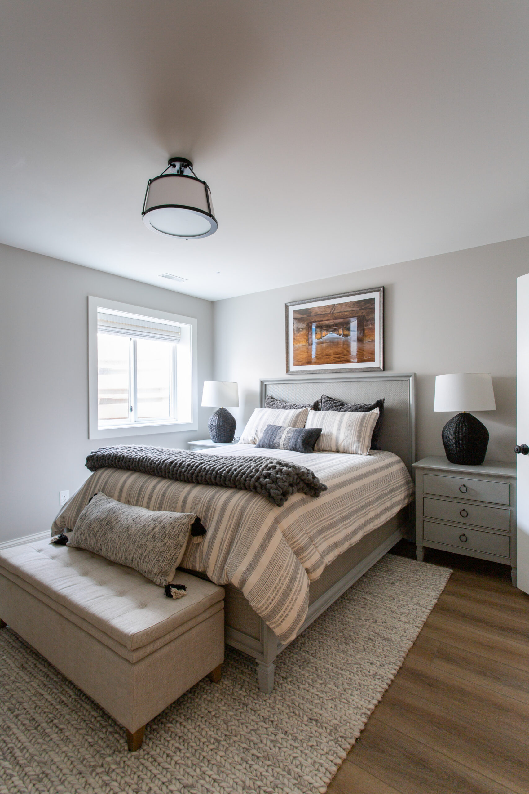 This client’s home was a new-build designed by Celeste. As this bedroom is off the darker-toned basement living space, the client wanted this bedroom to be a continuation of the same color palette. Celeste used gray, cream, and black tones to continue the colors from the basement living space, layering textures for a cozy feel. She then added coastal wall décor that was sentimental to the family. Celeste carried these earthy elements into the adjacent lower level bathroom.