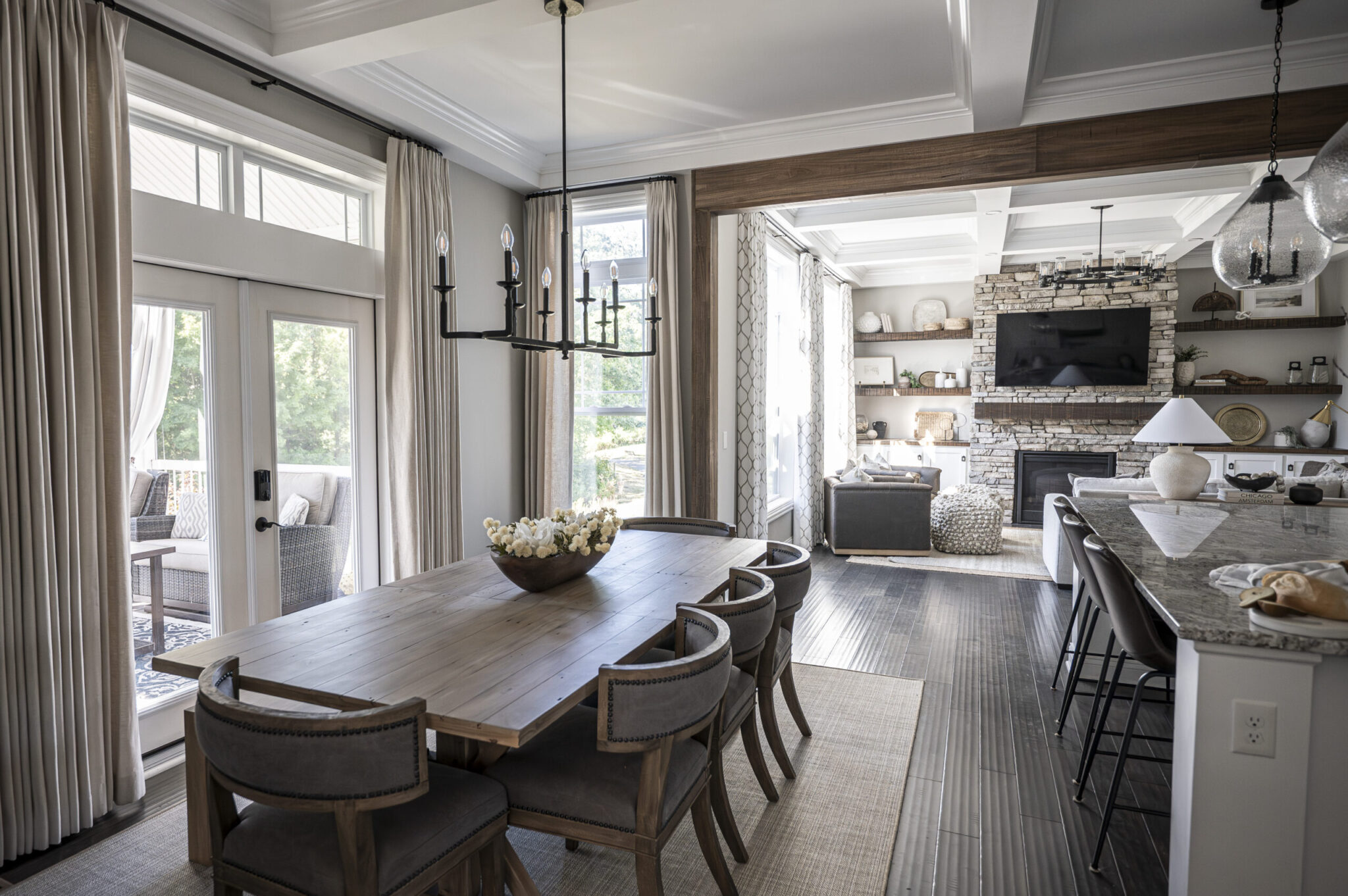 We added some upgrades to this kitchen without having to do a full remodel. A brighter updated backsplash, pot filler, fresh paint, and new lighting were some of the additions. Erica also did a custom range hood that really elevated the space. A larger dining set and new lighting paired nicely with the updated kitchen.