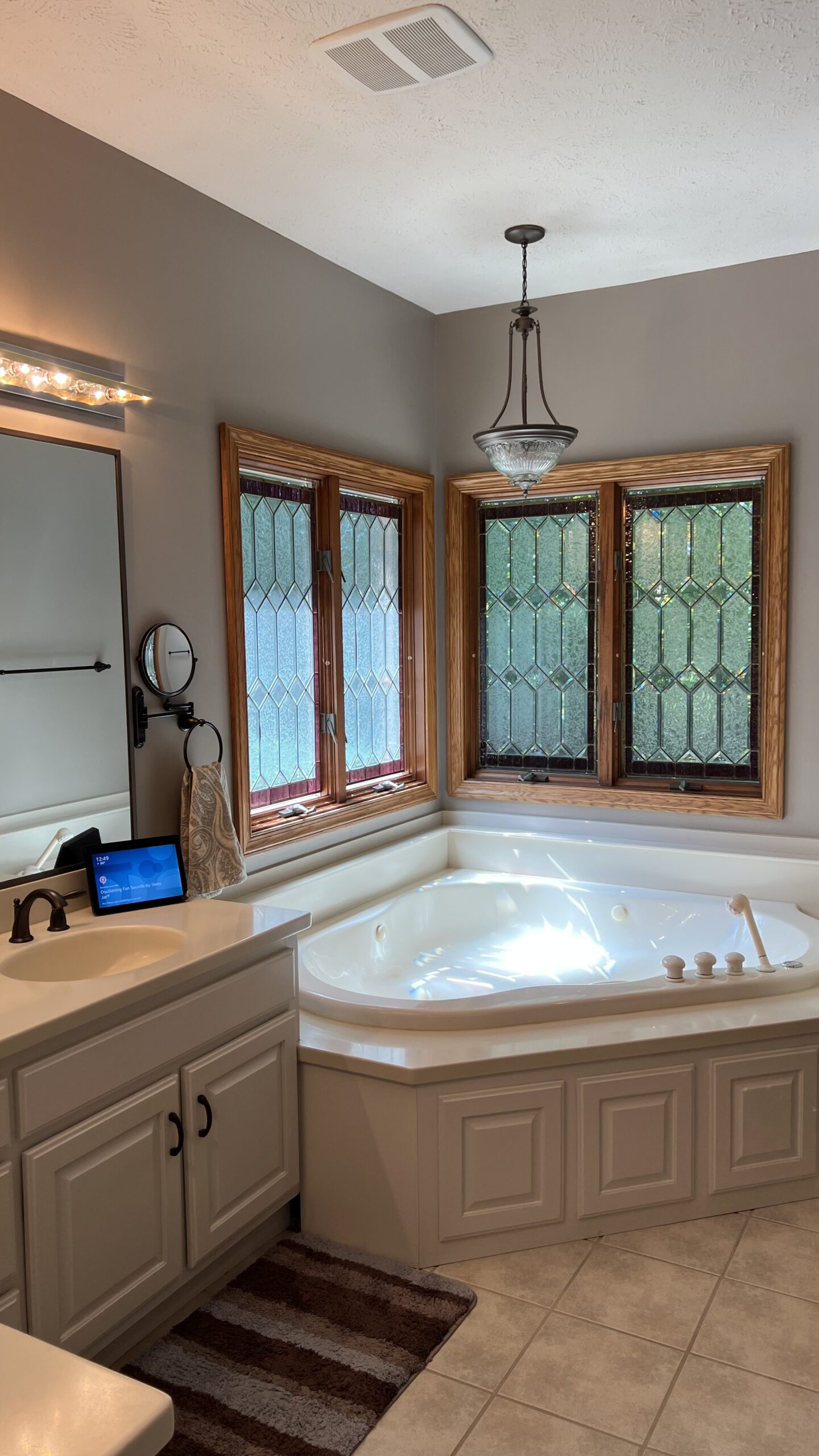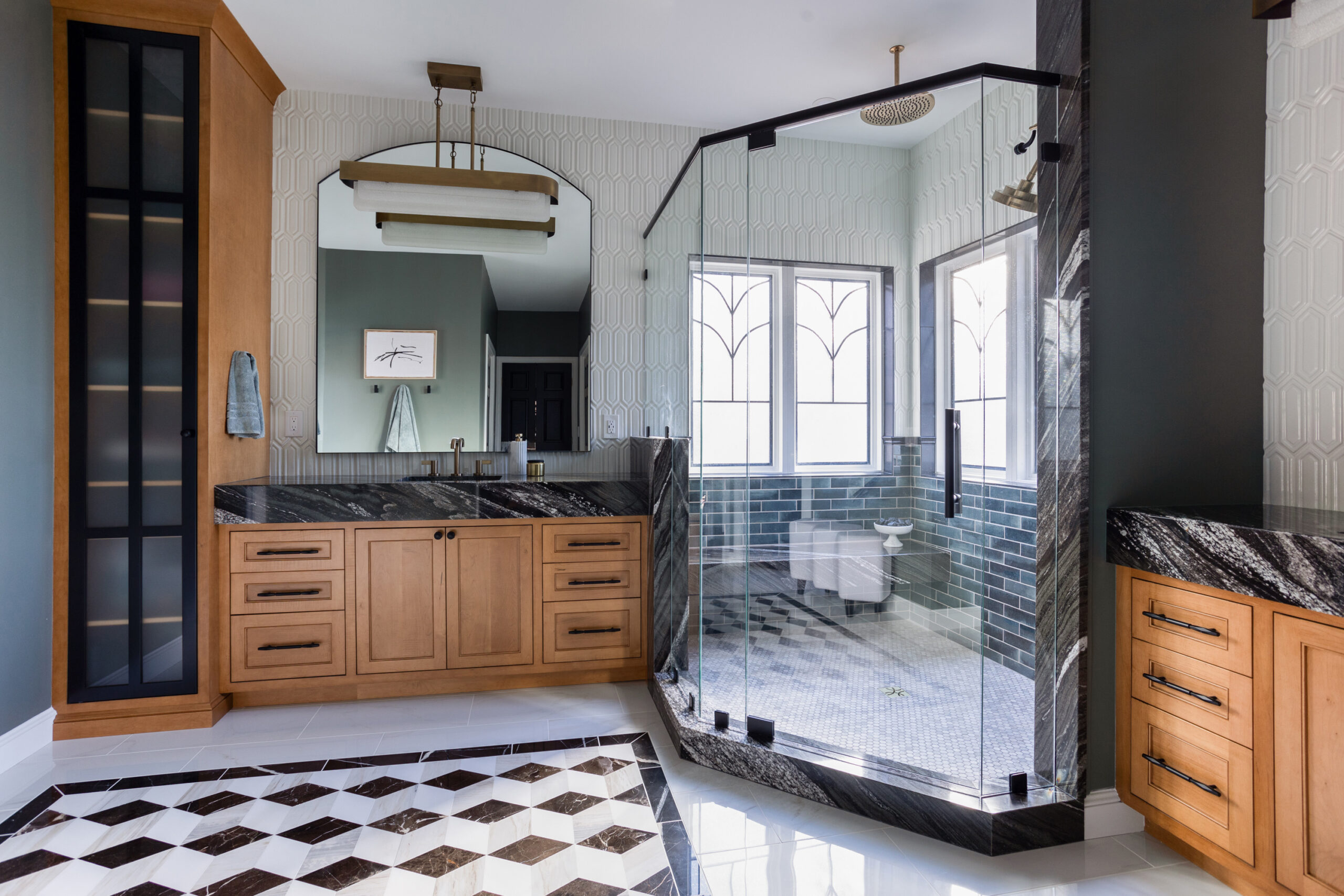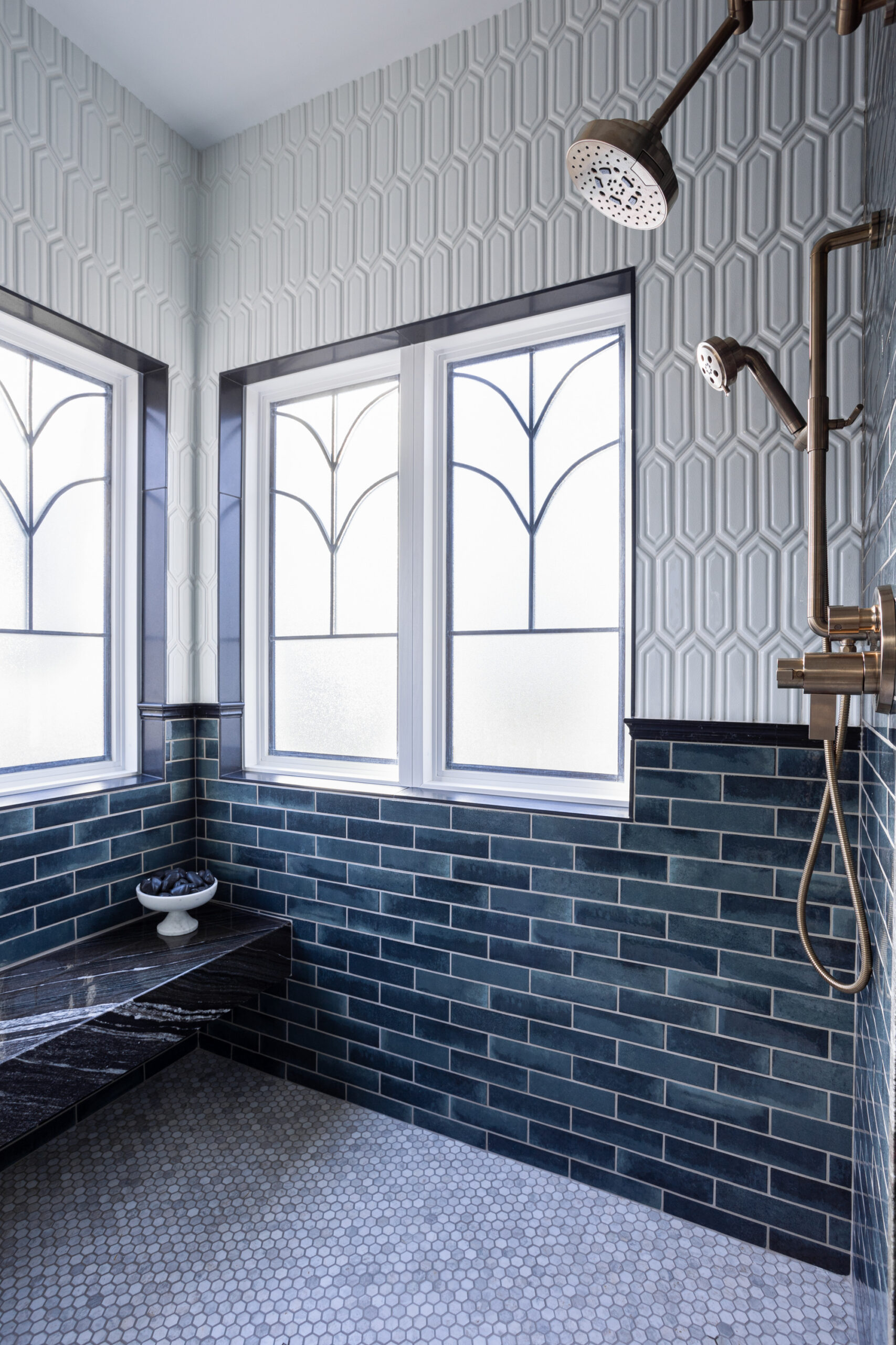 Through use of multiple materials and their clients’ eclectic style Audria and Holly brought in elegance to balance the more masculine organic style. They did this by using neutral dimensional tile paired with color saturated materials, thick slab countertop, and custom cabinet design. They also used textured pattern wallpaper to add dimension in the toilet room.