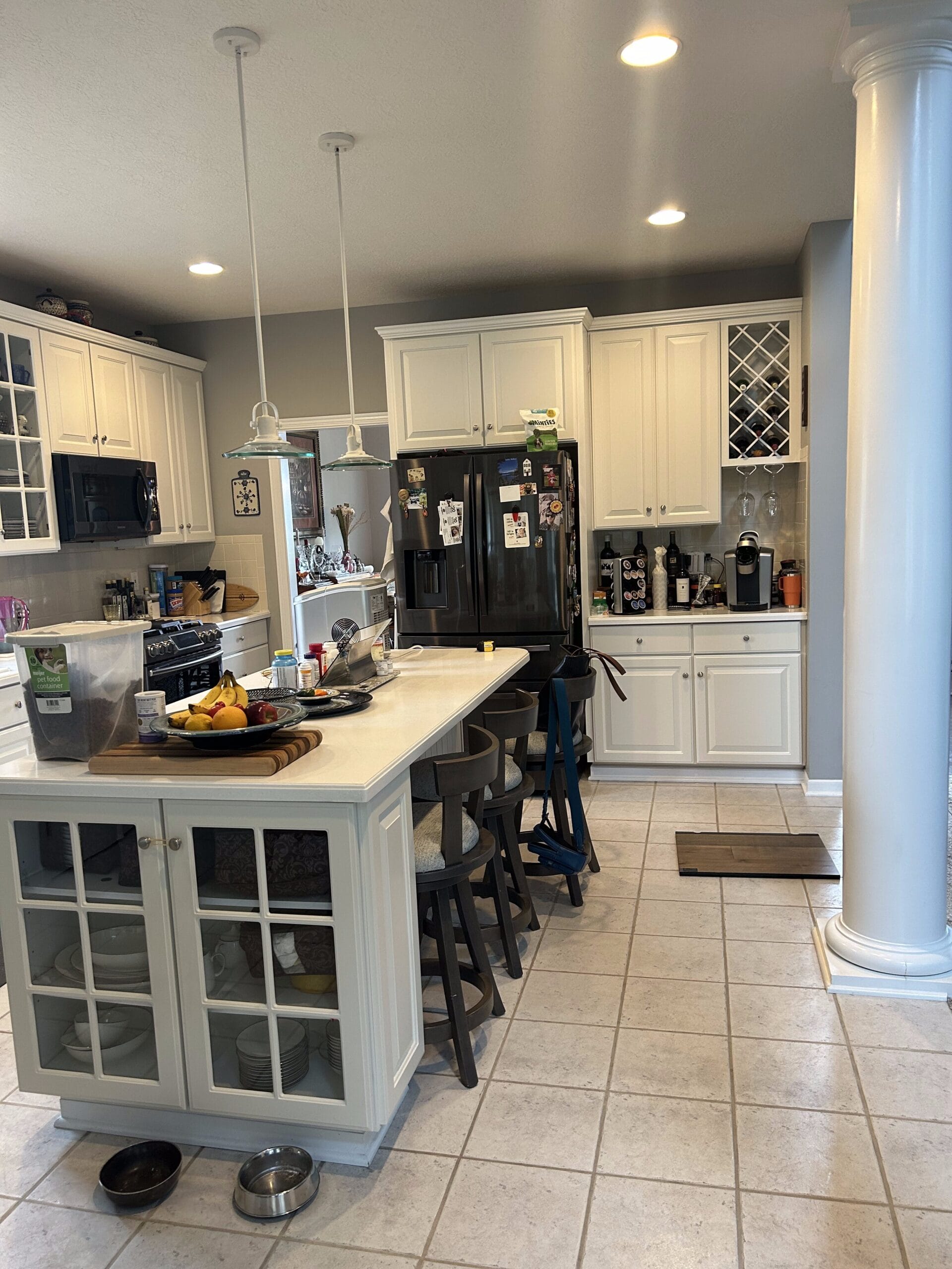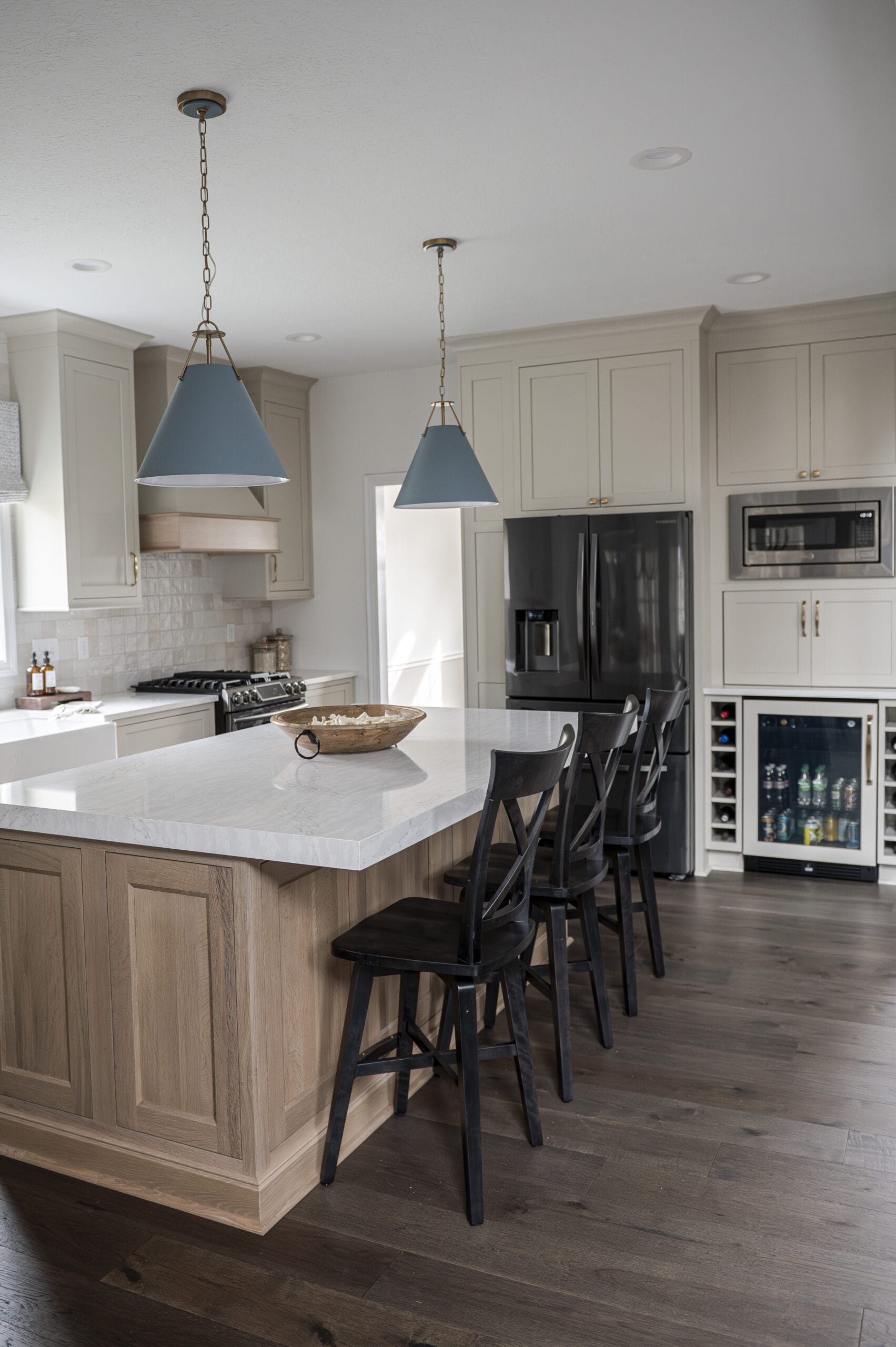 The biggest change in this kitchen was removing the dated columns to open up the entrance into the kitchen. We changed to hardwood flooring throughout the first floor, expanded the island a bit, but otherwise kept the same footprint. Erica created a beverage station with a wine fridge and hidden area for coffee. She also utilized the extra space by the fridge for a skinny cabinet to house spices and a step stool. The white oak island showcases a mitered Cambria countertop and warm gold accents complement the wood. The blue pendants add a pop of color and coordinate with the custom window treatments.