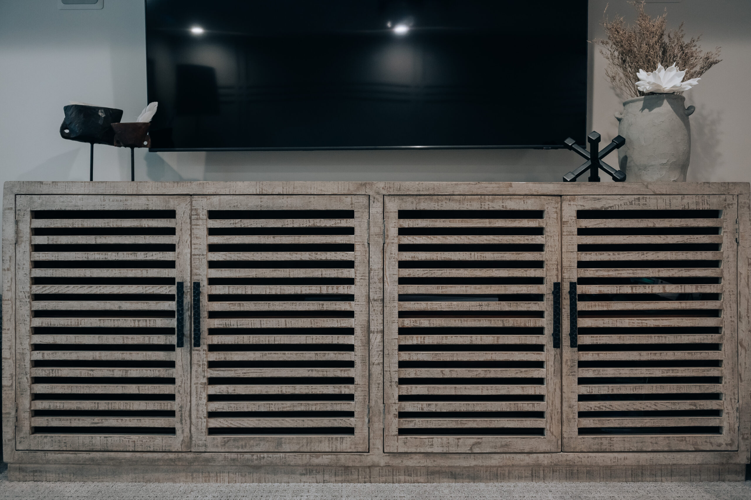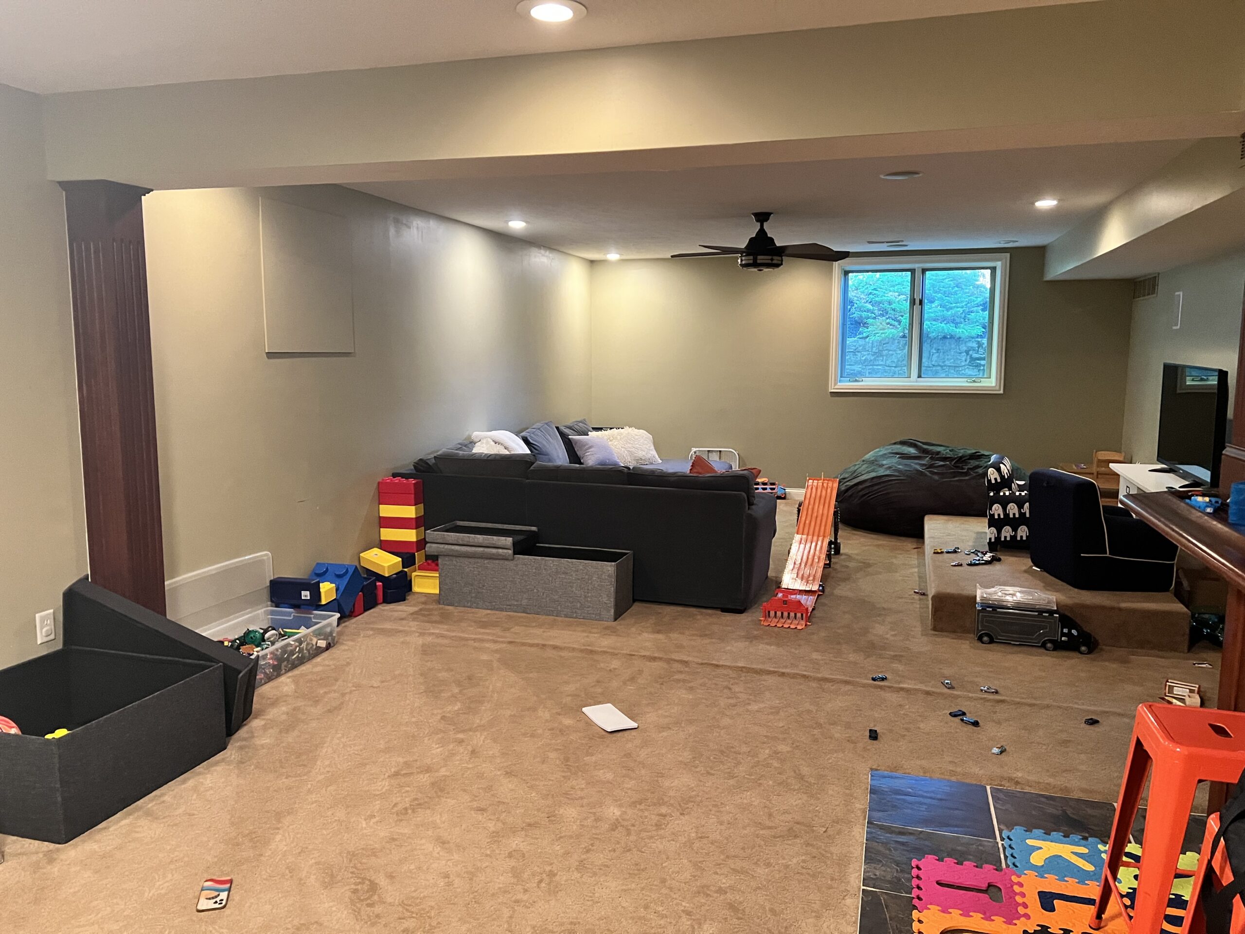 Chesney identified uses for all of the spaces within the basement utilizing the existing layout. A once awkward space on the far side of the basement gained a built-in area for toy storage and gaming for the homeowners’ two boys as well as a built-in desk and art area. The bar received a makeover with new lighting, paint, hardware, and countertops. Chesney incorporated banquette style seating and a large round table as well as new comfortable bar stools for entertaining. The bar area opens into the family room which received a plaid trim detail wall, new carpeting, new lighting, and an oversized family-friendly sectional for movie nights in.