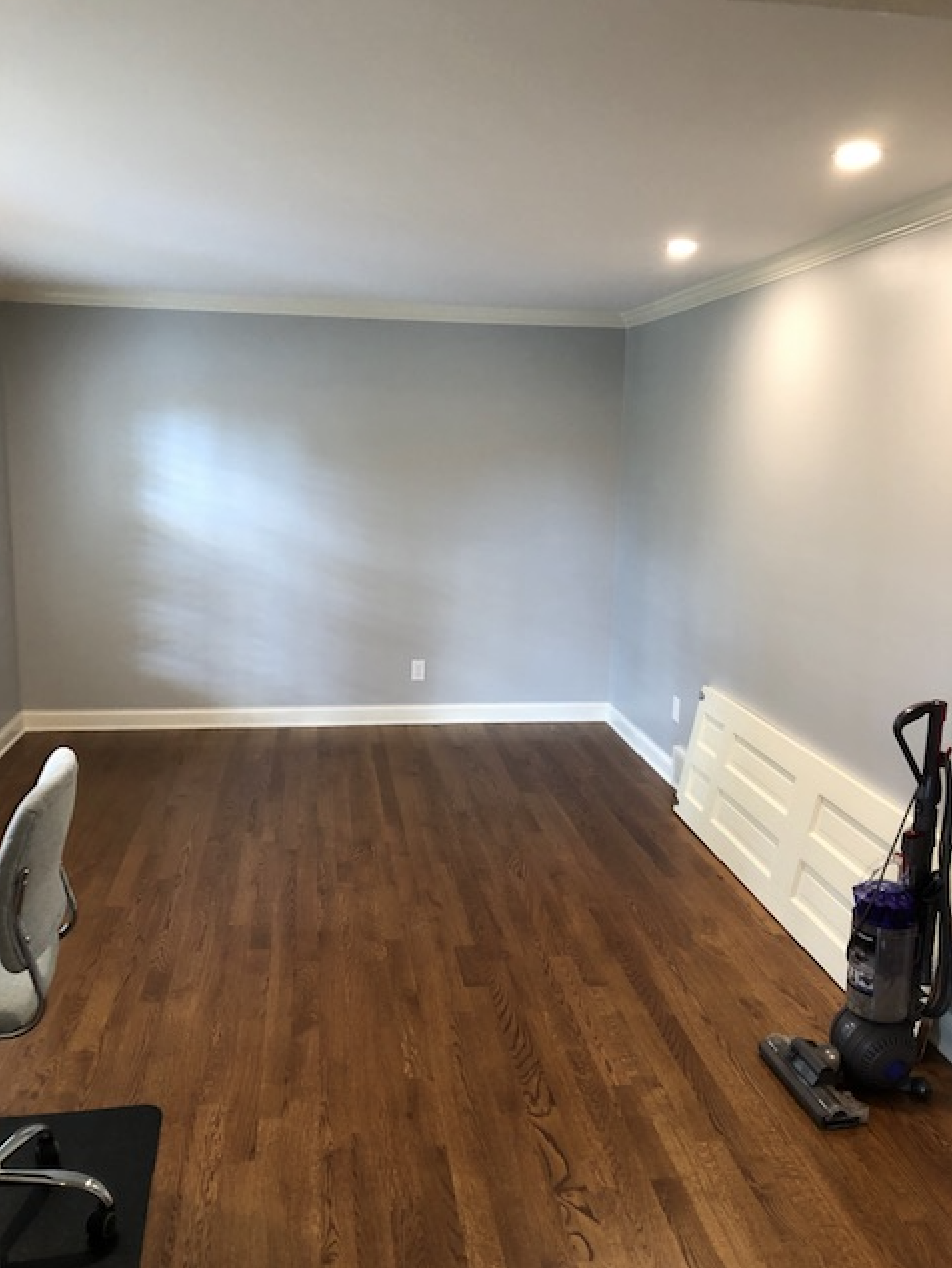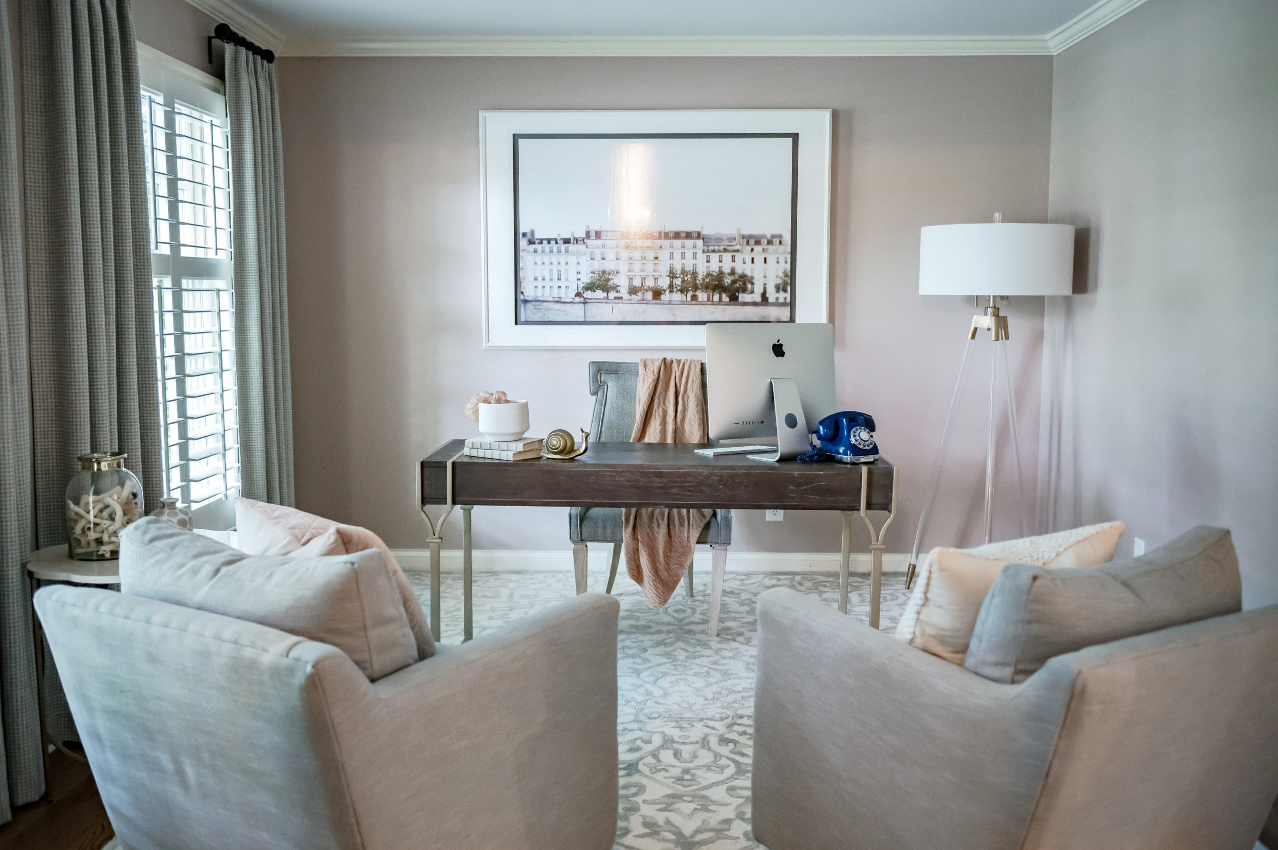 Michelle transformed this room from a blank slate to a home office which is not only gorgeous to look at but also extremely functional for the homeowner. The focal in the office is the dark wood writing desk and statement artwork on the back wall. Michelle incorporated a mix of textures and materials including velvet pillows, houndstooth drapes, marble top table, glass accessories and gold toned metals creating a cozy, sophisticated space for her client.