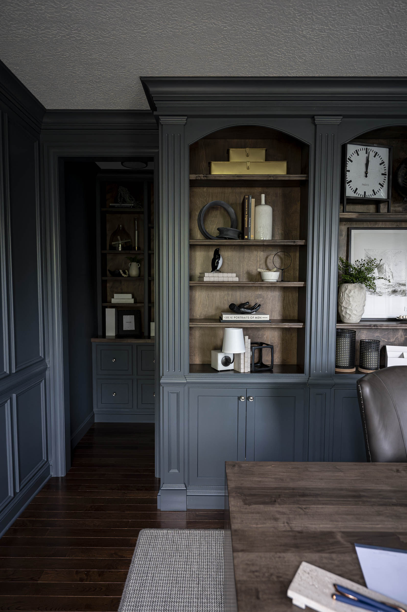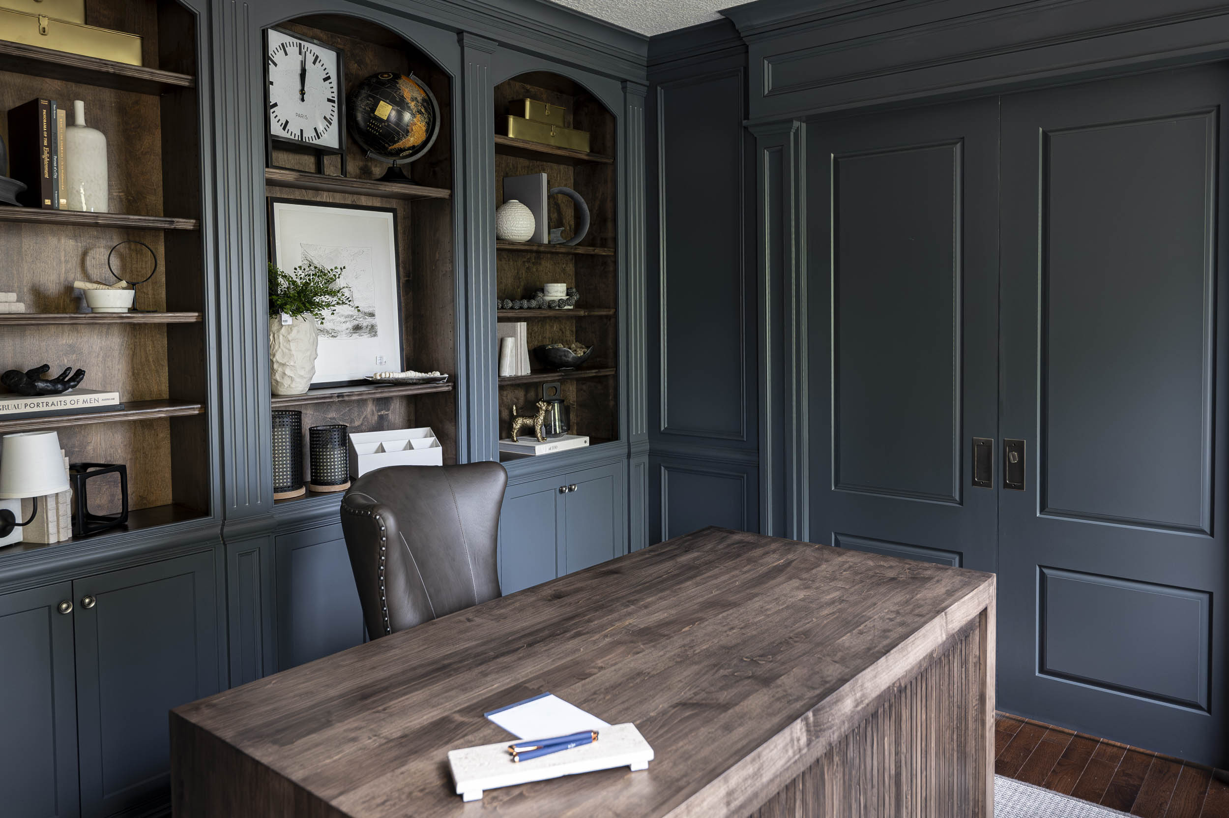 Chesney’s client works from home and was struggling with lack of storage and function in their office space. Chesney worked alongside the contractor to design functional storage with built-ins along the back wall as well as turning an unused closet into housing for the printer, modems, and other office equipment. Chesney designed a large custom desk for ample work space. The room received upgraded overhead lighting, a frame tv, and lots of added character with molding, trim, and a rich paint color. This in-home office is now fully equipped for success.