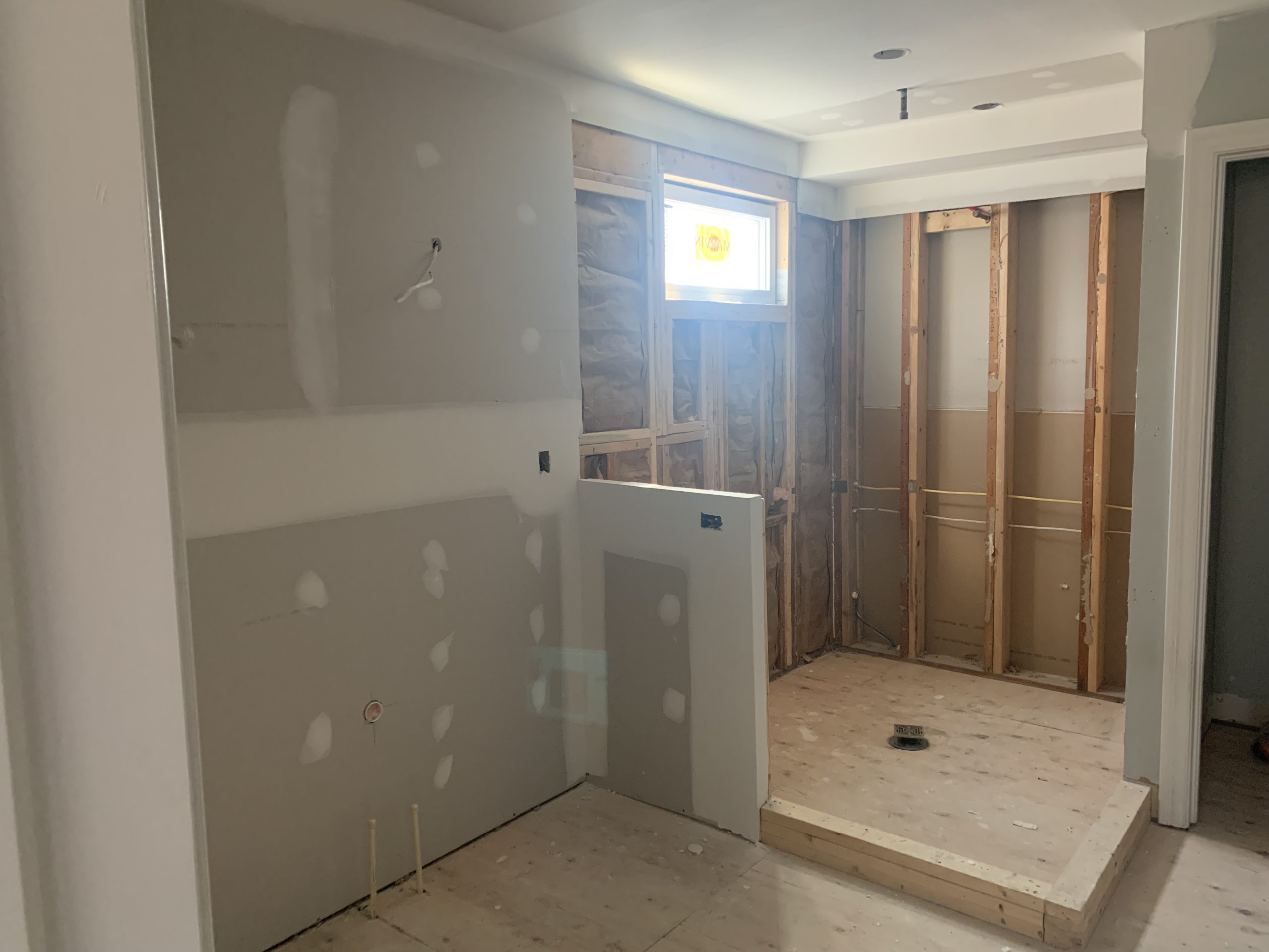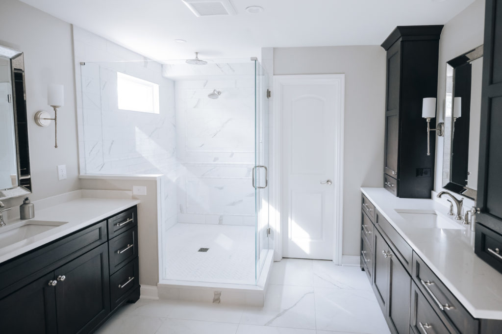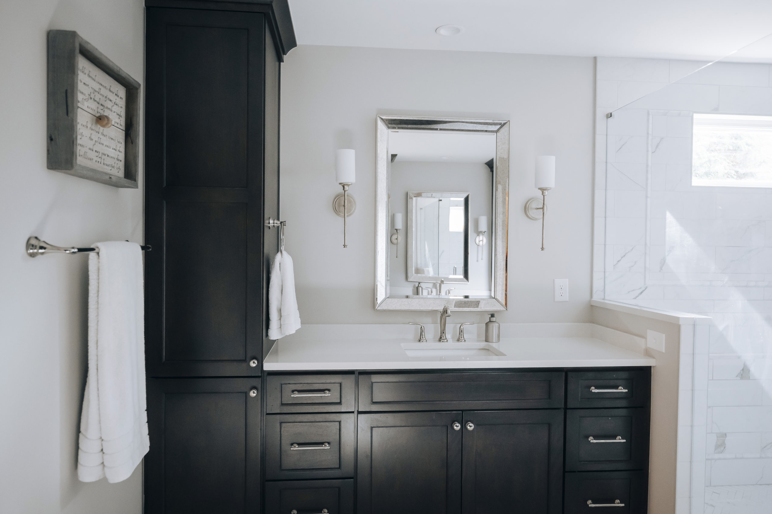 This space was reconfigured by removing a window and closet to create a large shower with a new transom window for natural light. The client wanted marble for the shower, so Deneen suggested a marble-like easy-to-clean porcelain. She added extra character and interest with pieces of molding throughout the shower. The dark cabinetry was a complete change from the white cabinets that were in the previous space, but Deneen kept the bathroom bright and welcoming with a new paint job, white countertops and porcelain tile floor.