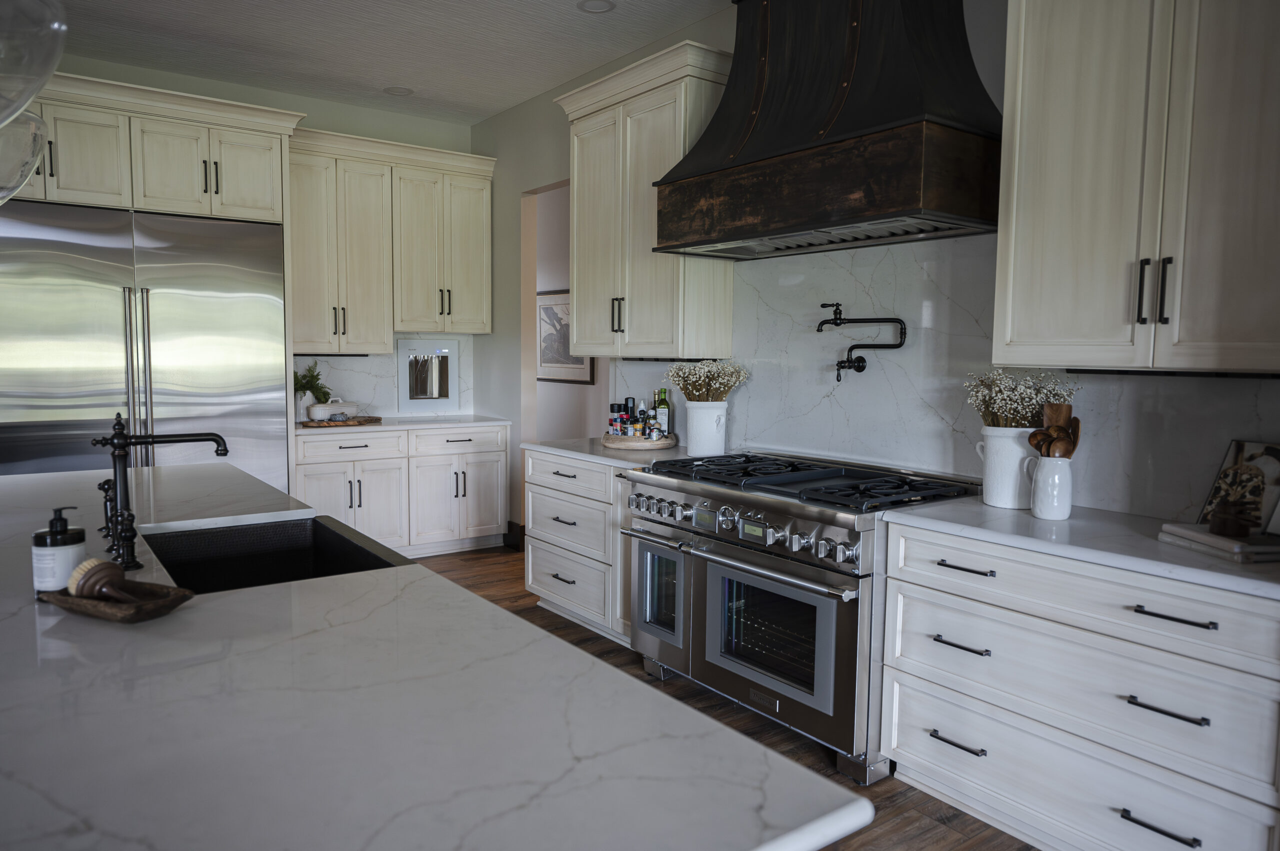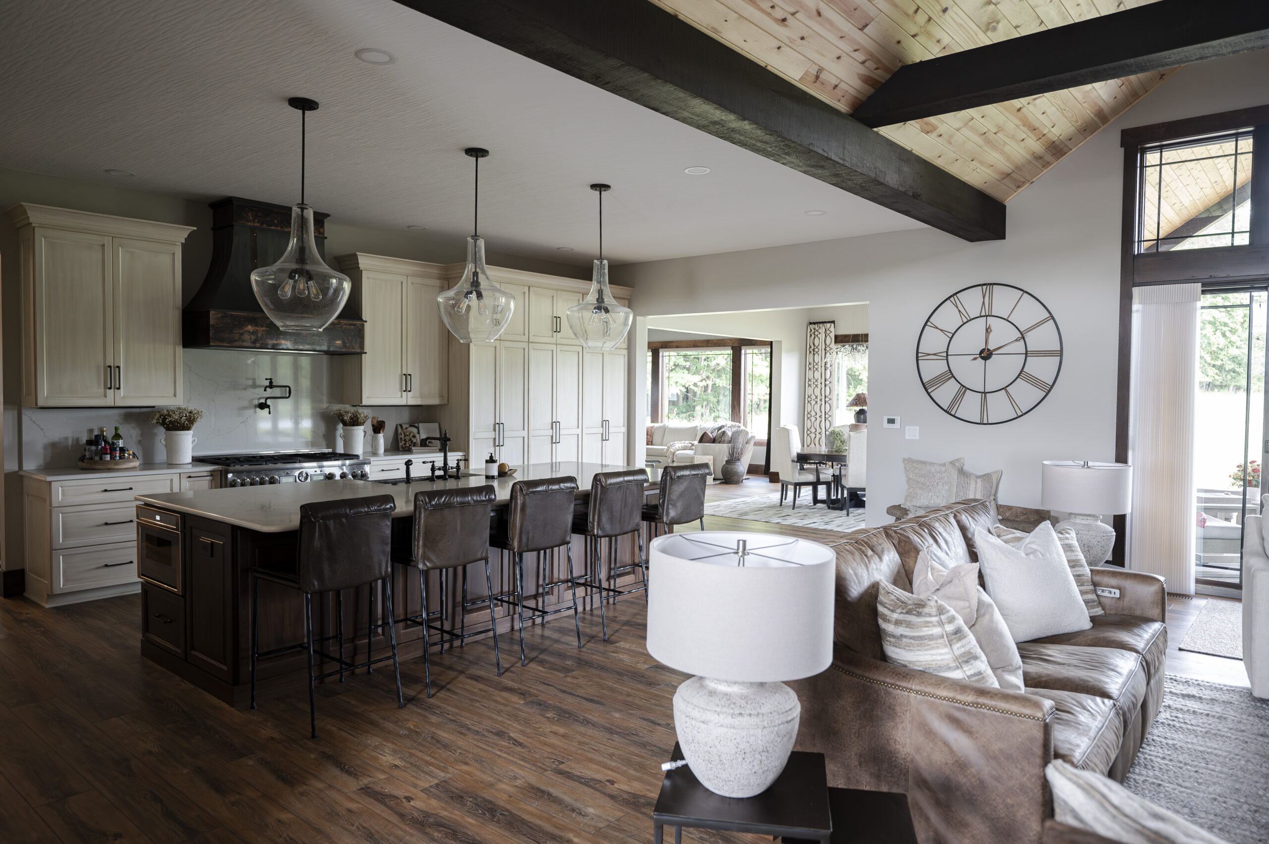 This top-of-the-line kitchen has all of the function and design needed for large family gatherings while still feeling cozy and intimate for everyday use. We used solid walnut cabinetry filled with a plentitude of accessories from pull down shelf units, tray dividers, drawer dividers, upper and lower cabinet lighting, and a full “messy kitchen” pantry hidden behind double doors. A hammered copper apron sink and distressed copper range hood are showstoppers in the kitchen making a statement and adding character through texture and finish. The quartz countertop and backsplash provide an elegance to the kitchen while pulling out soft ivory and brown tones throughout the space. We decided on seeded glass pendants over the island so as to not obstruct the view to the great room and completed the area with chocolate leather counter stools, wood, and textured pottery accessories.