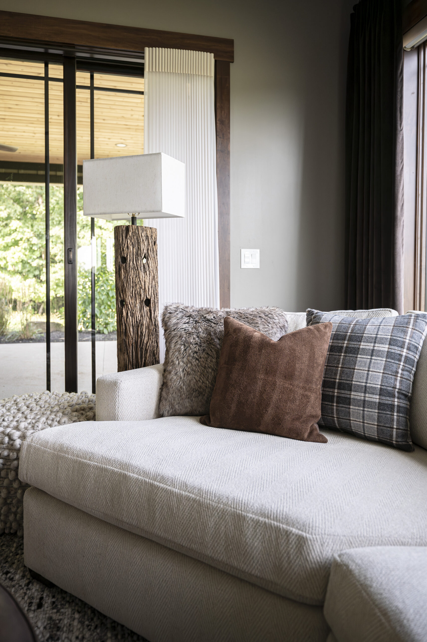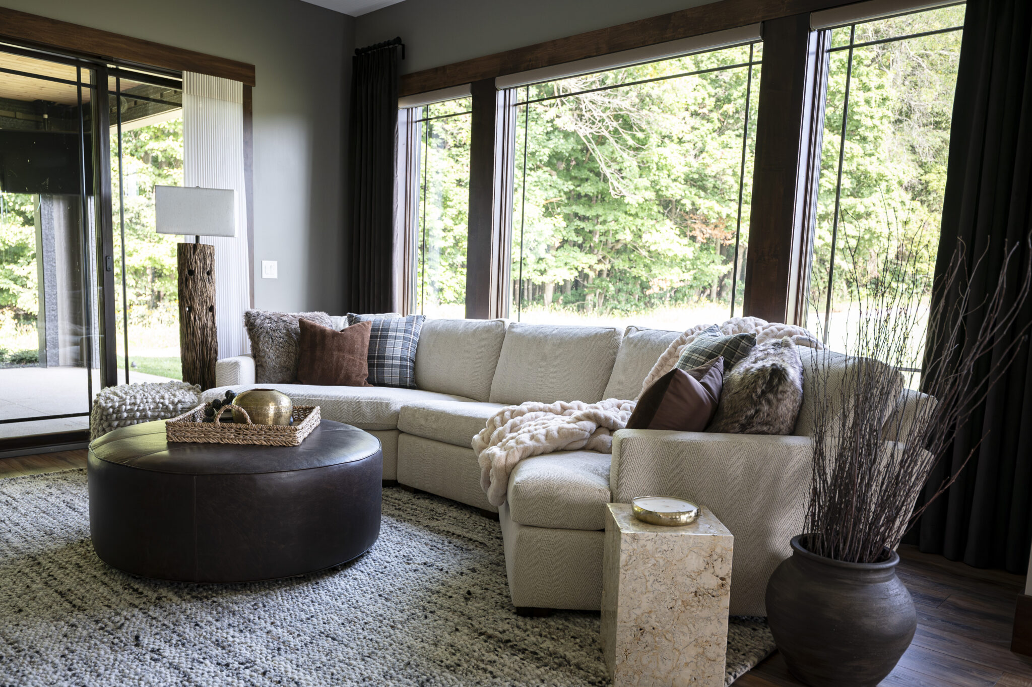 Overflowing with comfort and texture, this family room has become the ideal spot to relax and snuggle up to watch a movie. We chose a double cuddler sofa to optimize the space and provide the family with plenty of cozy seating. From the plush upholstery, leather cocktail ottoman, velvet drapes, travertine side table and thick woven wools, the room is filled with a mix of eclectic surfaces and visual interest. Curated accessories finish out the room highlighting antique brass, raw wood, stone accents and woven details.