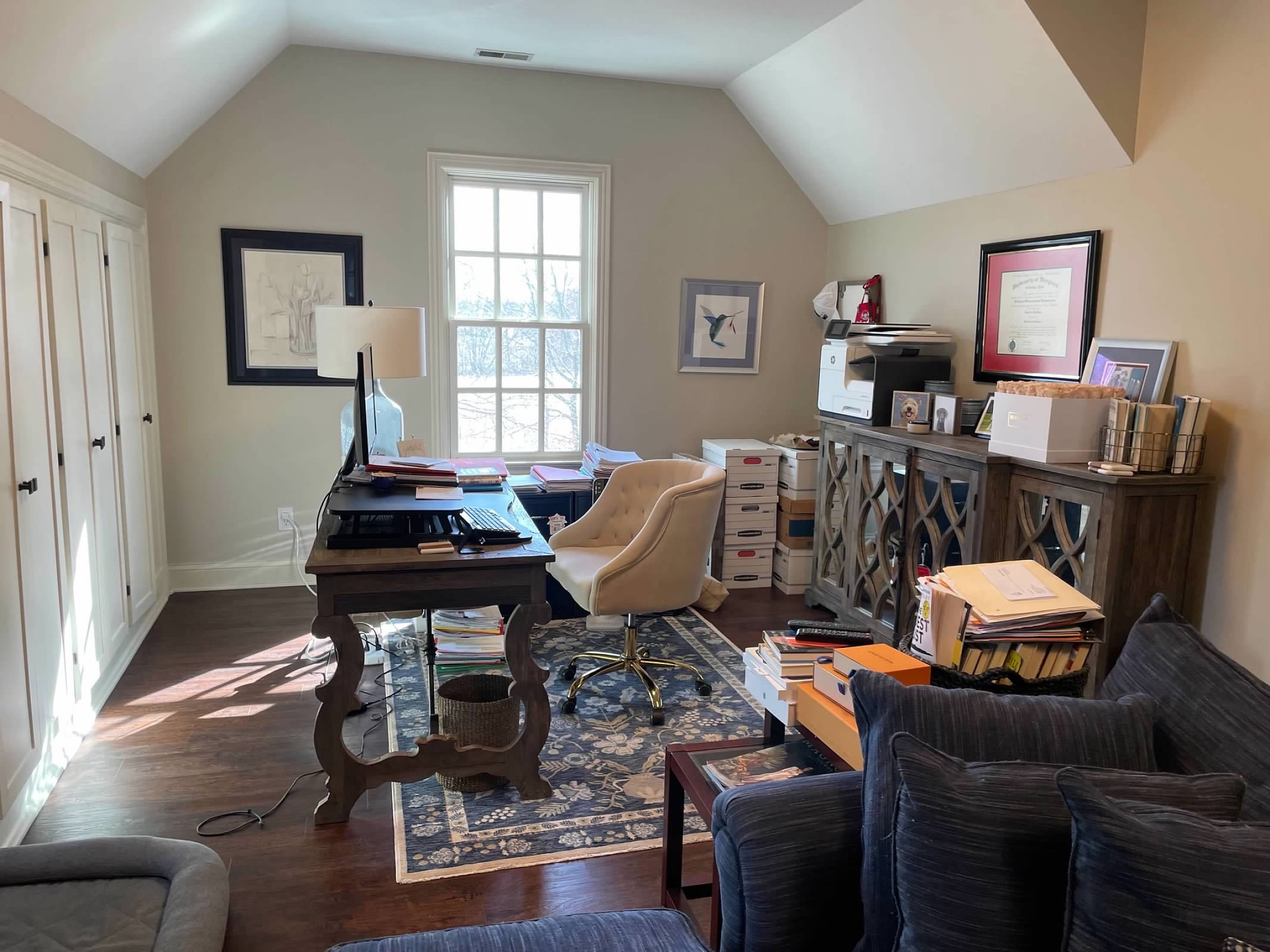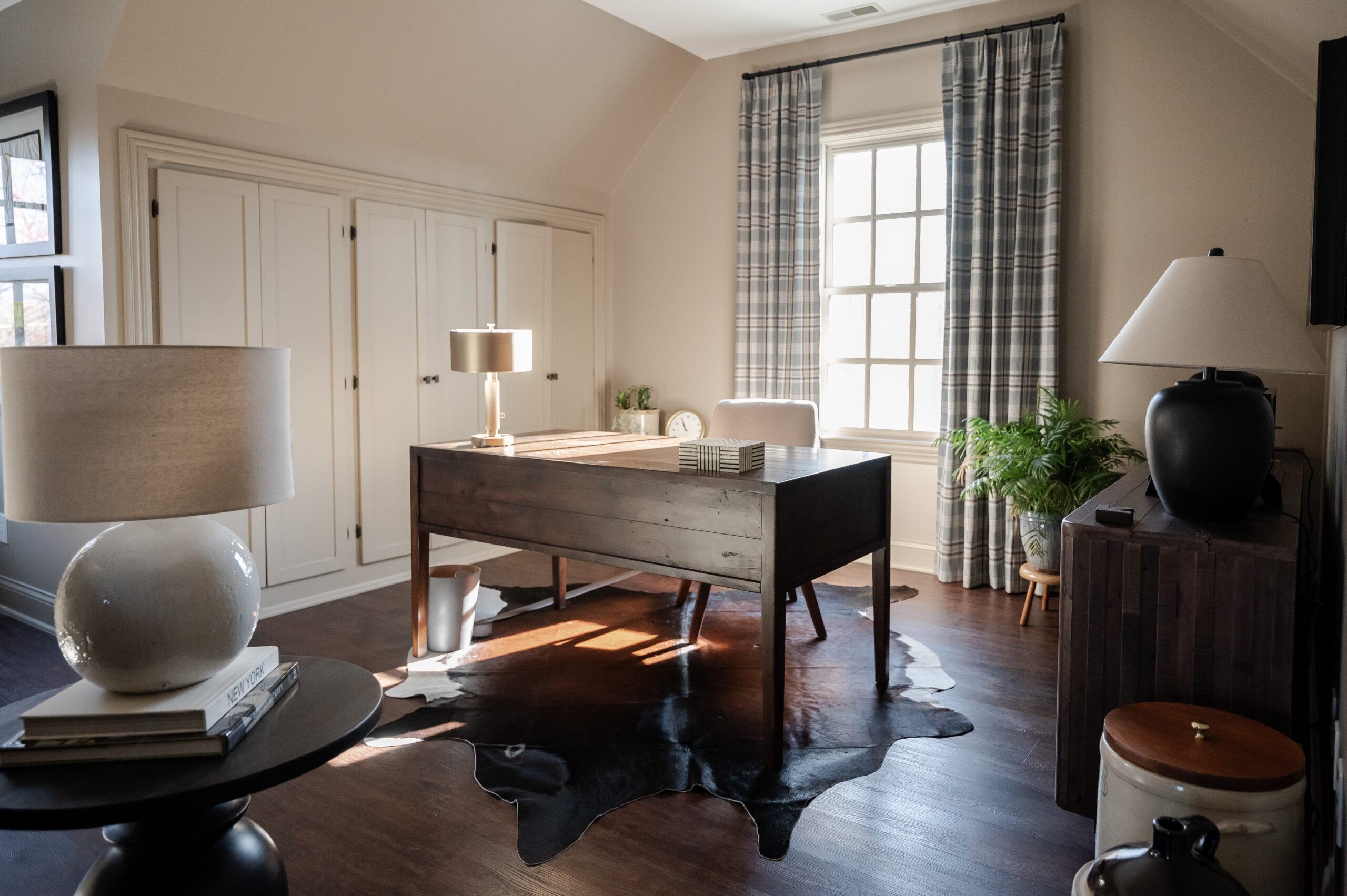 This bonus room loft got a serious upgrade and is now the perfect spot for “HIS” office space/man cave retreat on one side and a high functioning laundry room on the other. Separated by an oversized custom sliding wood door, the laundry room has all the things – from tuck away drying racks and sorted hampers and plenty of storage cabinets to the beautiful soapstone countertops and blackstone sink. Beth added a tile feature wall, tongue and groove ceiling and a statement light fixture. His office space offsets the room with all the handsome masculine touches. The leather sofa and comfy chairs complete the space. To personalize this space, Beth featured a flag collection of this golf-loving guy’s favorite courses.