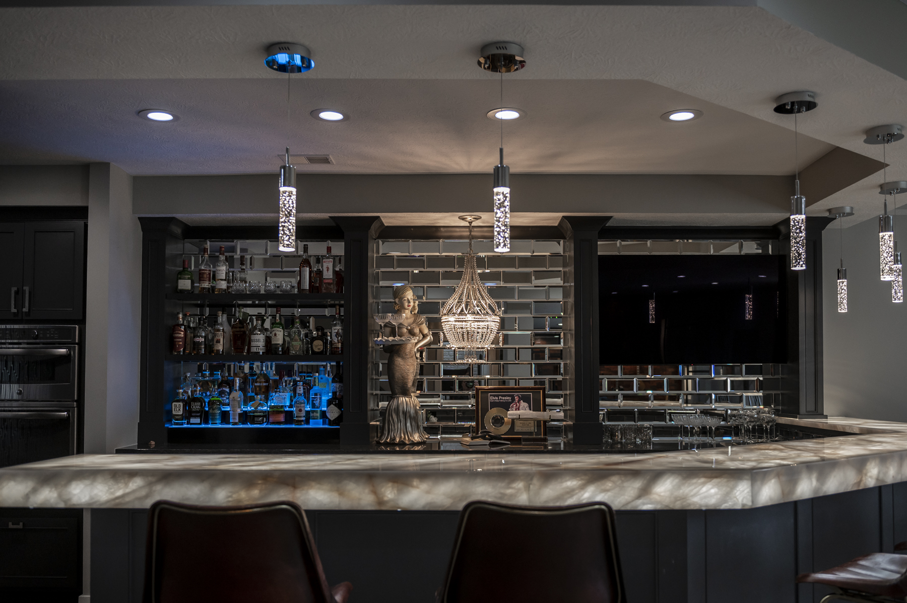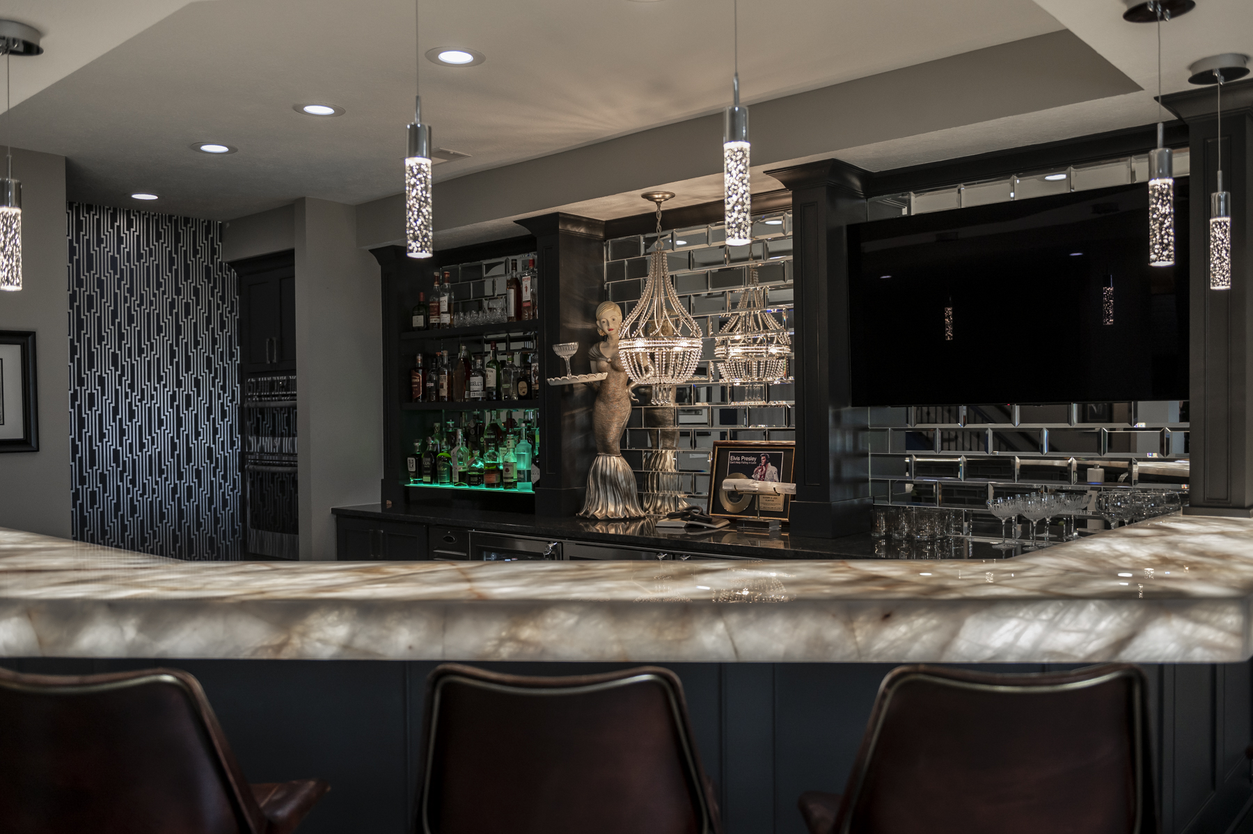 | From studs to stunning. Kellyann’s clients had completely gutted their large basement to create an entertainment oasis filled with all of their favorite things. Inspired by the Rat Pack and glamor of Las Vegas, she transformed the bar into a luxurious lounge, complete with a beveled mirror backsplash, Art Deco inspired chandelier and an illuminated quartzite countertop to add the perfect touch of swanky uniqueness.