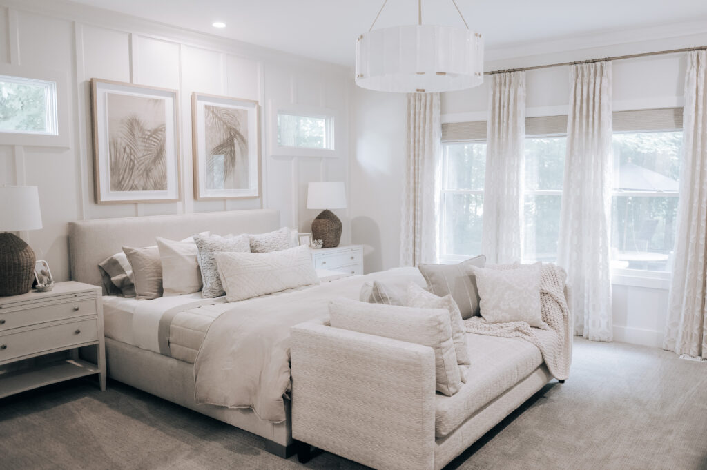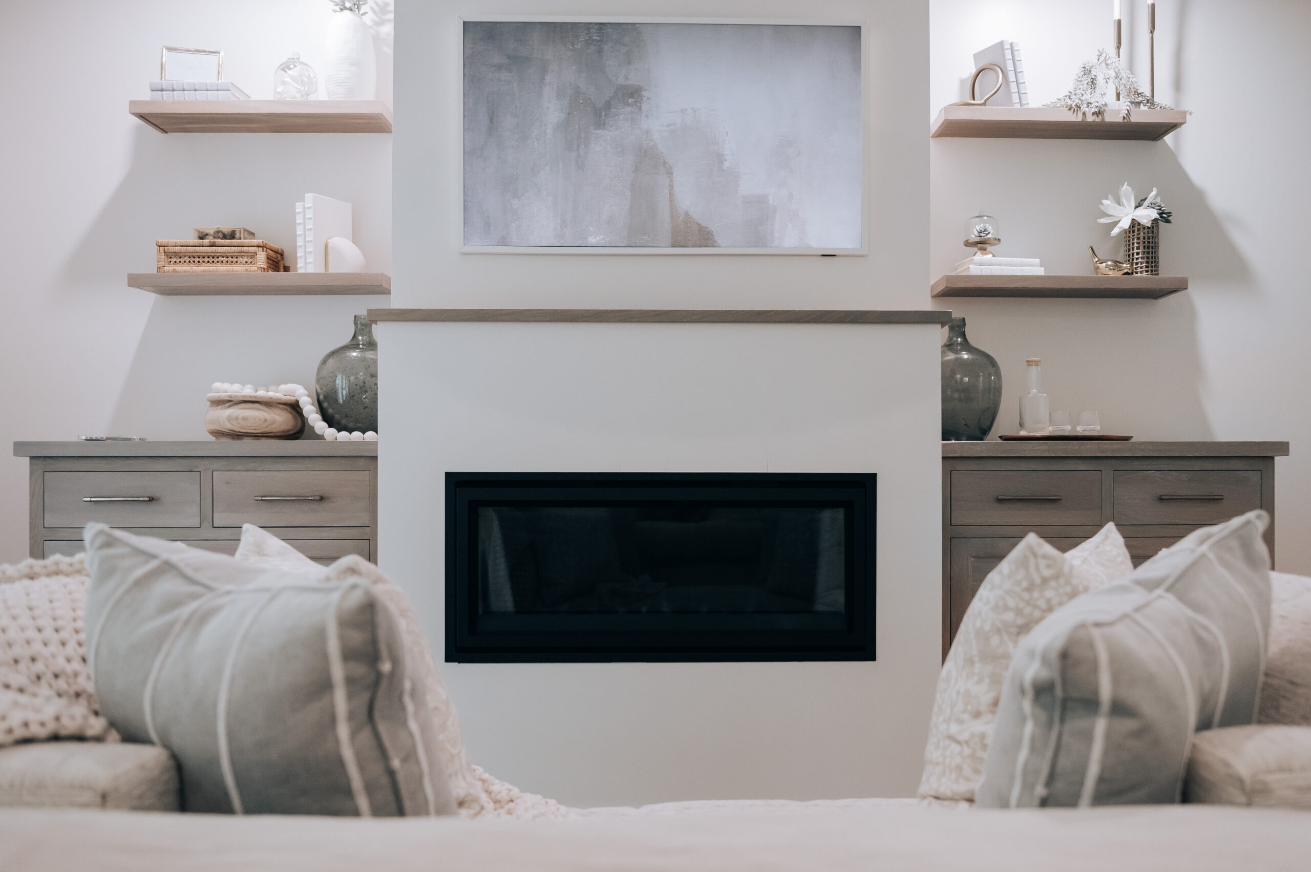Chesney carried the soft neutral tones from the client’s primary bathroom and walk-in closet into the primary bedroom to create a relaxing space. She added a gas fireplace flanked by custom dressers and floating shelves in white oak. The headboard wall was trimmed out for added visual interest and the room received plenty of new lighting, including both overhead and side lights. Chesney implemented layers of texture into the room with window treatments, a fabric bench, pillows, and bedding.