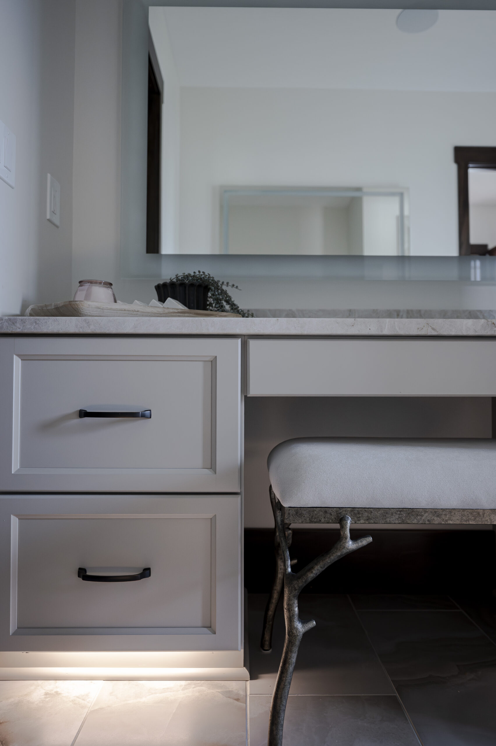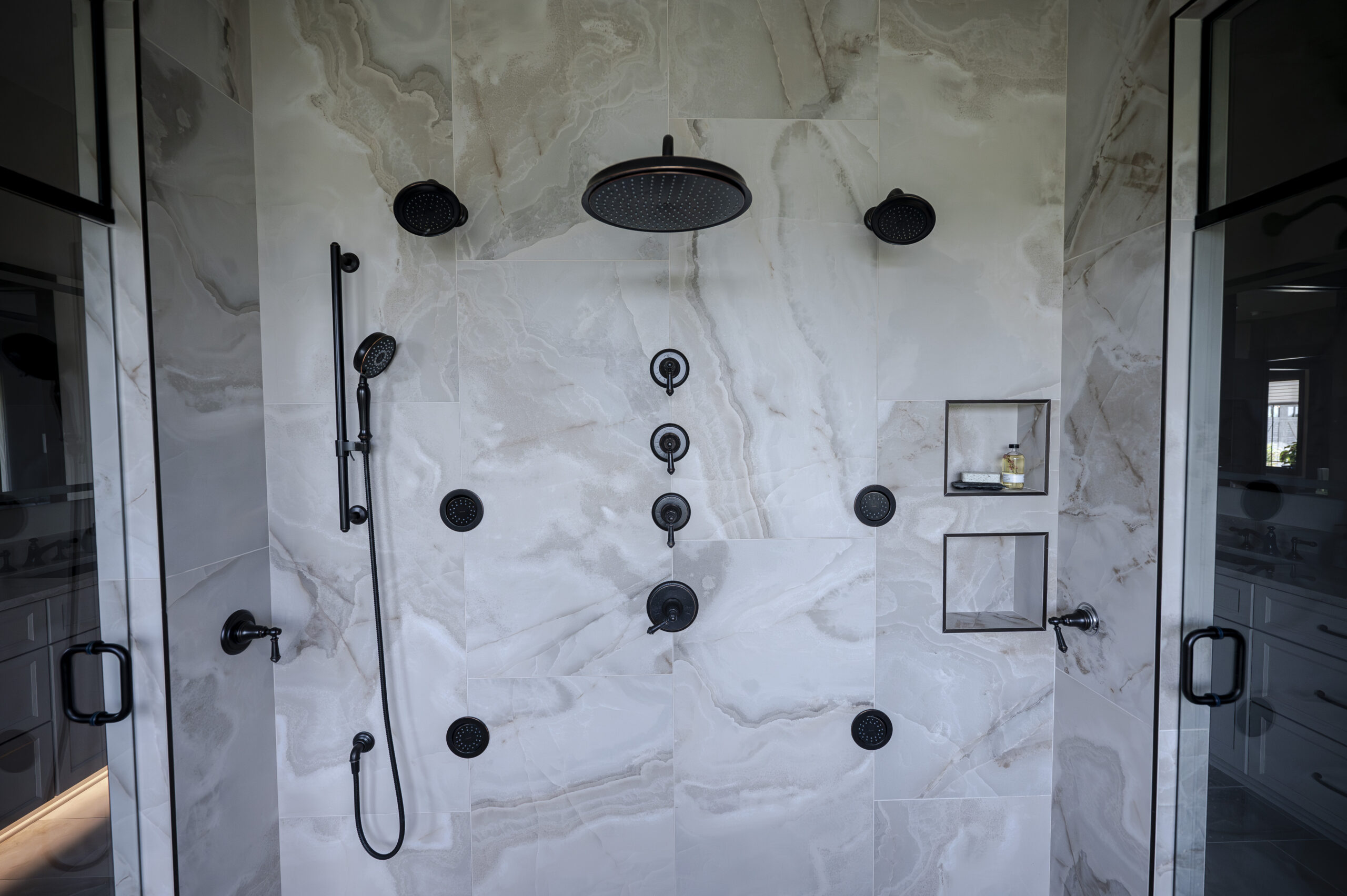 This primary bathroom is stunning in design highlighting a luxury wet room, his and her separate areas, sauna and expansive closet spaces. We used solid wood cabinets in a soft greige color along with natural stone for the vanity tops. Under cabinet lighting, smart mirrors and heated flooring add high end style and function. Stone looking sinks and soaking tub bring the outdoors in with a rustic spa feel. The wet room is a showcase on its own with the oversized stone tile, pebble flooring, gorgeous tub and alabaster chandelier. Serene and calming, this primary bathroom becomes the perfect place to relax and reflect.