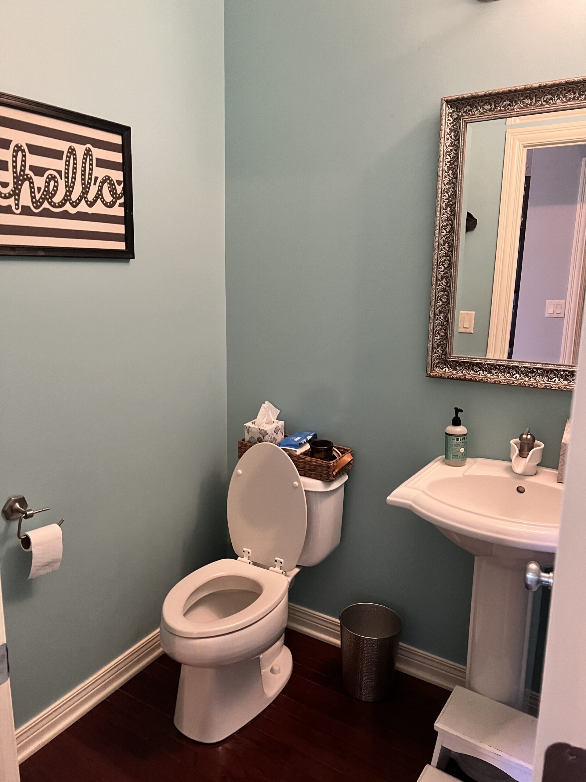 Chesney selected bold wallpaper for a statement in the powder bath with a new freestanding marble and gold vanity and wooden mirror. She also added board and batten walls for texture and interest.