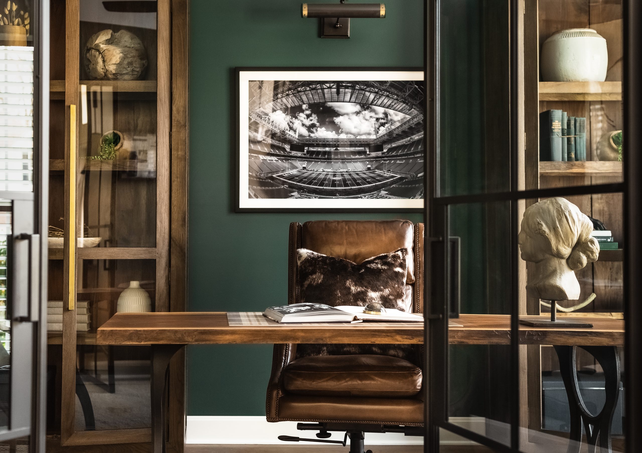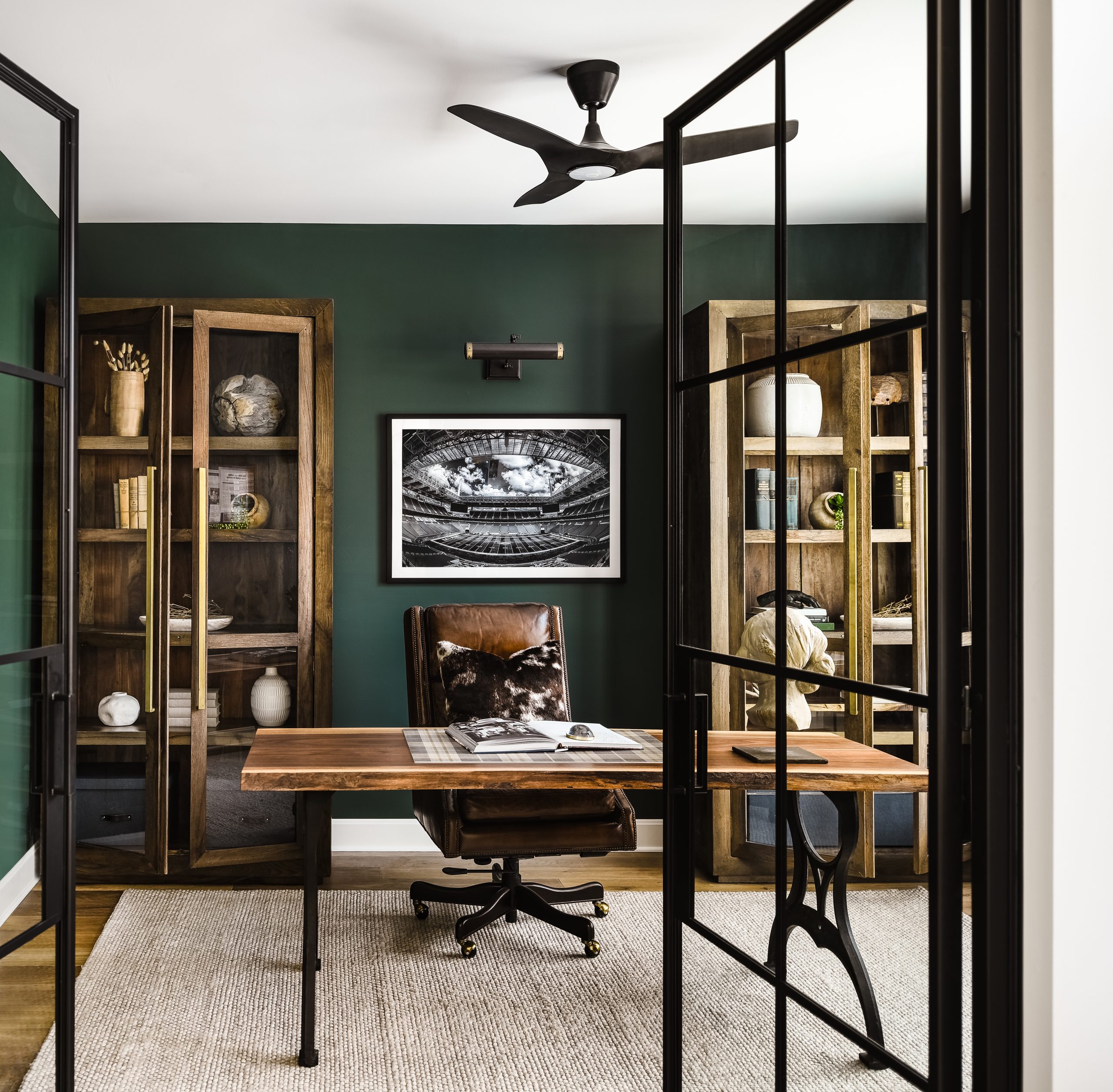 The purpose was to transform an unused dining space into a home office, focusing on masculine, bold, and moody design elements. The space is organic and modern with industrial touches. We began by installing custom metal and French glass doors to close the room. Then we painted the walls a deep green and implemented warm wood and brass accents throughout the space. In the end, wood flooring and modern lighting created a home office worth showing off.