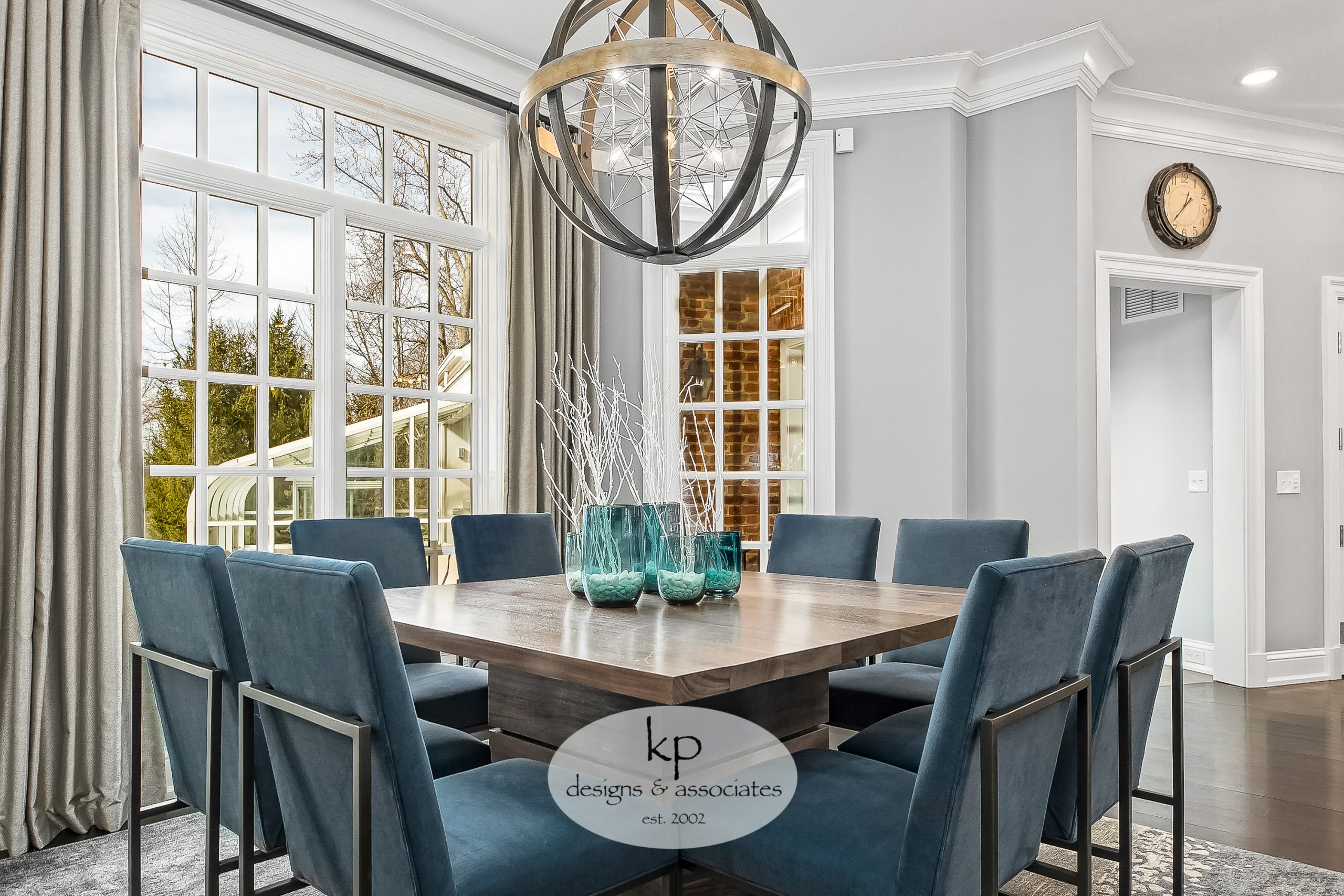 The client purchased a traditional home and wanted to update the space to be more modern. Inspired by clean lines, blues, and grays, the client was thrilled with fresh paint, refinished floors, and new furniture. We worked closely with the client to design a dining table they built to entertain family and friends. The final touches of new lighting and window treatments brought the room together.