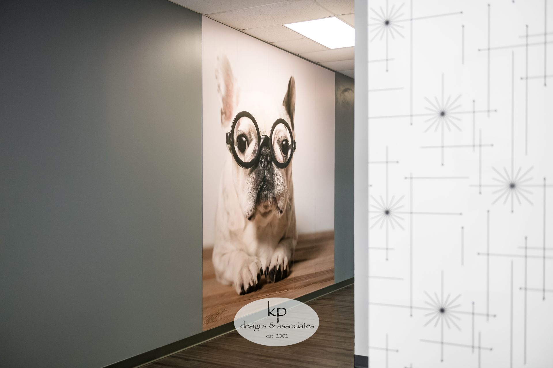 The client wanted a quirky, fun office space centered on a modern design aesthetic. We started by updating the flooring, paint, and furnishings. Next, we chose a modern reception desk and modernized each exam room. Then we added whimsy by incorporating starburst wallpaper, murals, and eyeglasses artwork. It was a delight to step outside our regular residential work into the commercial space.