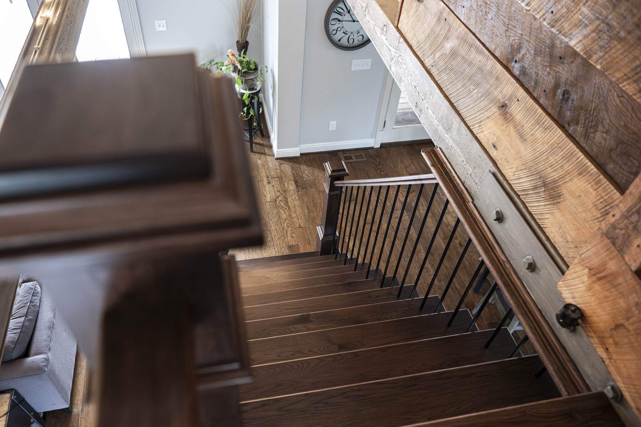 The stairs were updated with a more modern black iron spindle and treads to match the hickory flooring. They feel much more current and spacious.